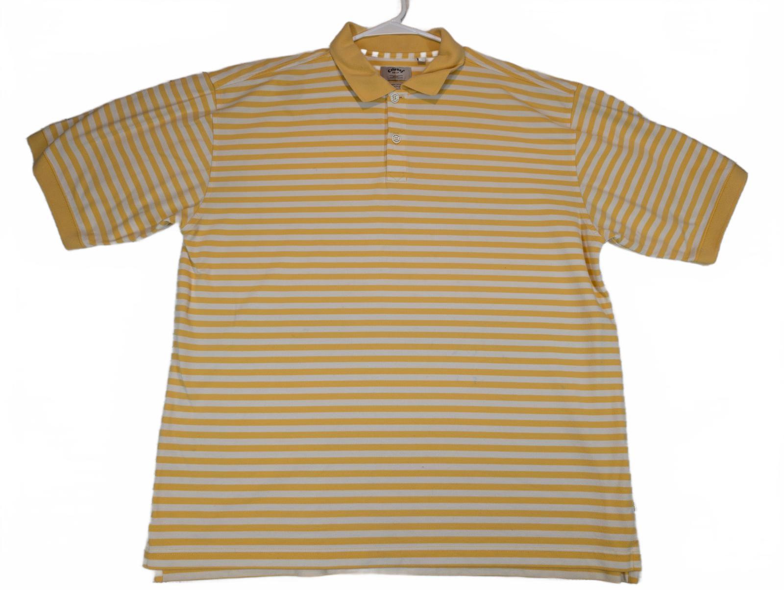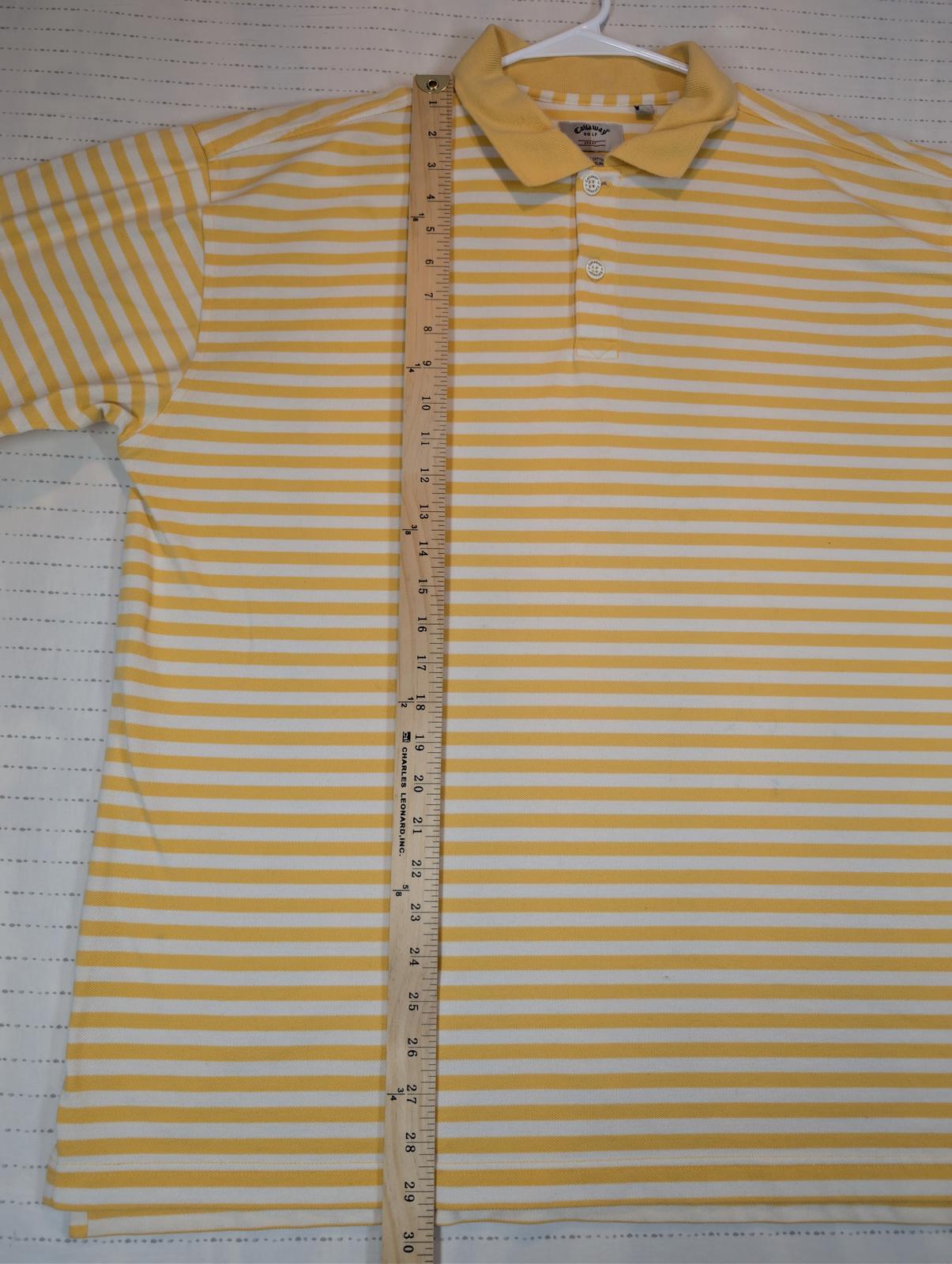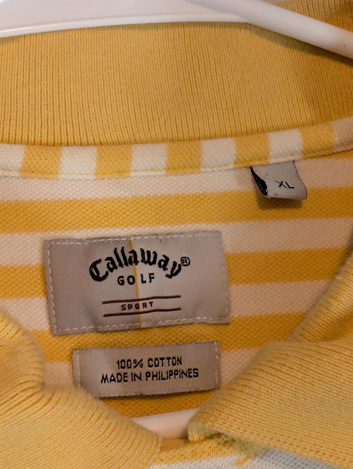 This Callaway Golf Sport polo shirt features a classic yellow and white horizontal stripe pattern with a soft cotton knit feel. Designed with a traditional collar and two-button placket, it offers a comfortable fit ideal for golf, casual wear, or warm-weather outfits. The lightweight construction allows for easy movement and breathability on or off the course. A clean, versatile Callaway polo that pairs well with shorts, slacks, or denim. Please review all photos for condition and measurements.