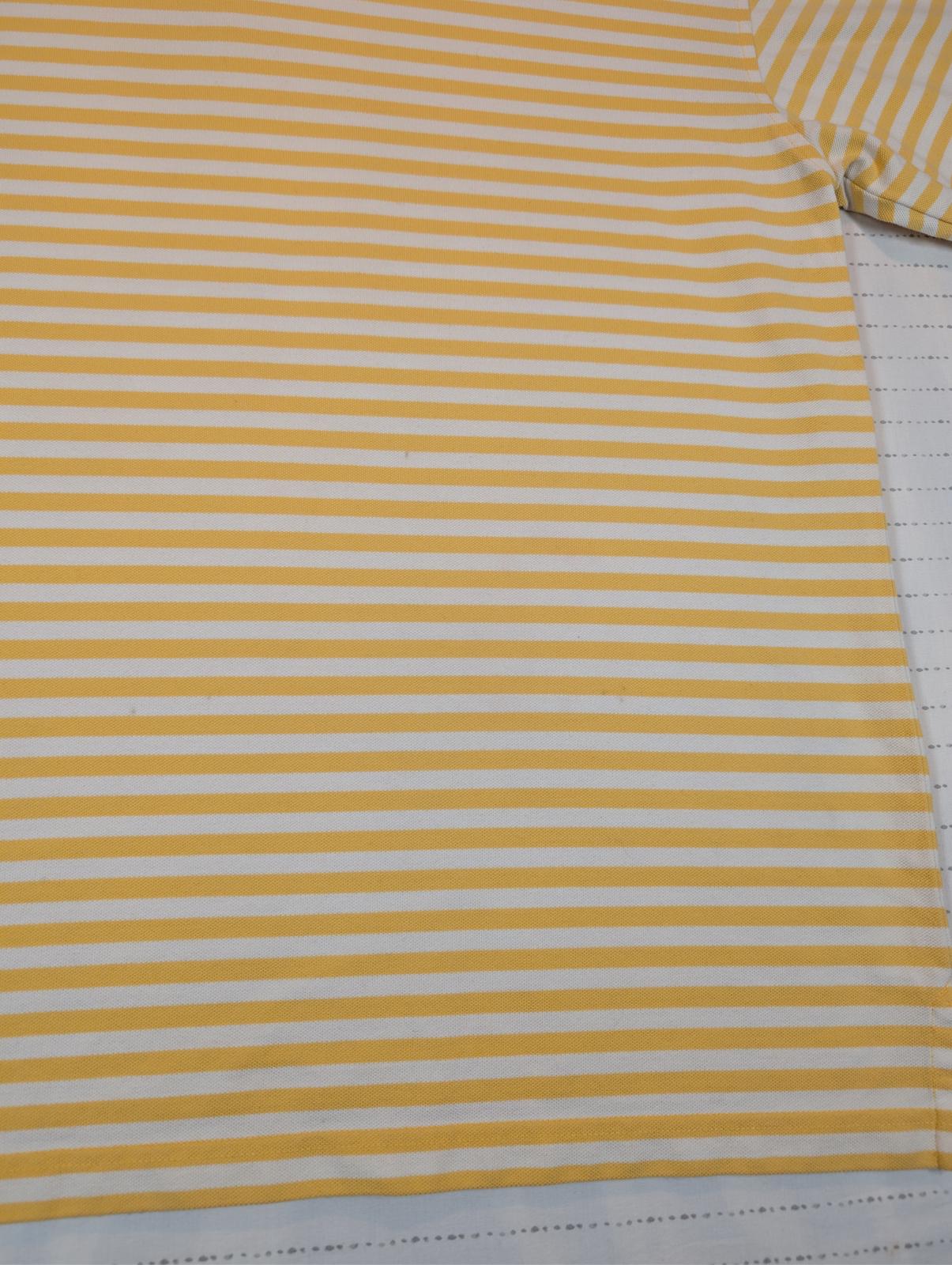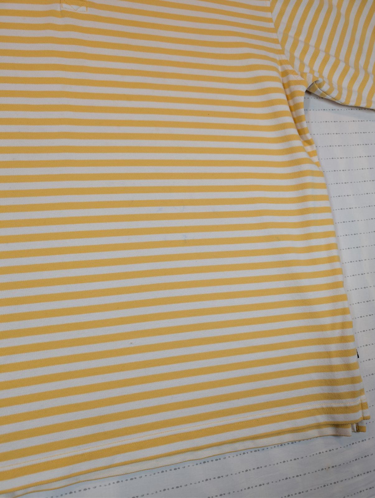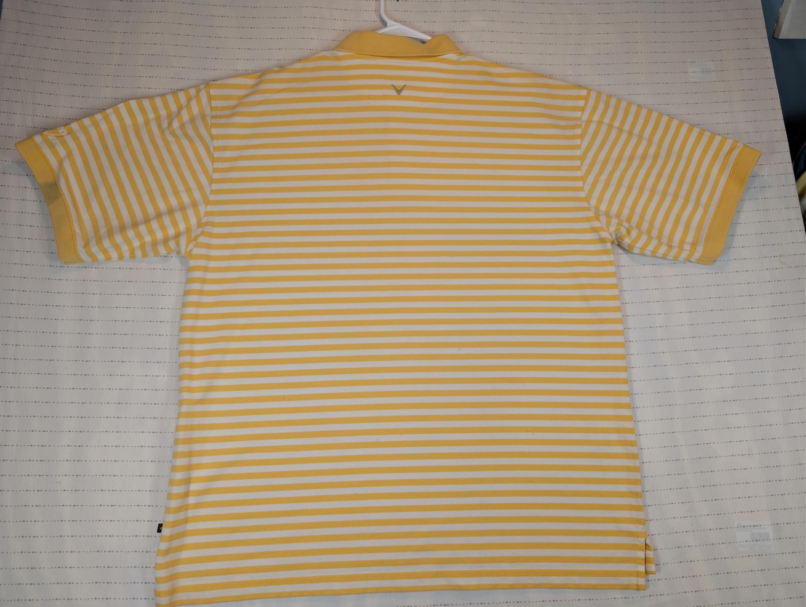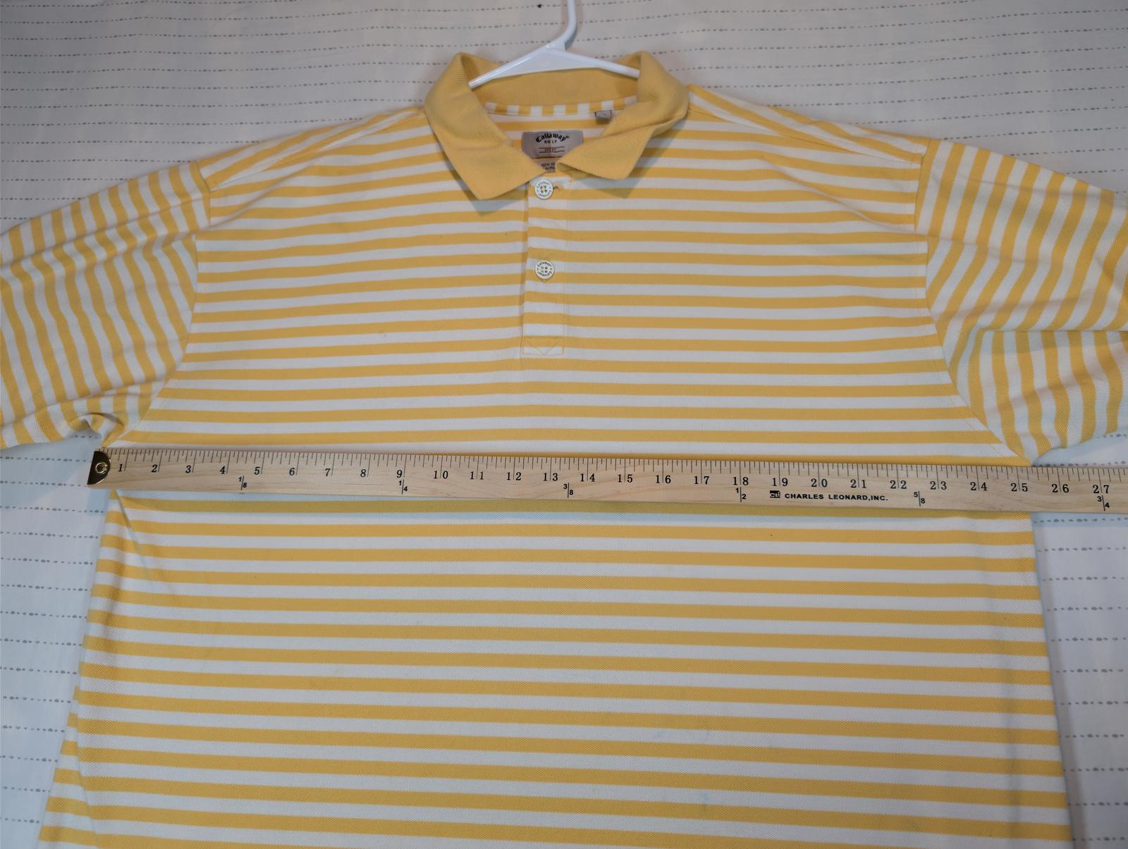 This Callaway Golf Sport polo shirt features a classic yellow and white horizontal stripe pattern with a soft cotton knit feel. Designed with a traditional collar and two-button placket, it offers a comfortable fit ideal for golf, casual wear, or warm-weather outfits. The lightweight construction allows for easy movement and breathability on or off the course. A clean, versatile Callaway polo that pairs well with shorts, slacks, or denim. Please review all photos for condition and measurements.