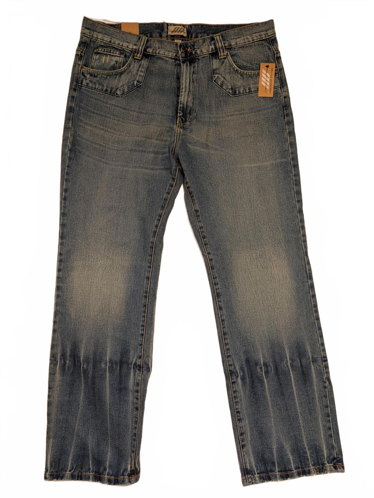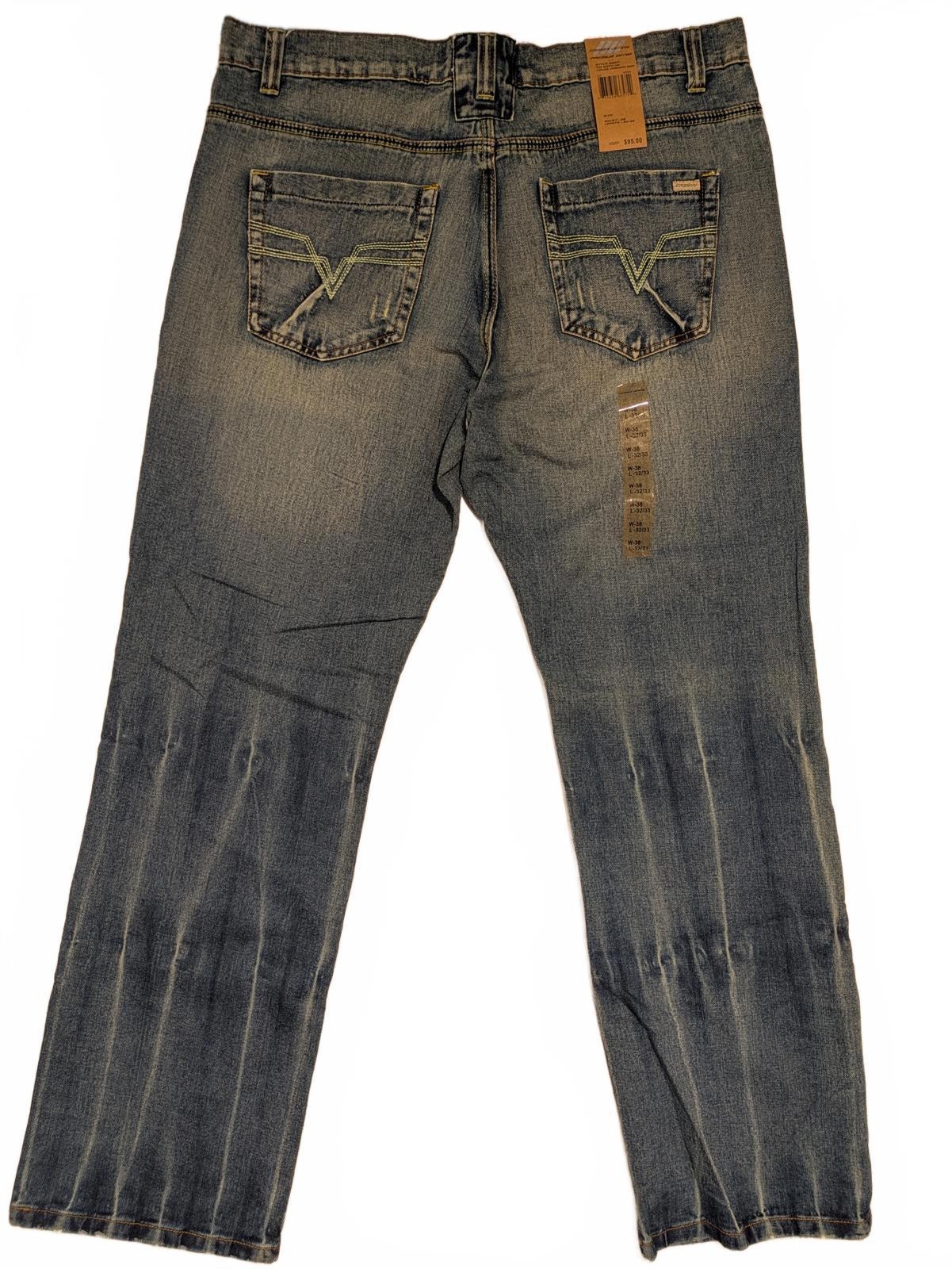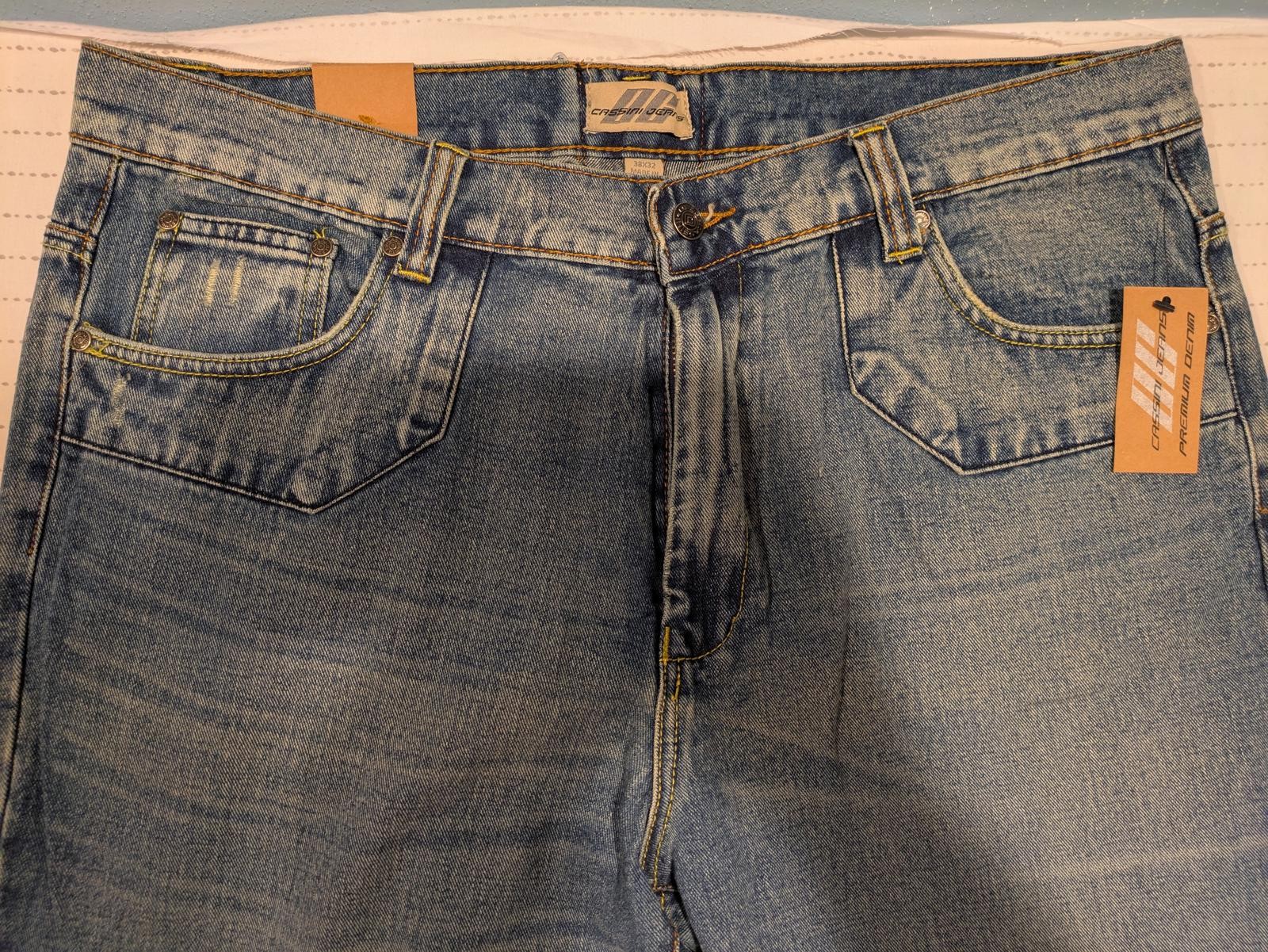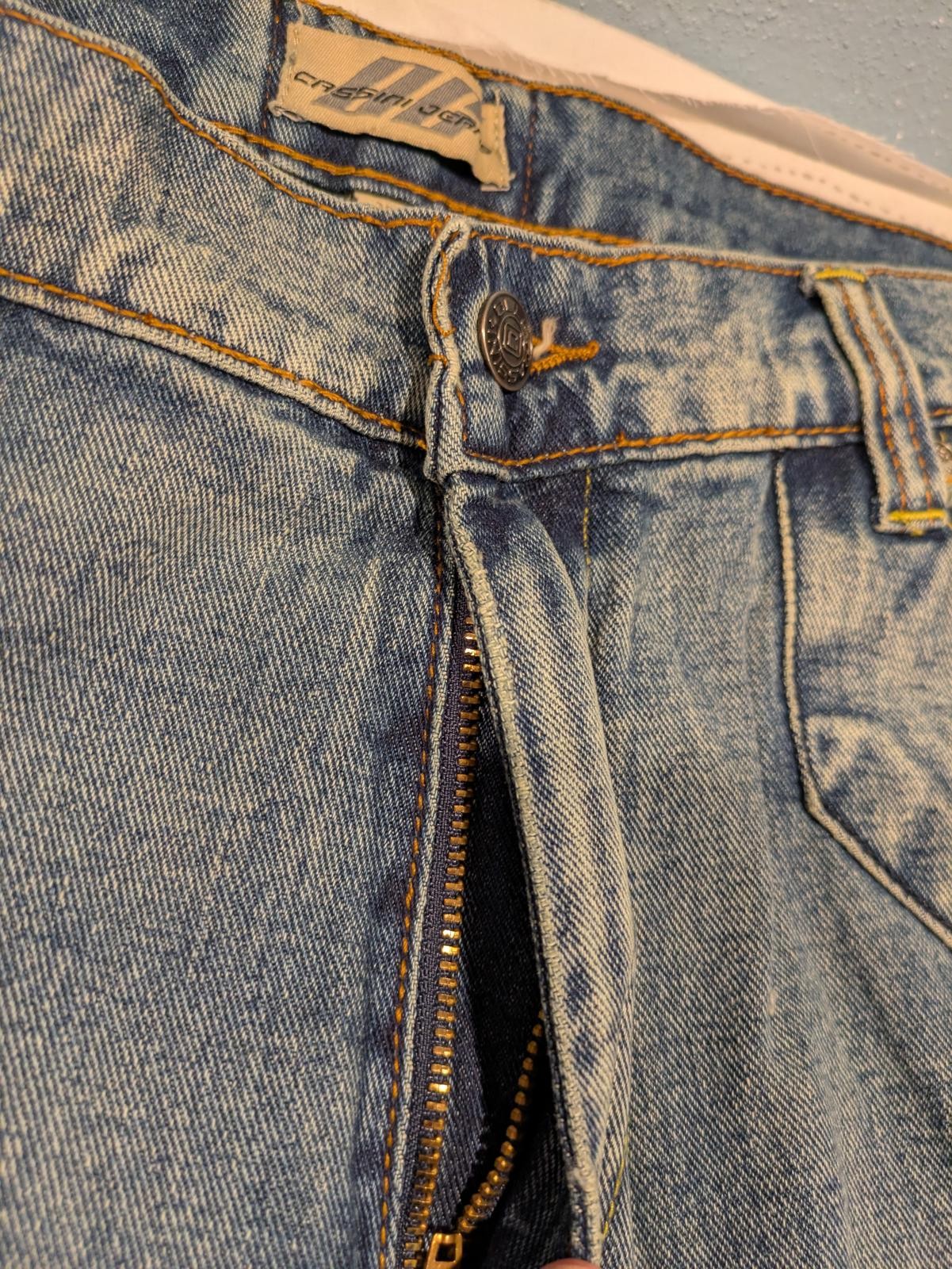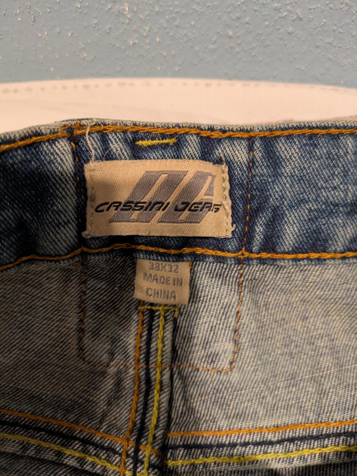Vintage-inspired Cassini Gear Premium Denim jeans in Crosshatch Wash. These jeans are new with tags and offer a classic early 2000s look with a medium blue distressed wash, yellow and green contrast stitching, and stylized V embroidery on the back pockets. They feature a straight leg cut with a zip fly, copper-tone rivets, and durable double-stitched seams. The denim has a sturdy, slightly rigid feel typical of Y2K styles. Ideal for fans of retro or Y2K fashion, these jeans provide both style and structure.
