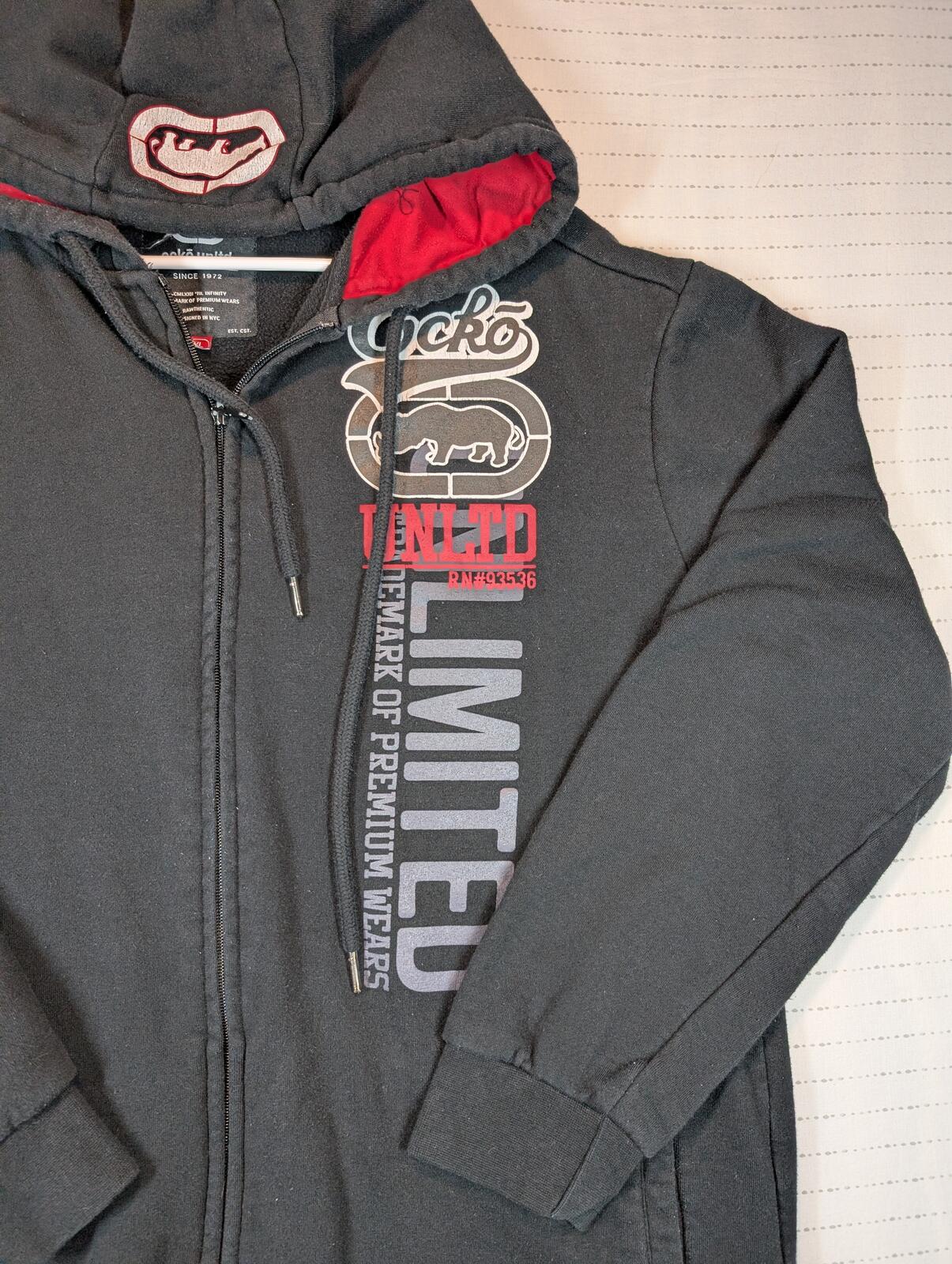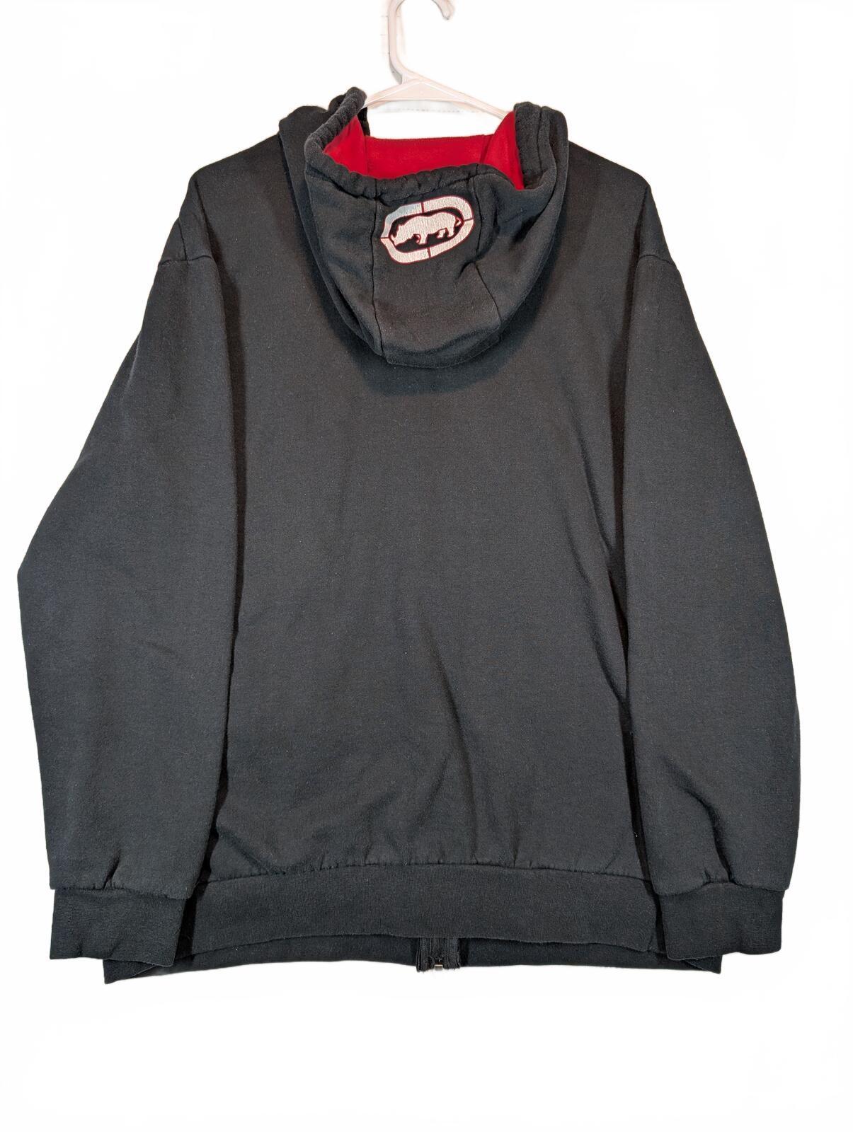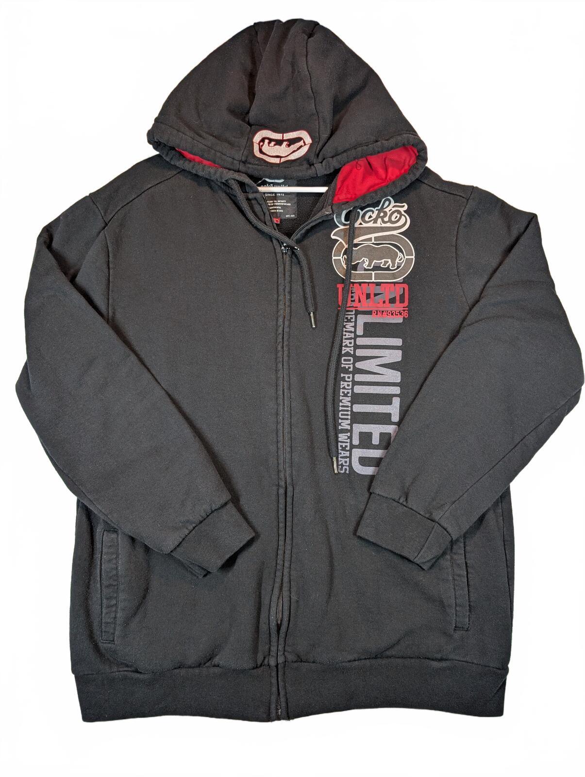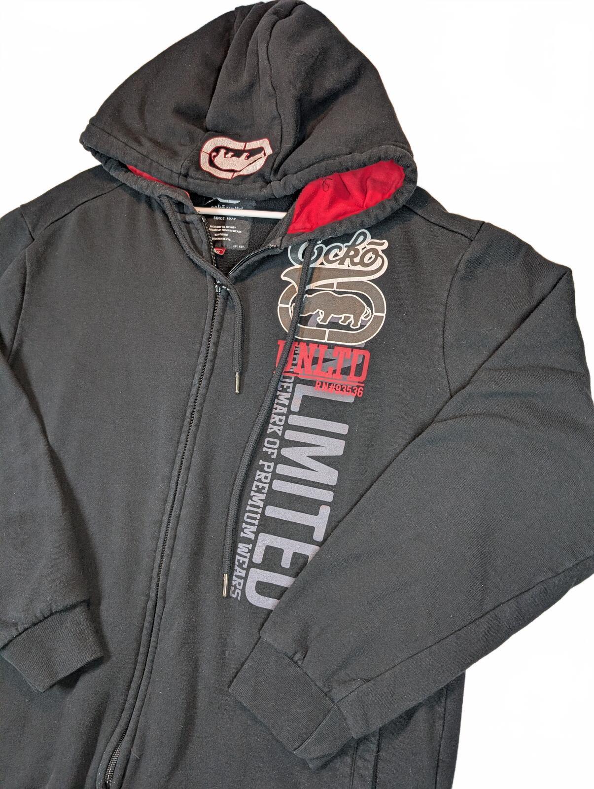 This is an Ecko Unltd full zip hoodie with fleece lining and bold front logo graphics, tagged XL. Black streetwear staple with red hood lining and light graphic cracking visible on the hood logo.