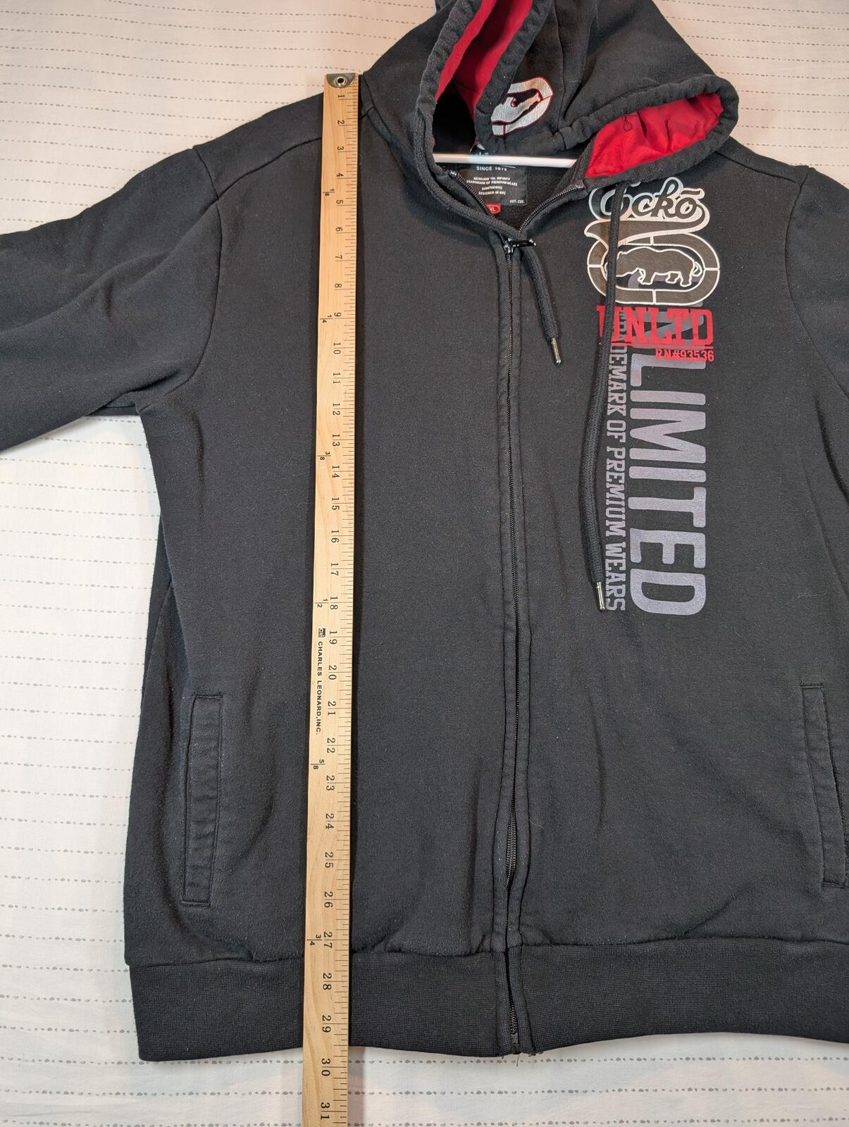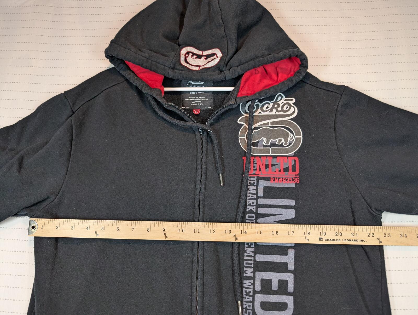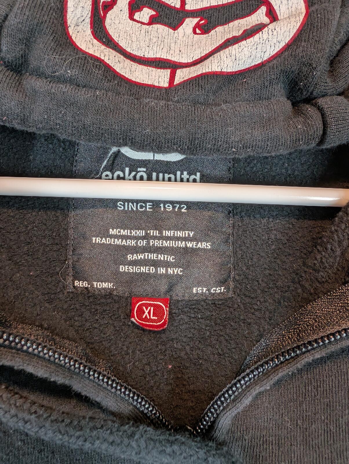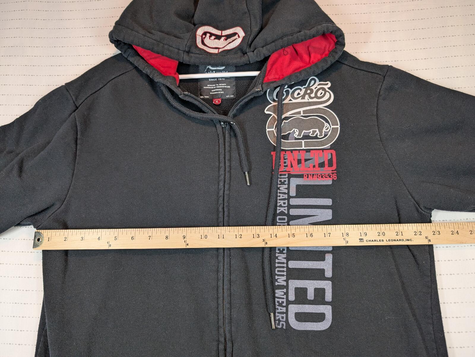 This is an Ecko Unltd full zip hoodie with fleece lining and bold front logo graphics, tagged XL. Black streetwear staple with red hood lining and light graphic cracking visible on the hood logo.