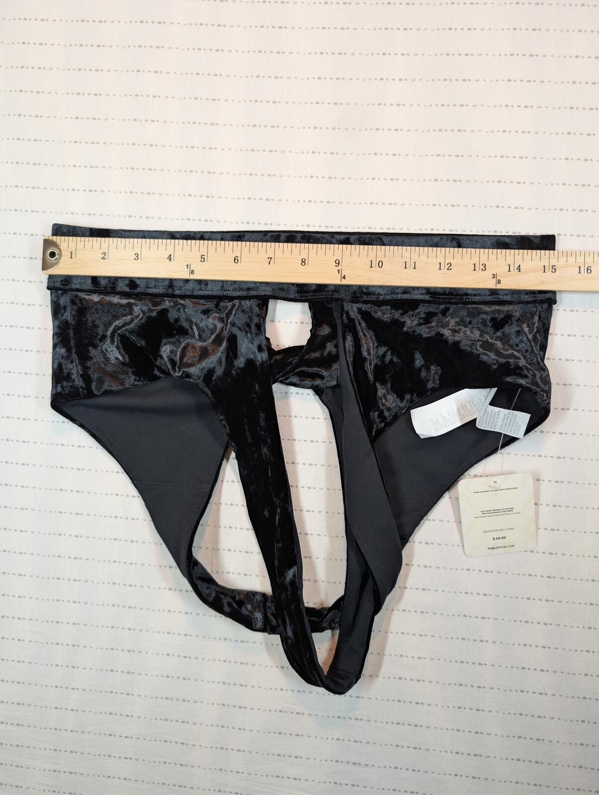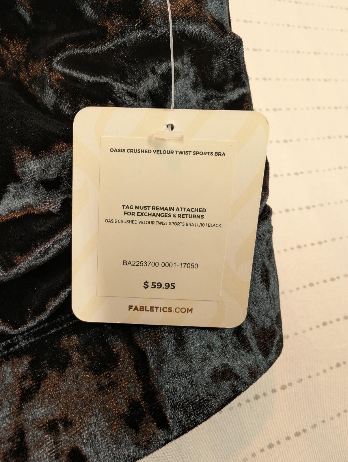 This is a Fabletics Oasis Crushed Velour Twist sports bra in black with a soft velour finish and twist front straps. New With Tags, size large, with a yoga, training, and athleisure look. Style BA2253700-0001-17050.
