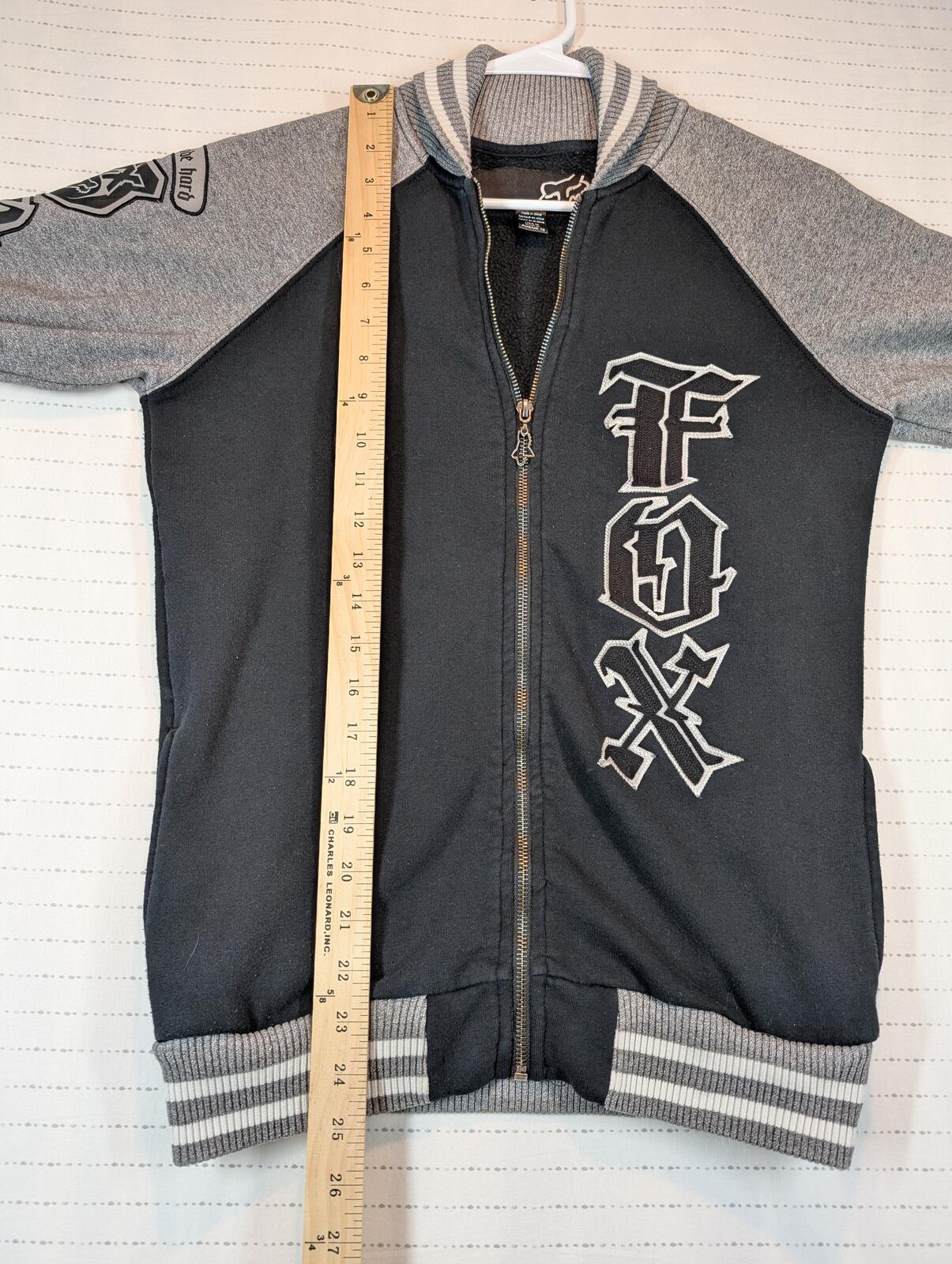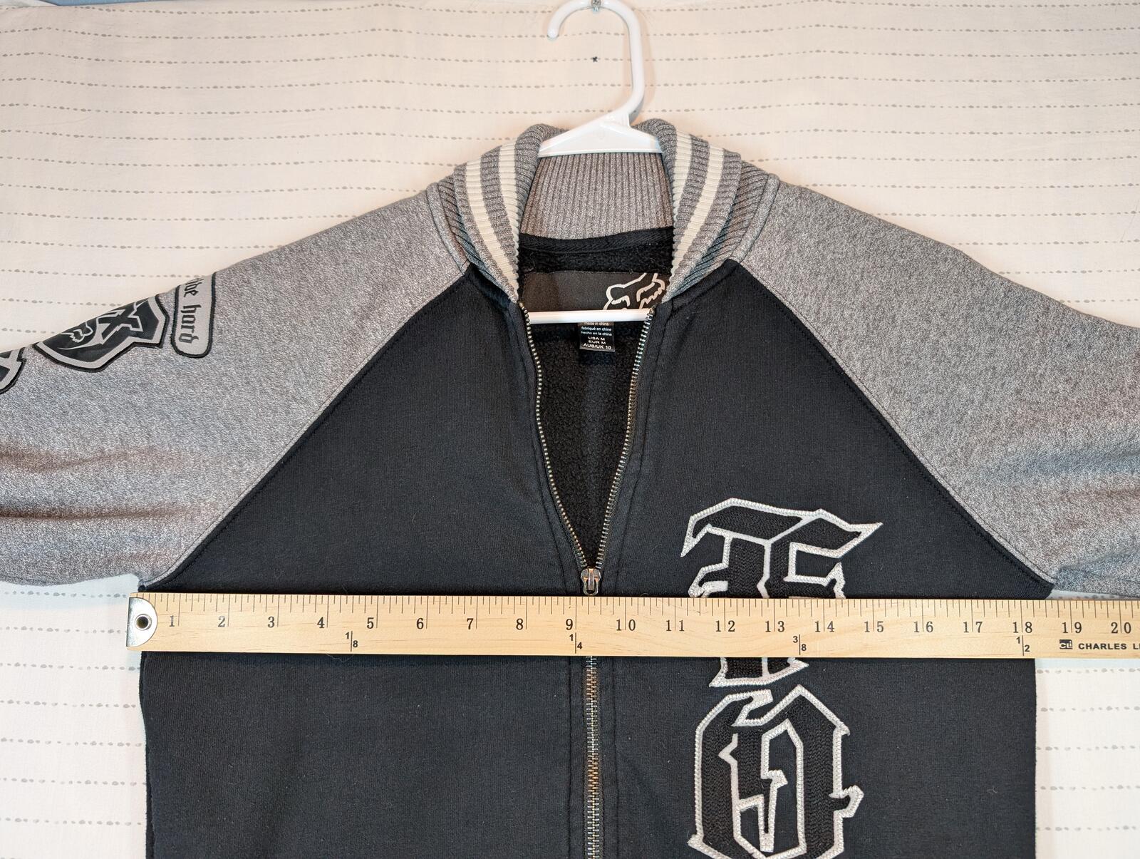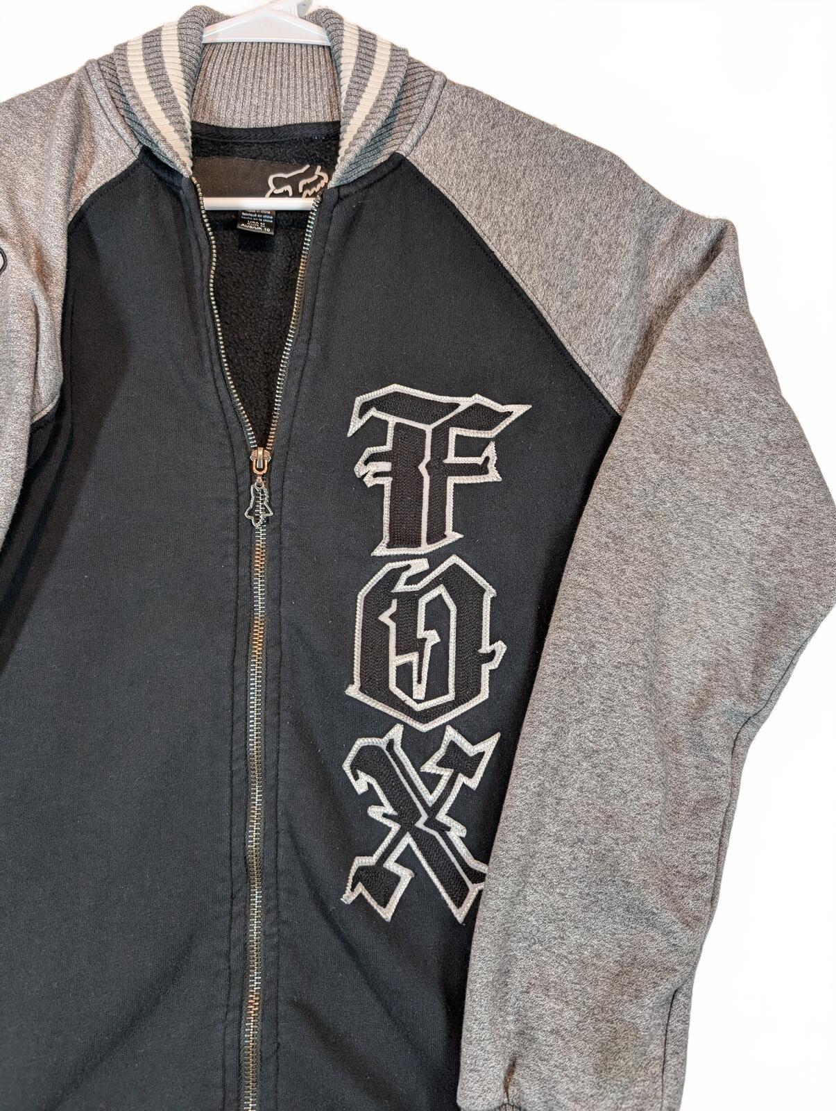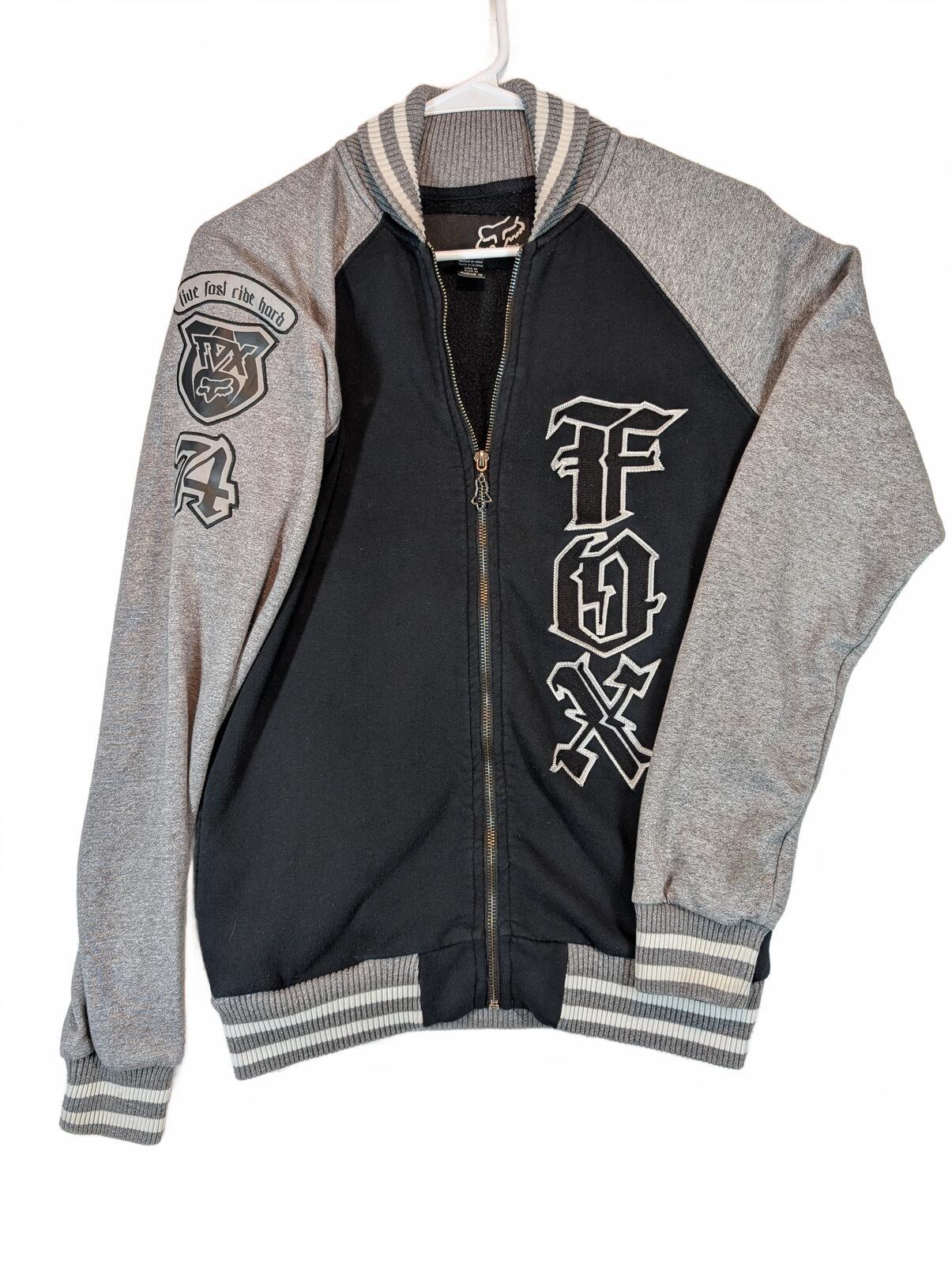 This is a Fox Racing full zip bomber jacket with fleece lining, raglan sleeves, and varsity logo graphics. Warm moto streetwear piece in black and heather gray with rib knit trim.