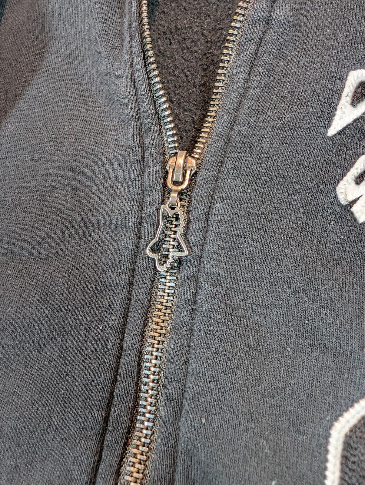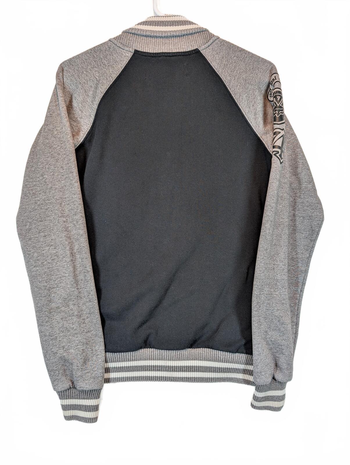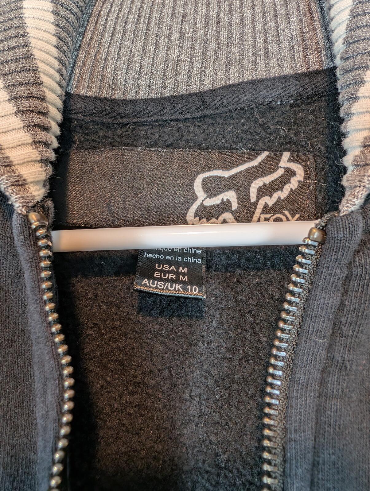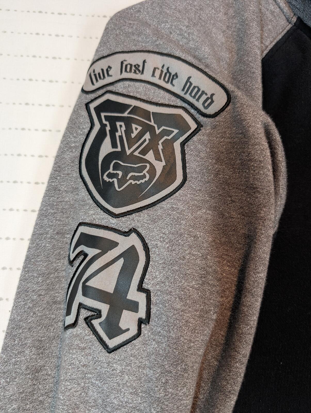 This is a Fox Racing full zip bomber jacket with fleece lining, raglan sleeves, and varsity logo graphics. Warm moto streetwear piece in black and heather gray with rib knit trim.