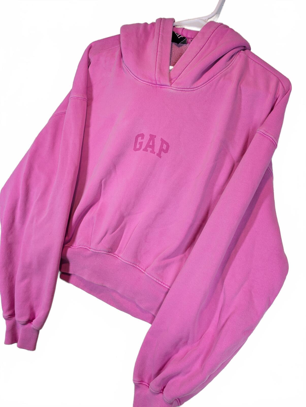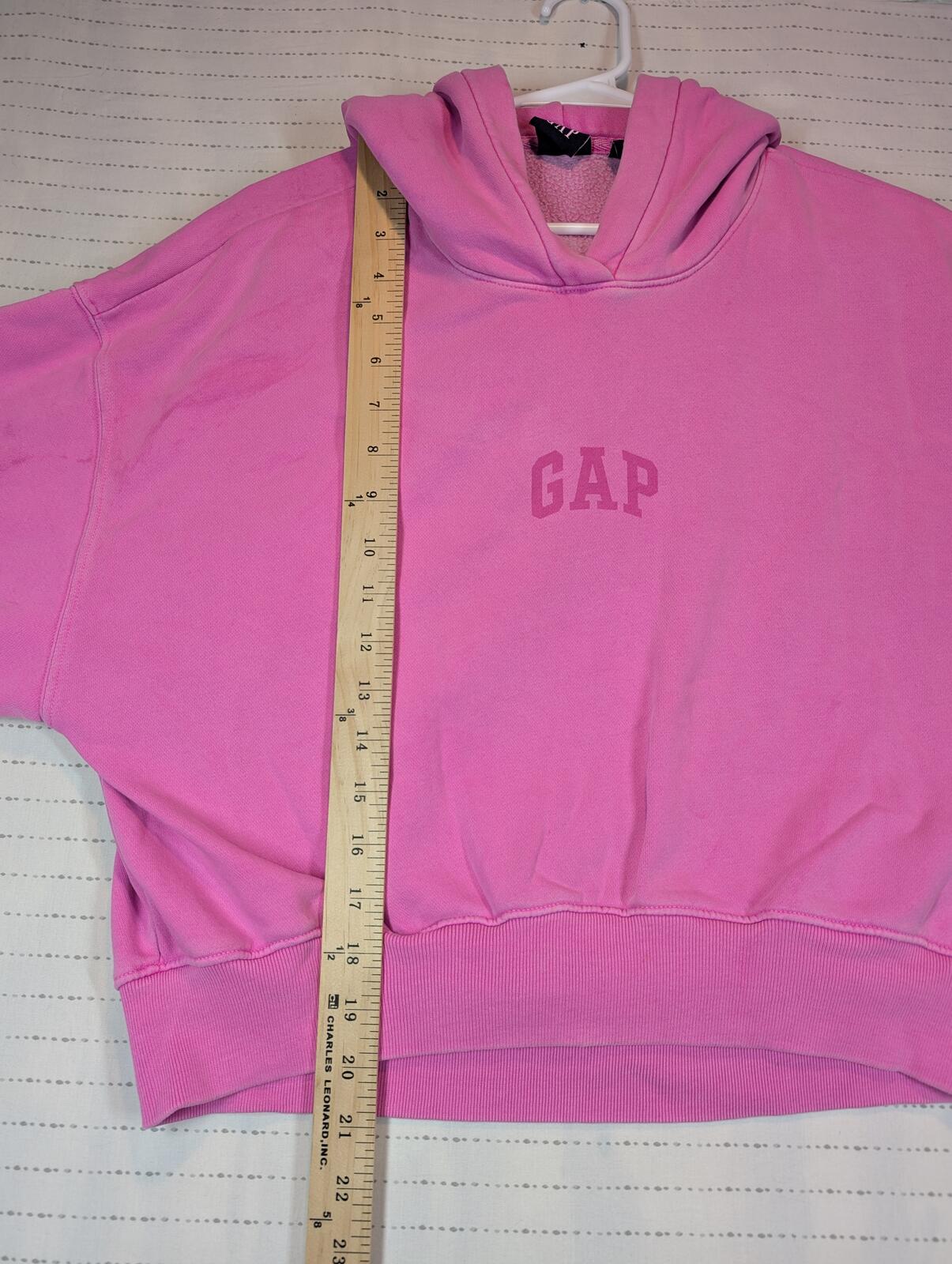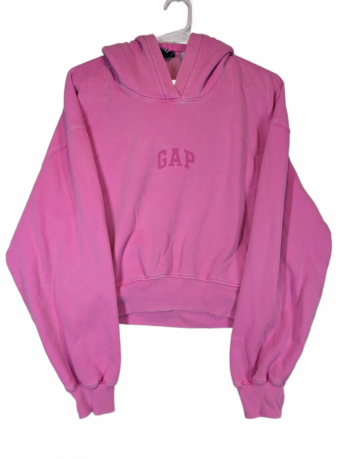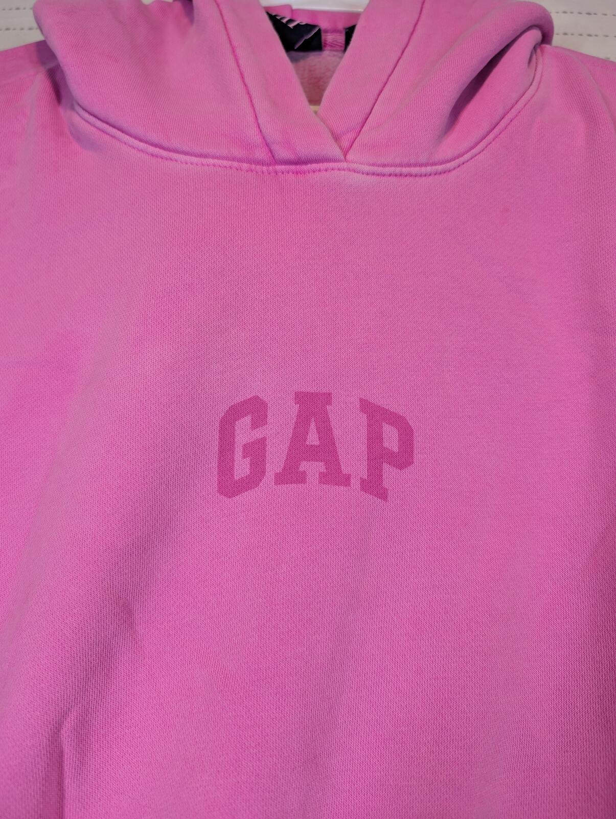 This is a Gap pullover hoodie in pink with tonal logo detail at the chest and large back spellout. Fleece-lined cropped sweatshirt in women’s XS with a casual lounge and streetwear look, showing light wear from use.
