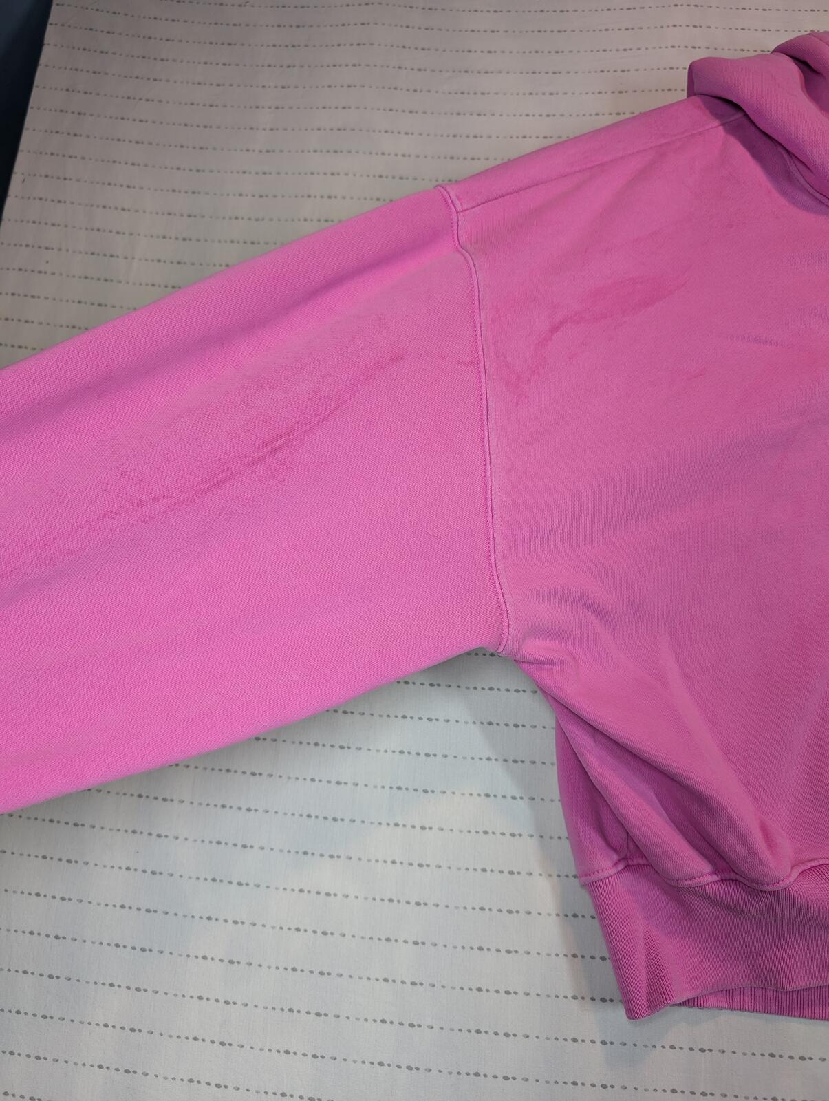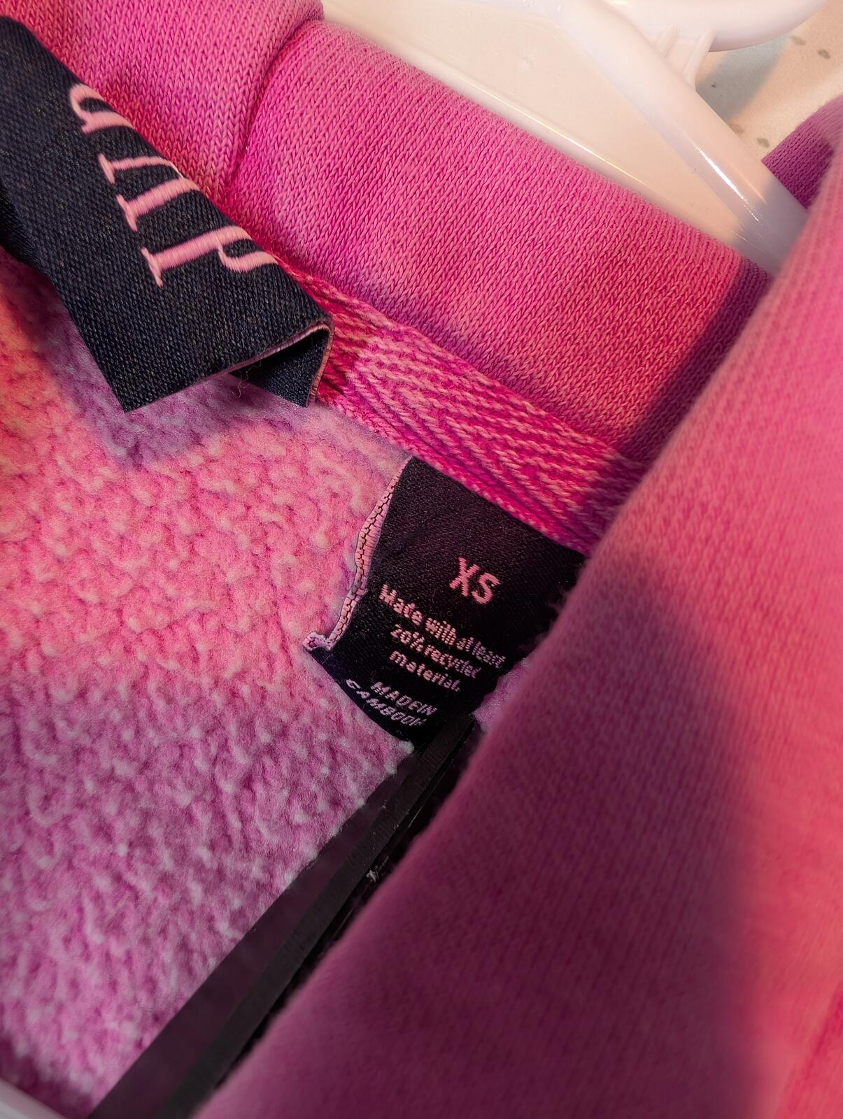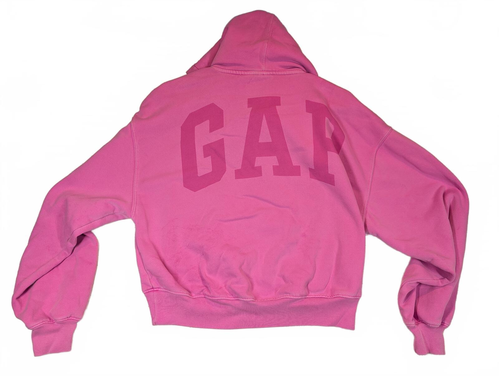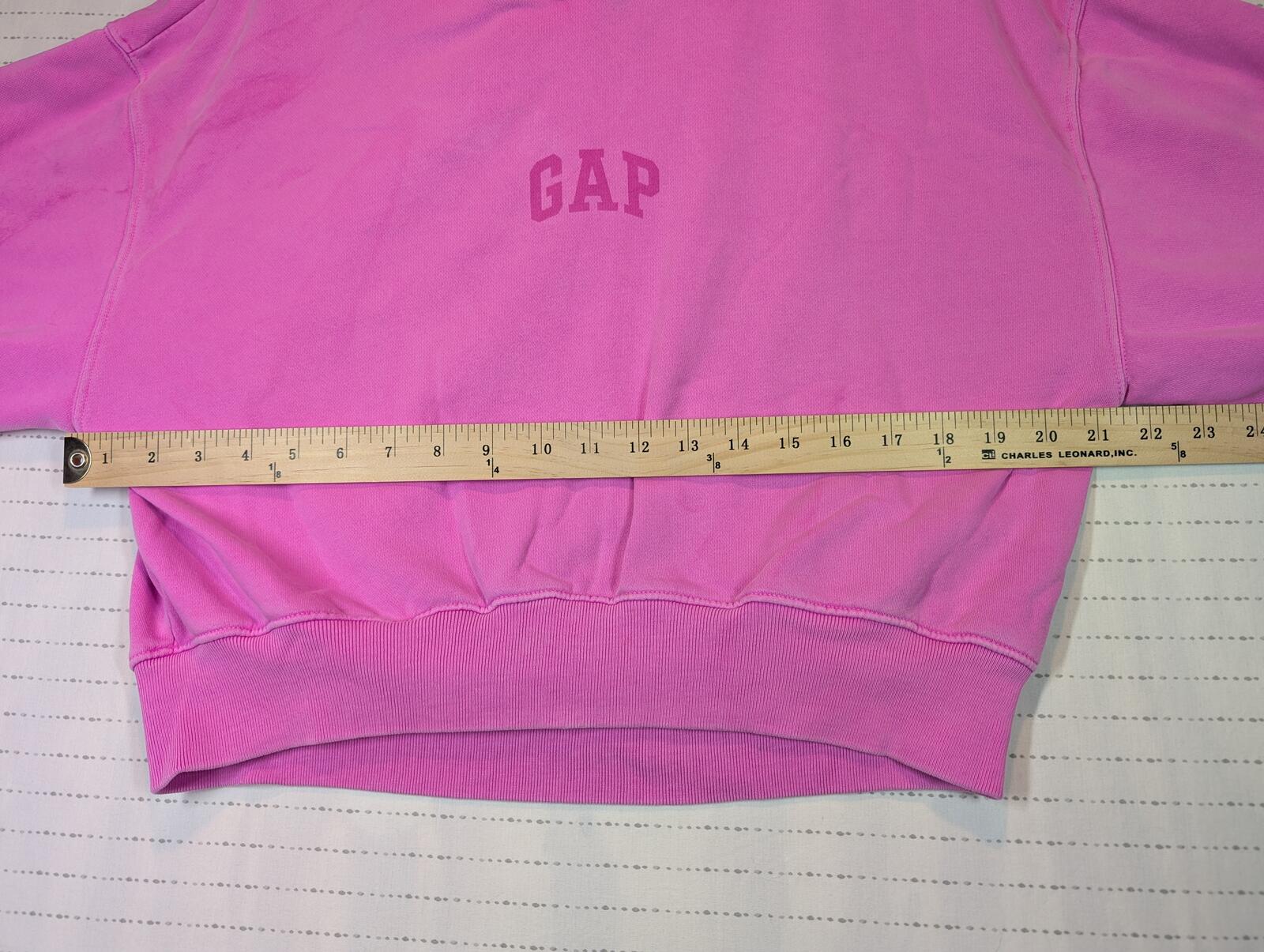 This is a Gap pullover hoodie in pink with tonal logo detail at the chest and large back spellout. Fleece-lined cropped sweatshirt in women’s XS with a casual lounge and streetwear look, showing light wear from use.