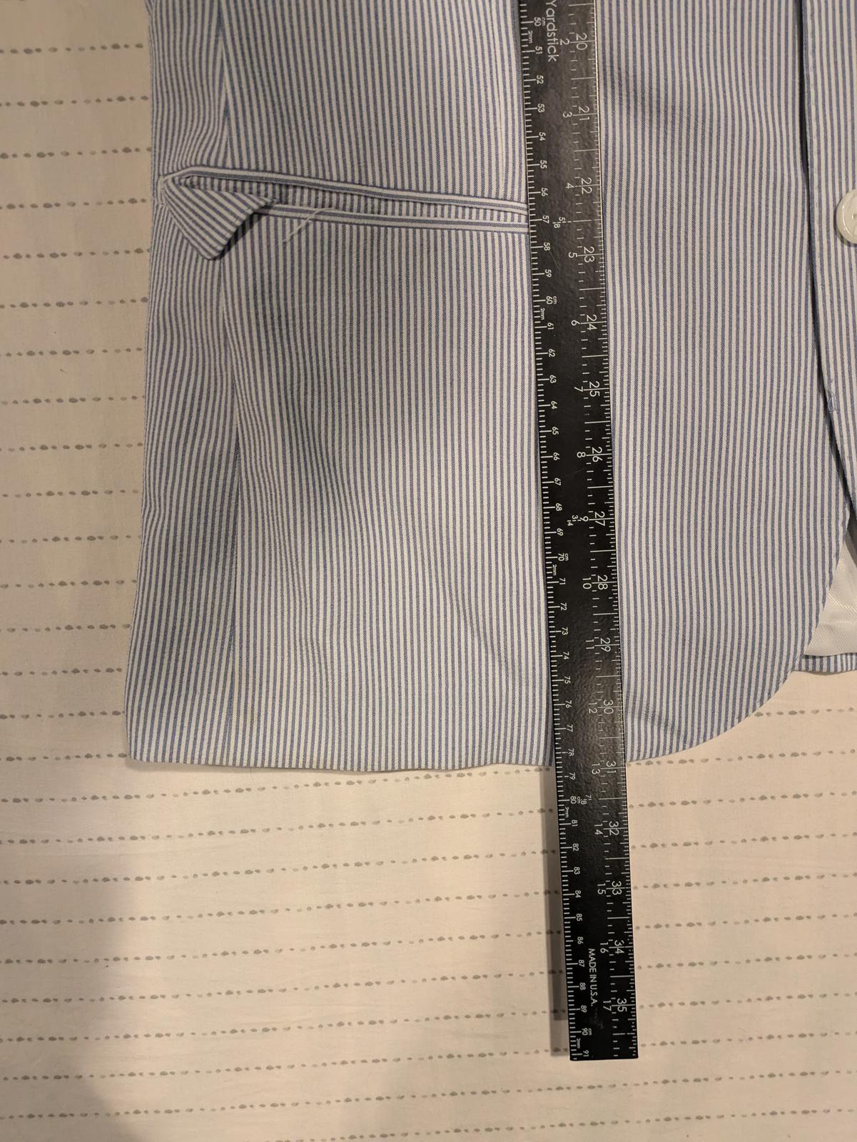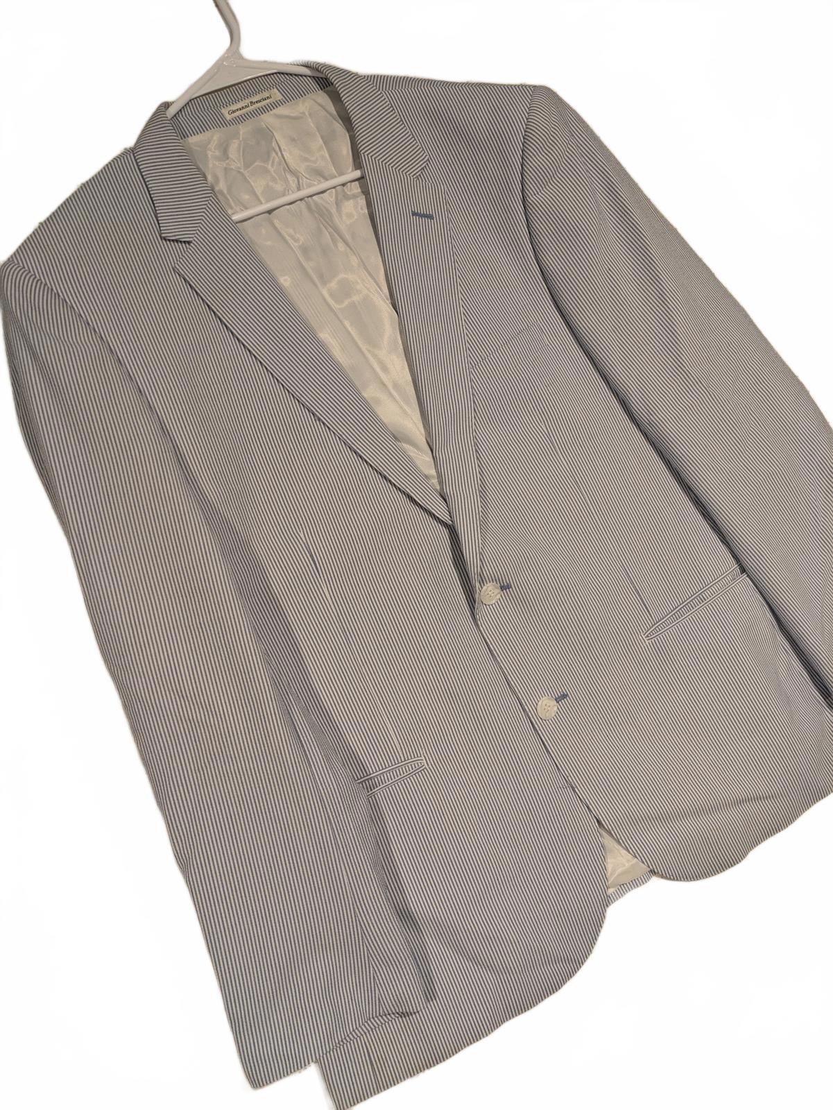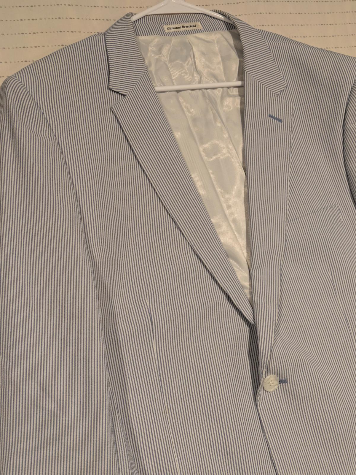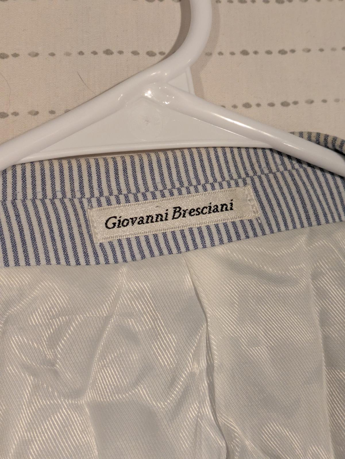 This Giovanni Bresciani blazer features a classic blue and white seersucker stripe with a lightweight feel that works well for warm weather or layered looks. Designed in a slim fit silhouette, it offers a tailored appearance without feeling restrictive. The notched lapel, two-button front, and clean welt pockets give it a refined yet relaxed style suitable for business casual, weddings, summer events, or smart everyday wear.