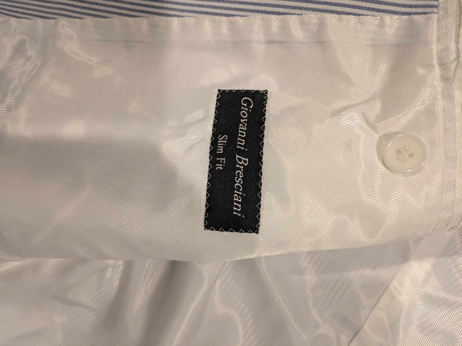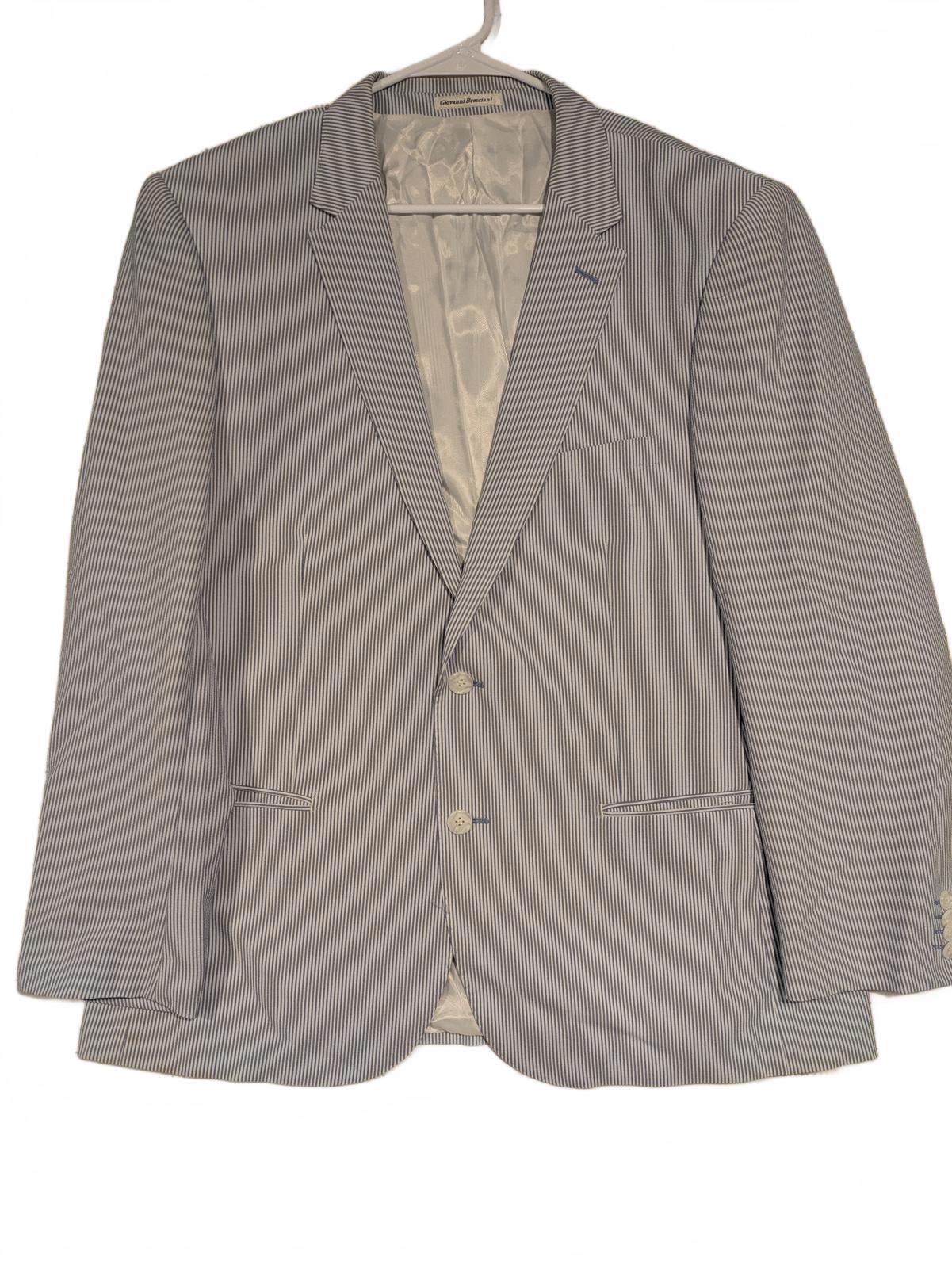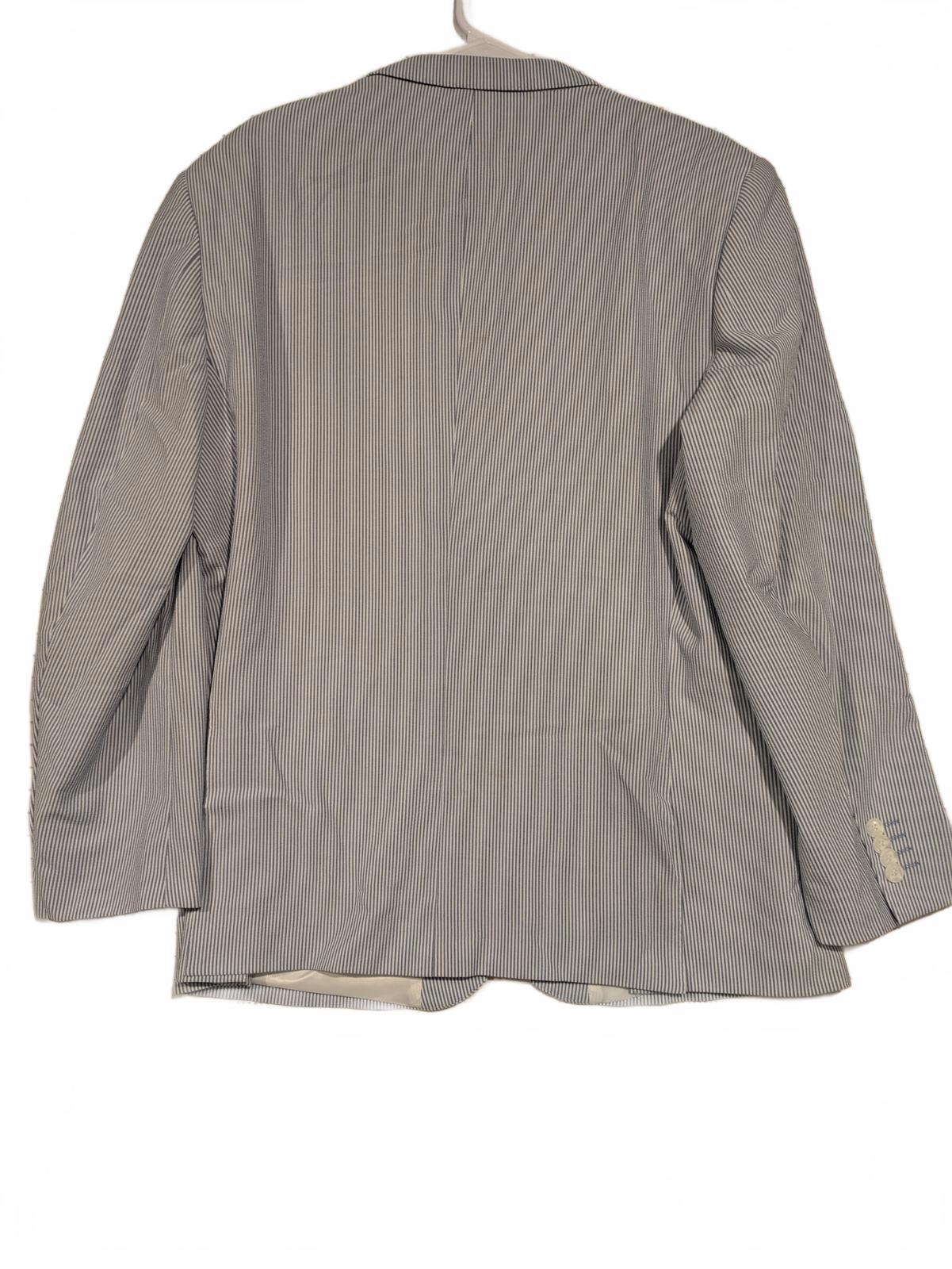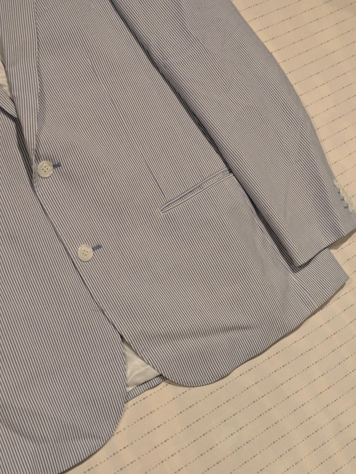 This Giovanni Bresciani blazer features a classic blue and white seersucker stripe with a lightweight feel that works well for warm weather or layered looks. Designed in a slim fit silhouette, it offers a tailored appearance without feeling restrictive. The notched lapel, two-button front, and clean welt pockets give it a refined yet relaxed style suitable for business casual, weddings, summer events, or smart everyday wear.
