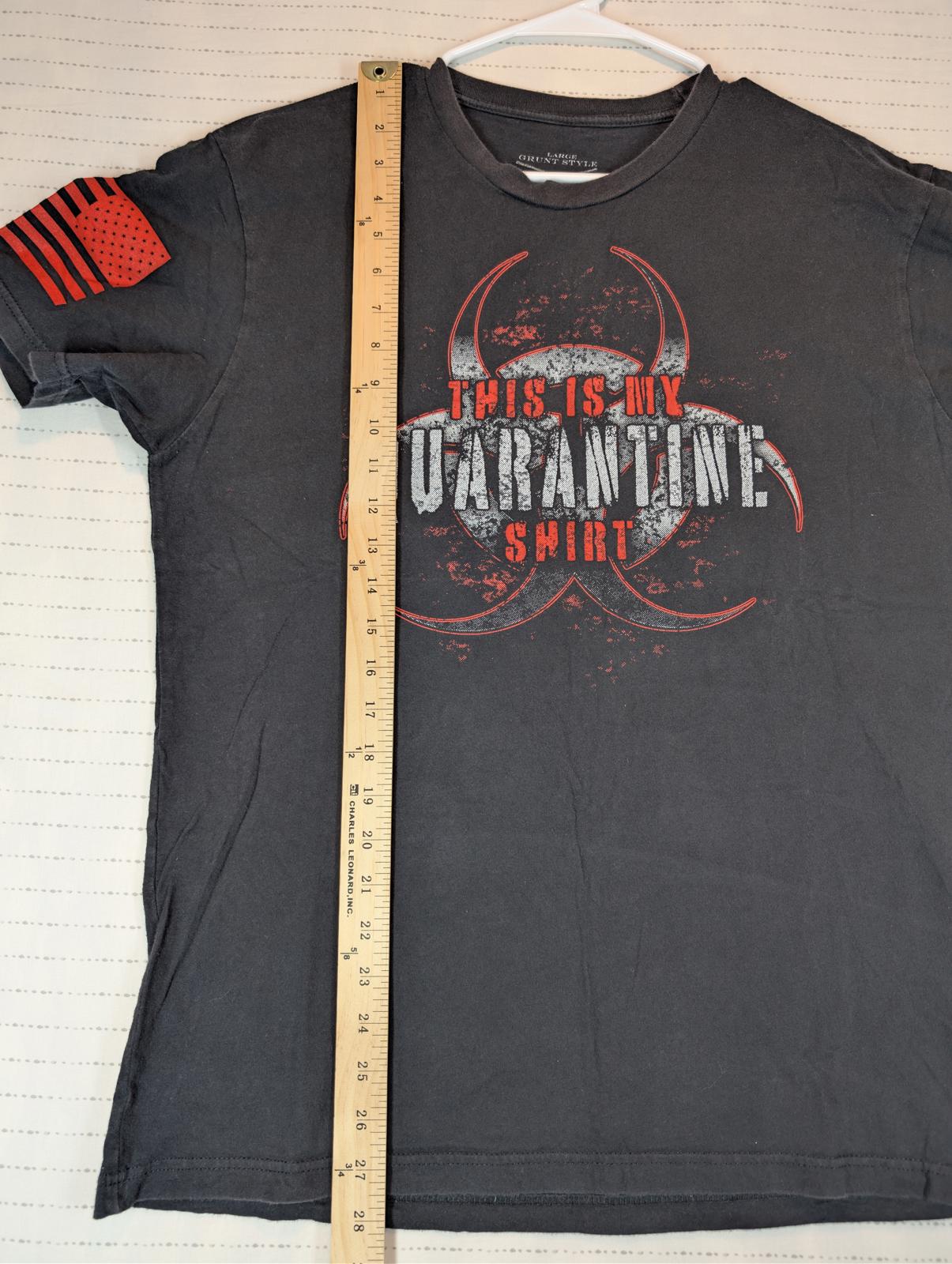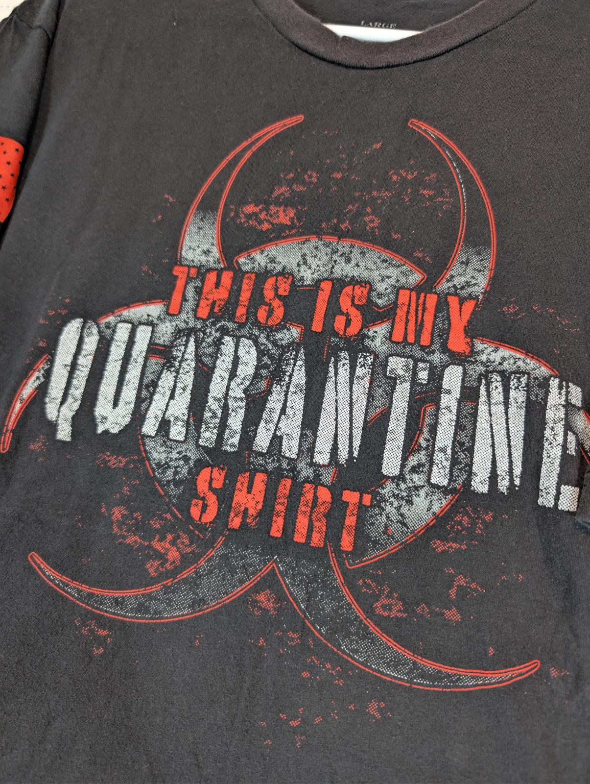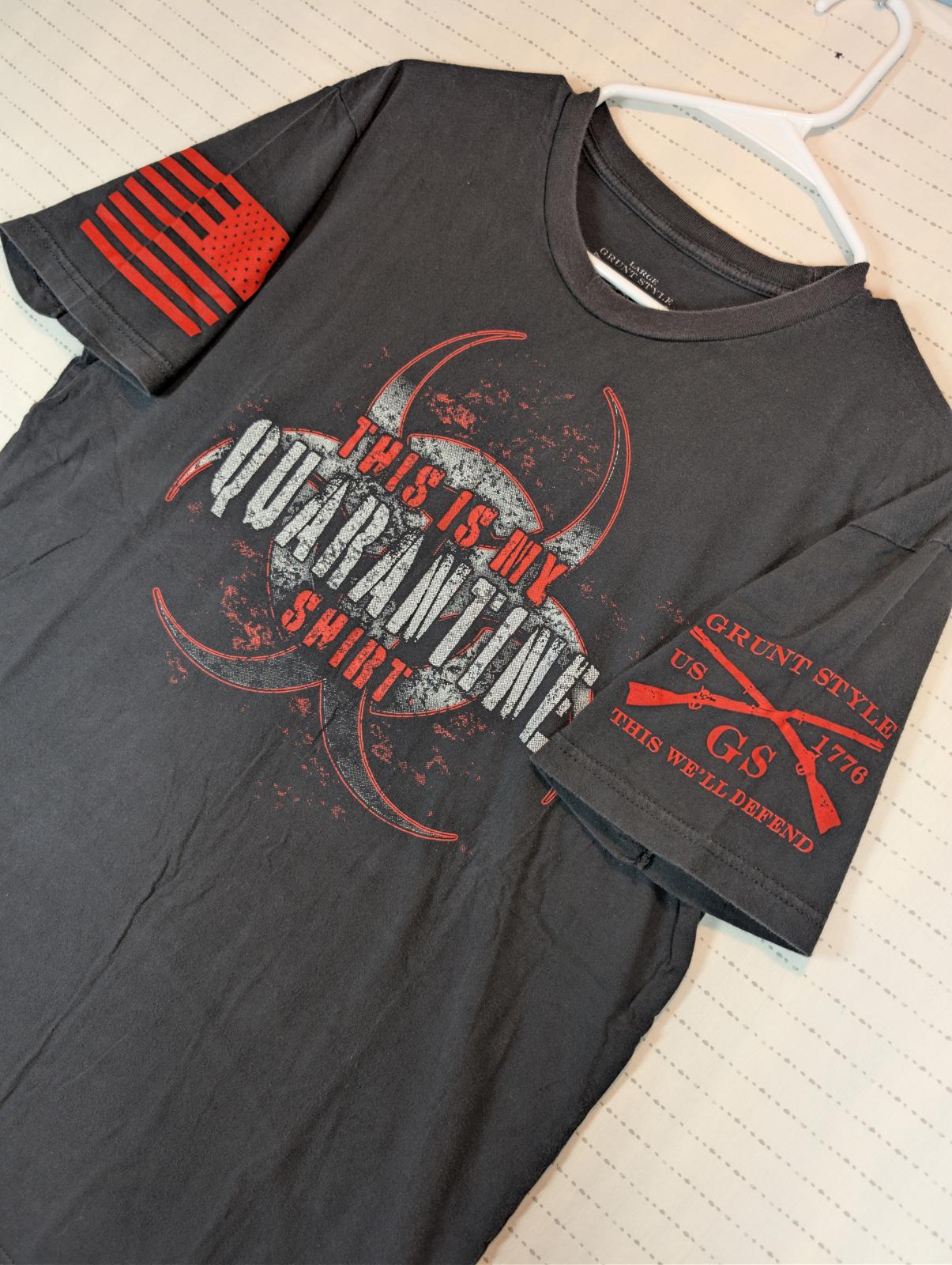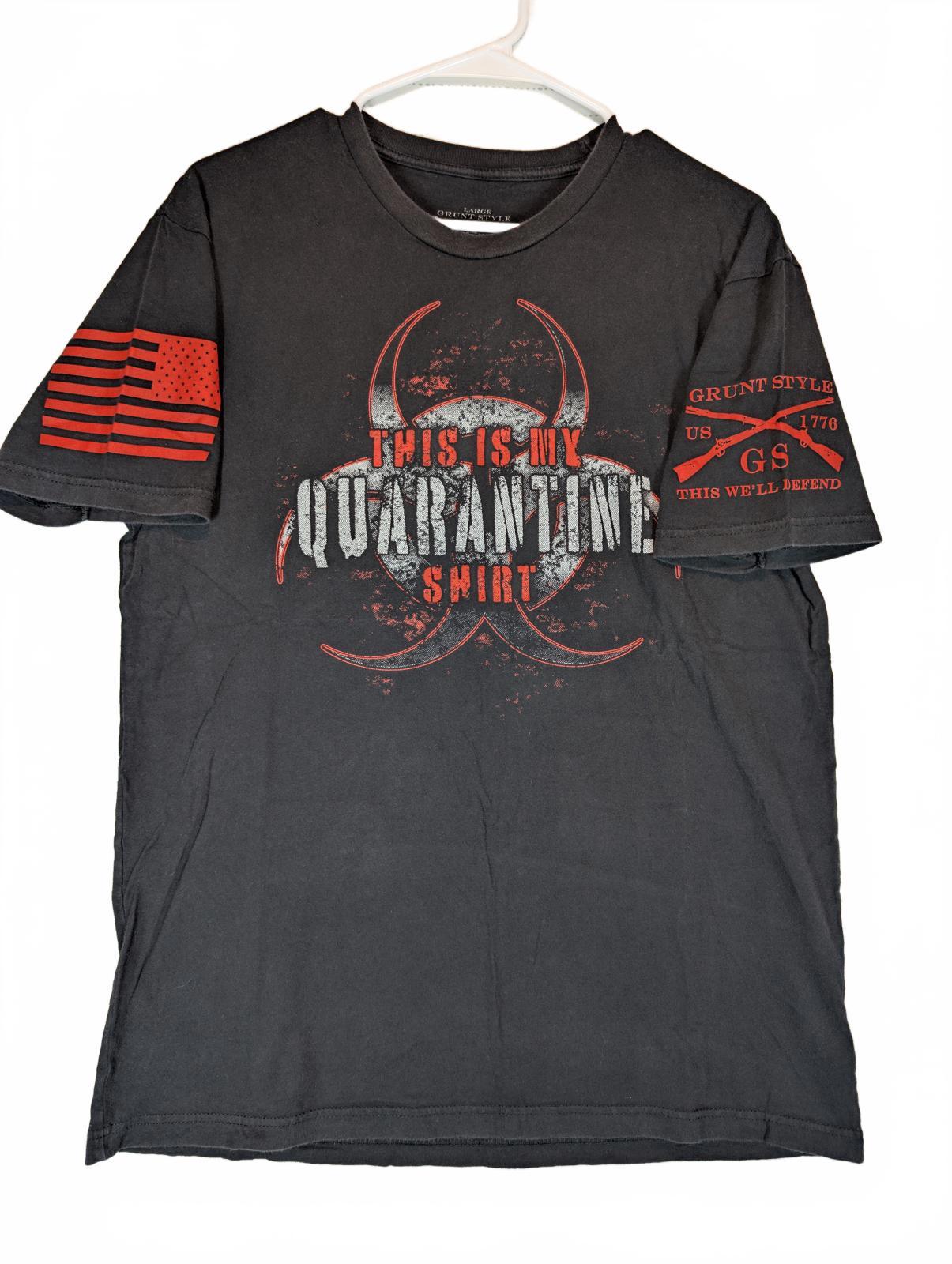 This Grunt Style “This Is My Quarantine Shirt” graphic T-shirt features a distressed biohazard design across the chest with bold red and white print. Patriotic sleeve graphics include a red American flag on one arm and crossed muskets with “This We’ll Defend” on the other, giving it a strong military-inspired look. Made from soft cotton, this tee is comfortable for everyday wear and well suited for casual outfits or graphic tee collectors. The print shows intentional distressing consistent with the design.