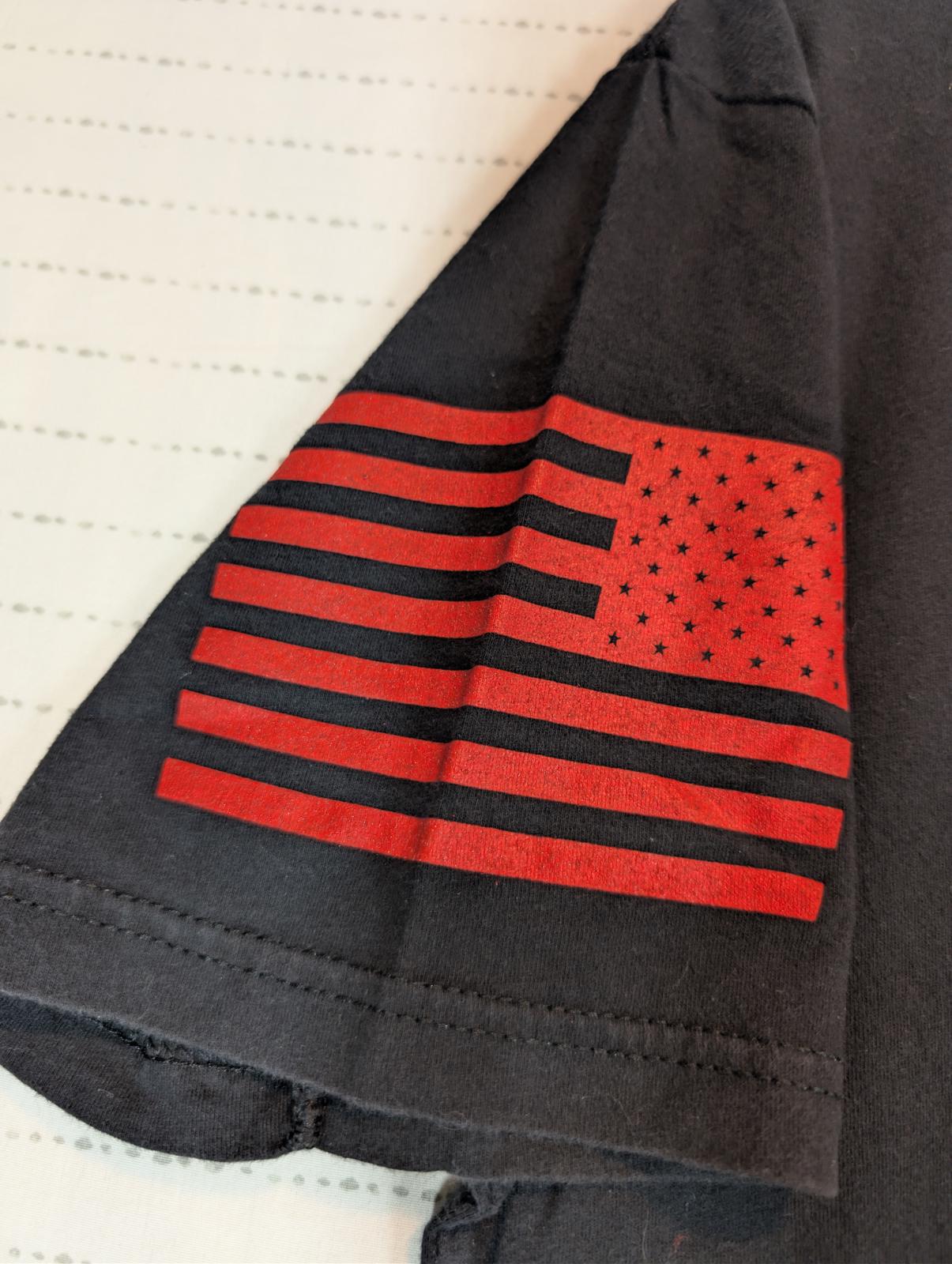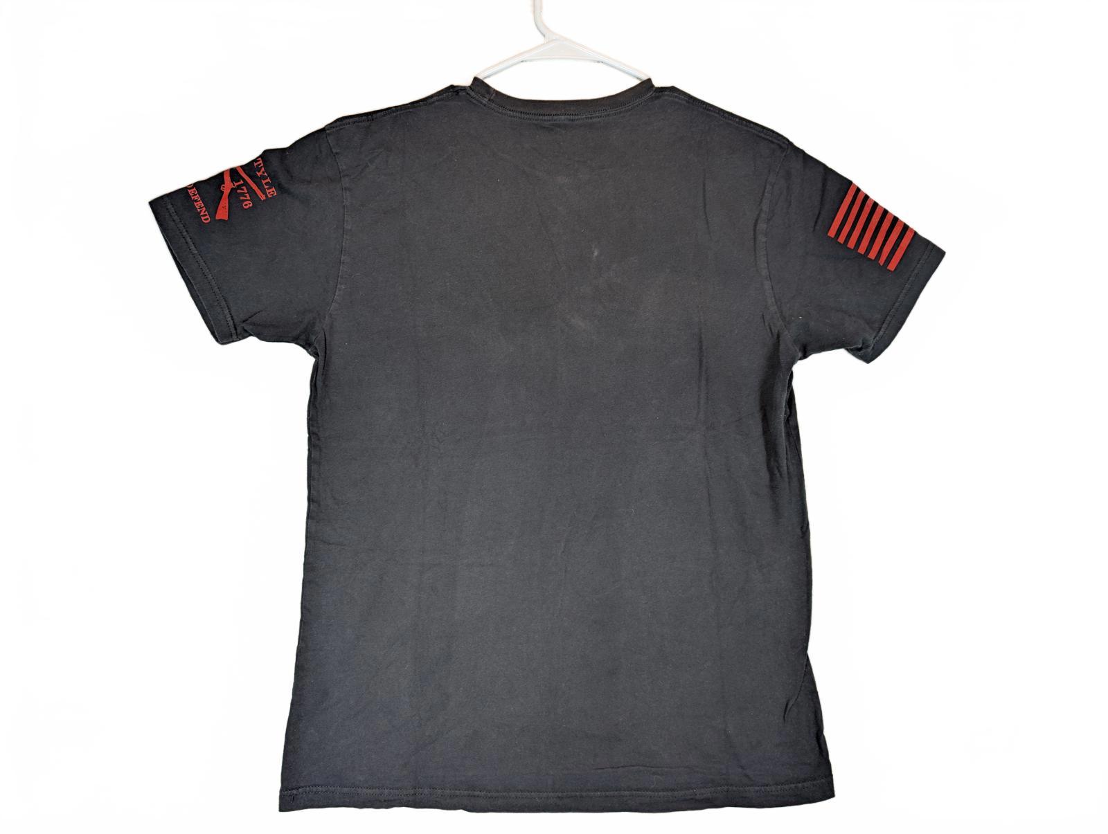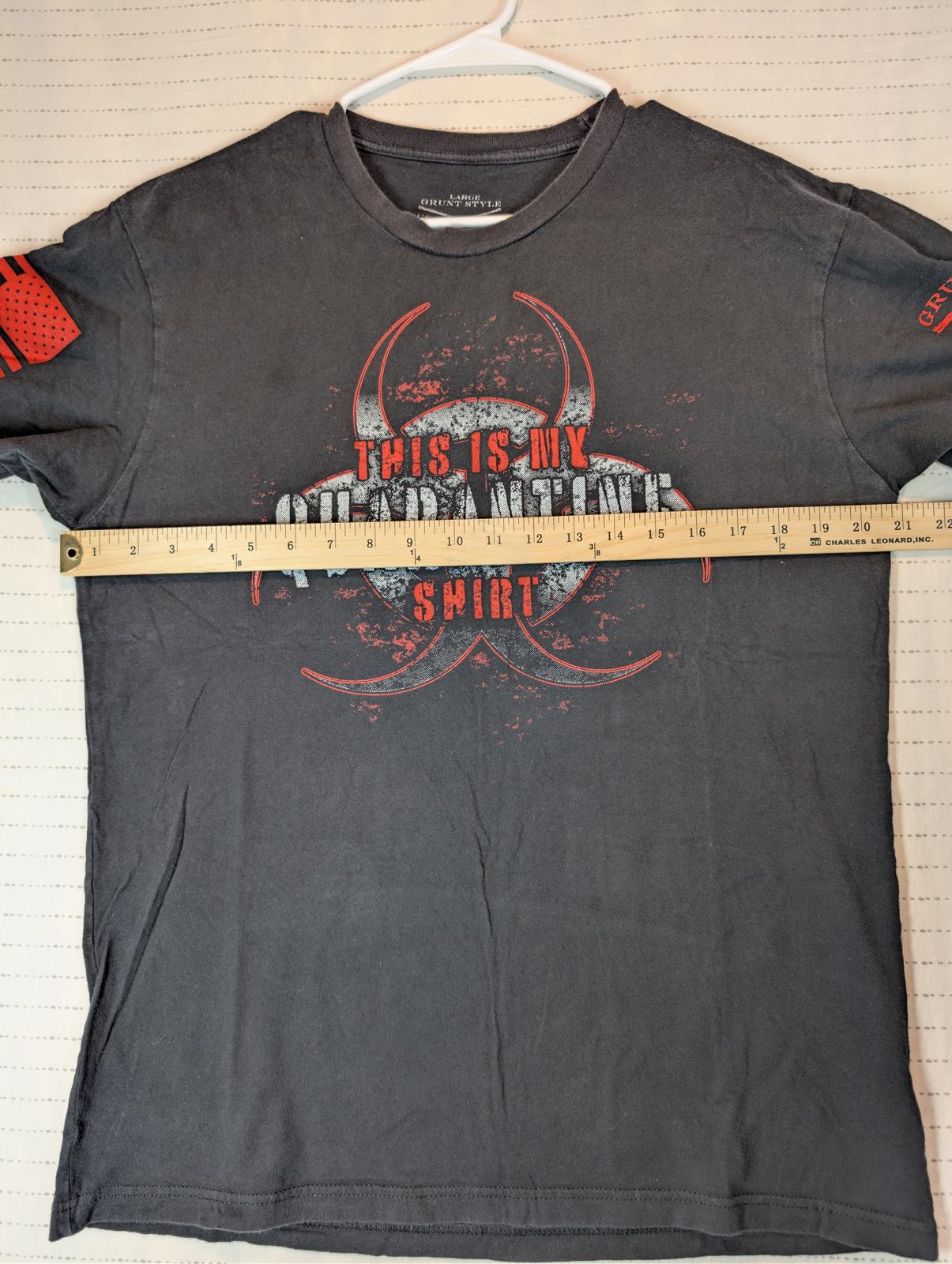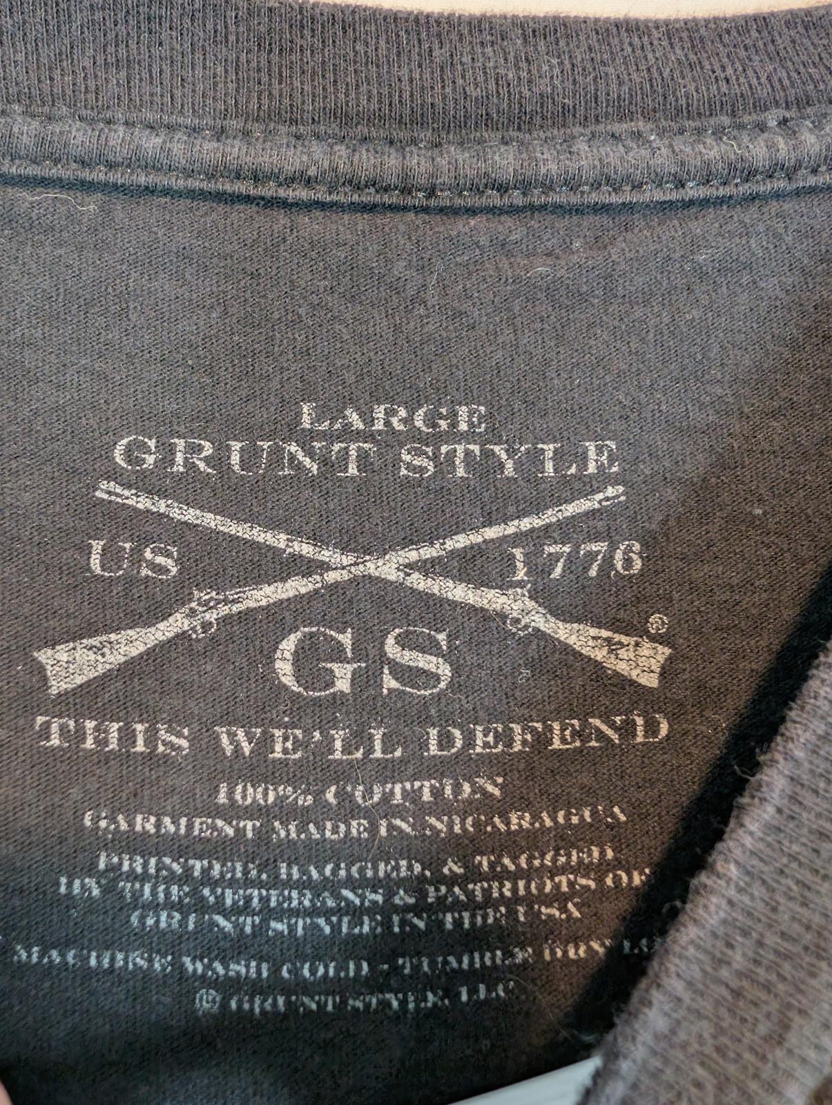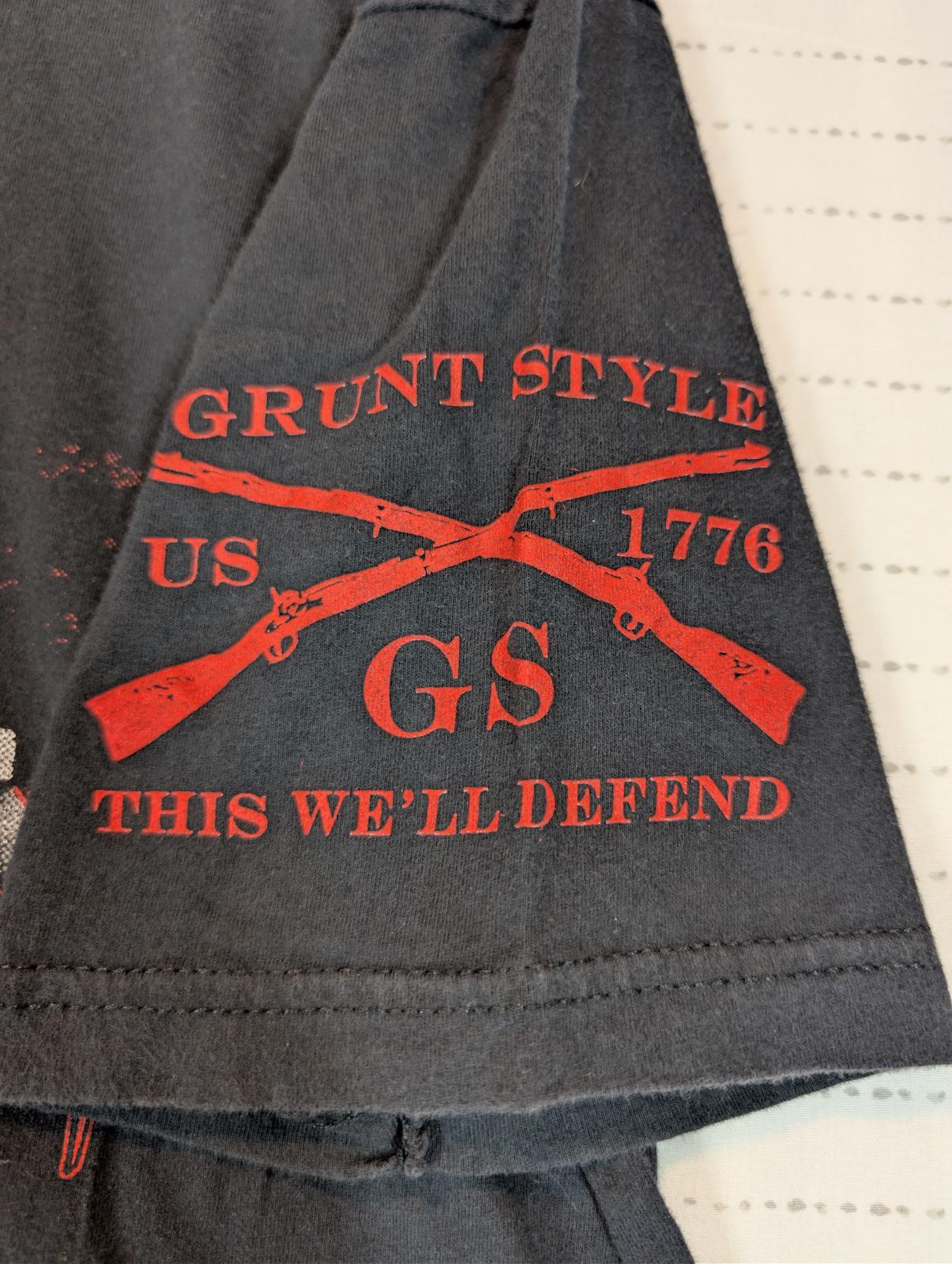 This Grunt Style “This Is My Quarantine Shirt” graphic T-shirt features a distressed biohazard design across the chest with bold red and white print. Patriotic sleeve graphics include a red American flag on one arm and crossed muskets with “This We’ll Defend” on the other, giving it a strong military-inspired look. Made from soft cotton, this tee is comfortable for everyday wear and well suited for casual outfits or graphic tee collectors. The print shows intentional distressing consistent with the design.