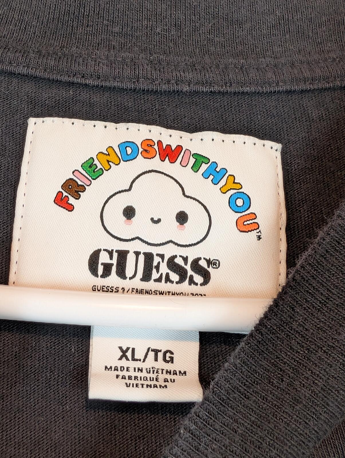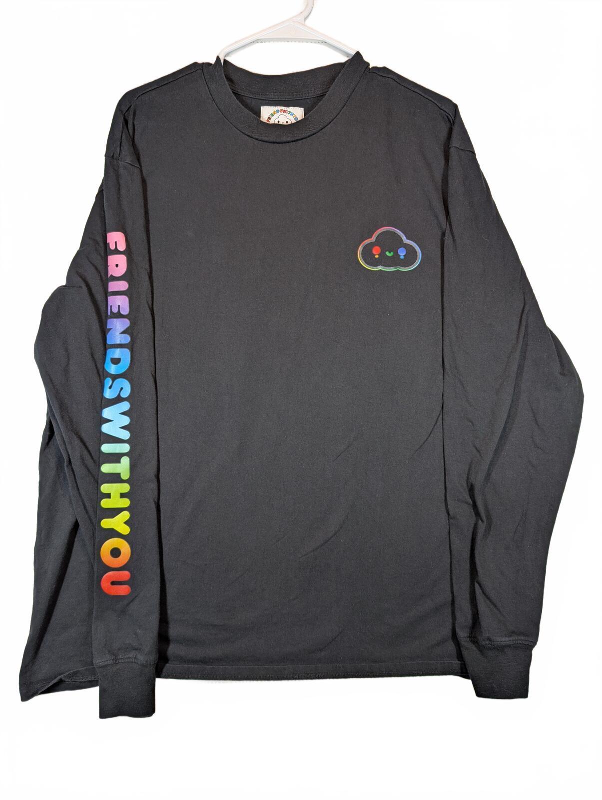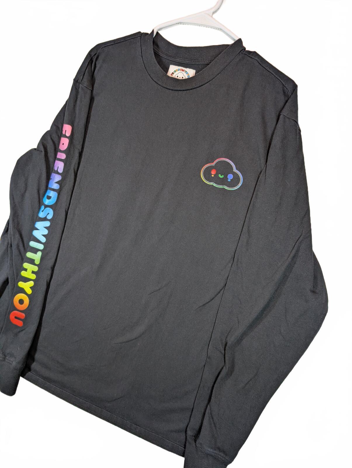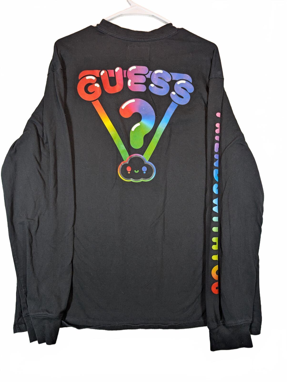 This is a black long sleeve T-shirt from GUESS x FriendsWithYou with rainbow sleeve text, a cloud chest graphic, and bold back logo art. A colorful graphic tee with streetwear and casual skater style in excellent preowned condition.
