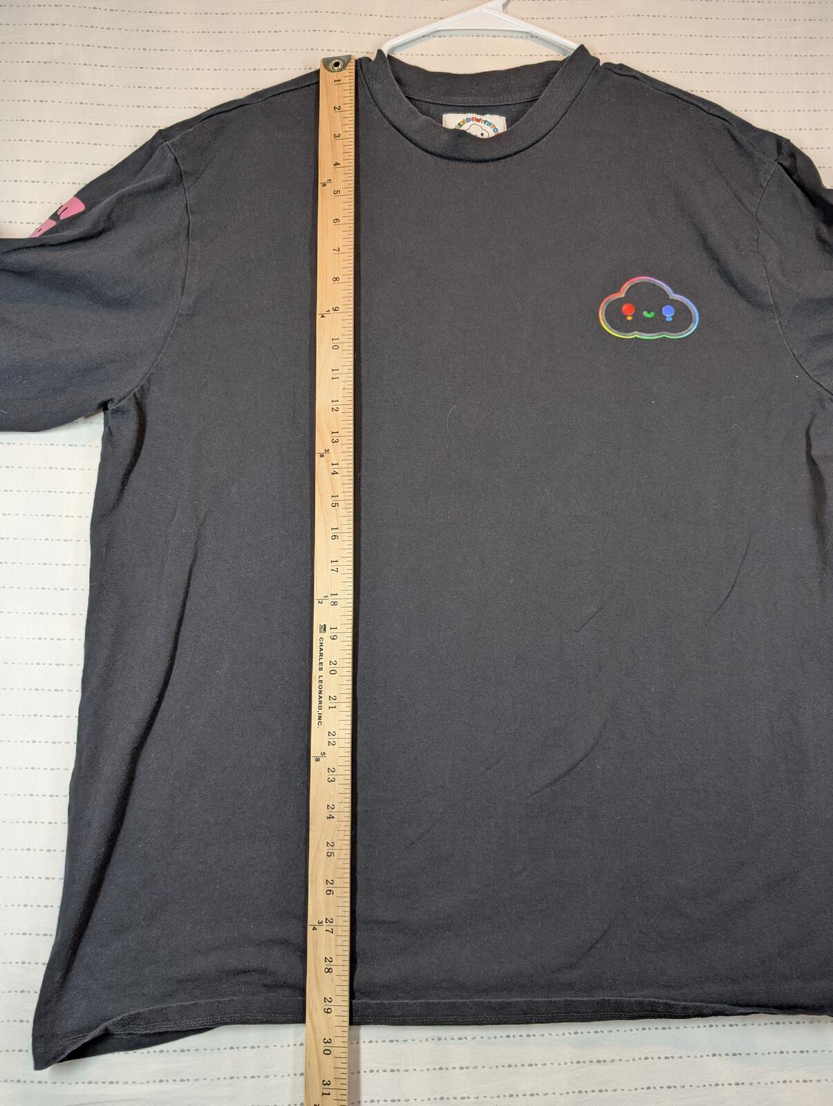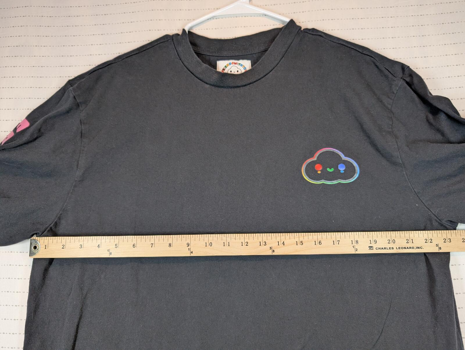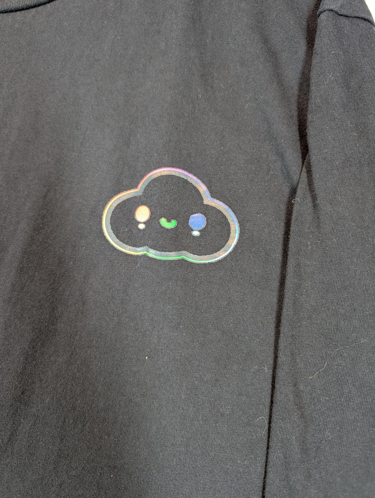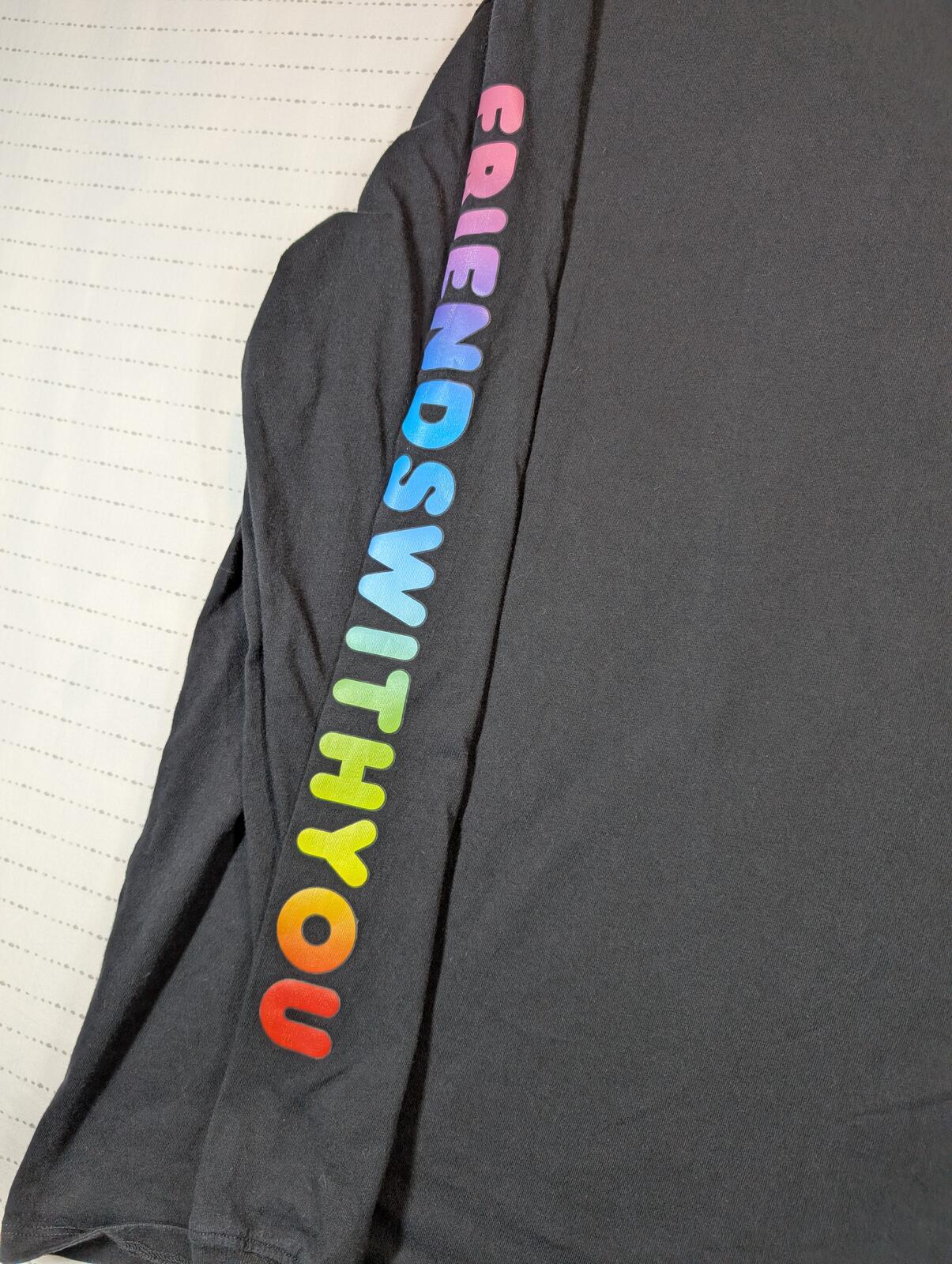 This is a black long sleeve T-shirt from GUESS x FriendsWithYou with rainbow sleeve text, a cloud chest graphic, and bold back logo art. A colorful graphic tee with streetwear and casual skater style in excellent preowned condition.