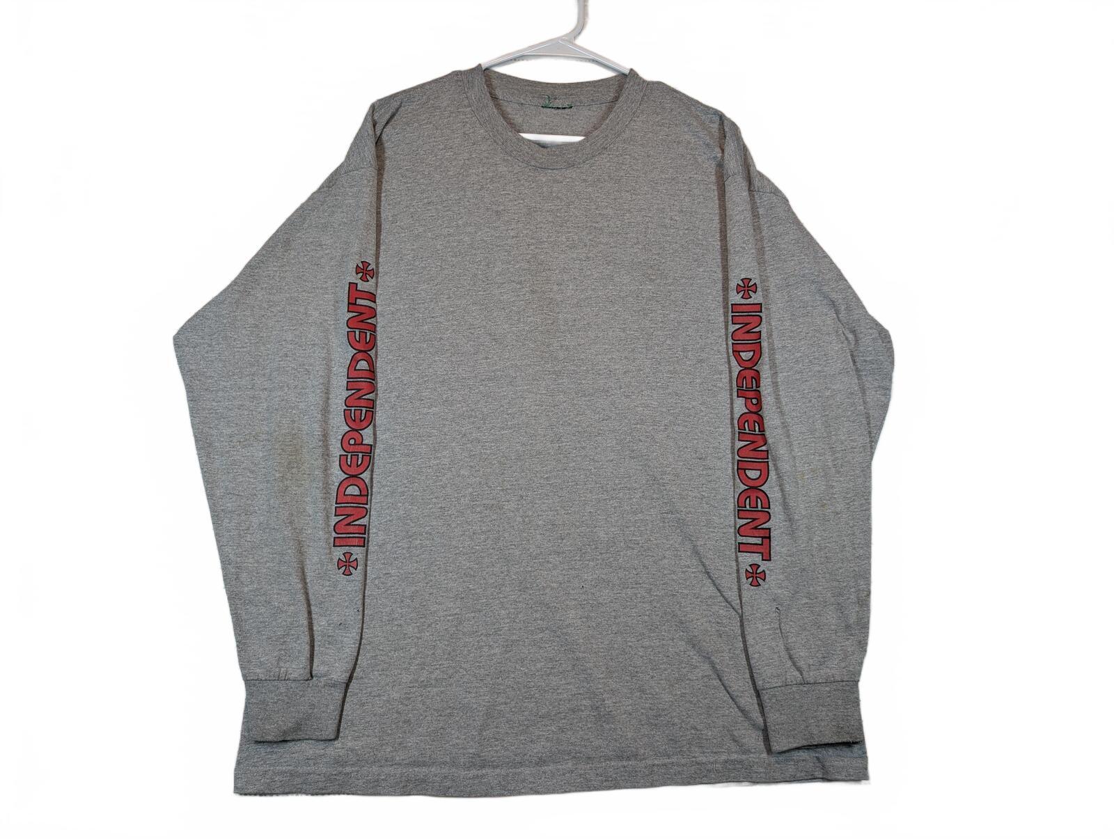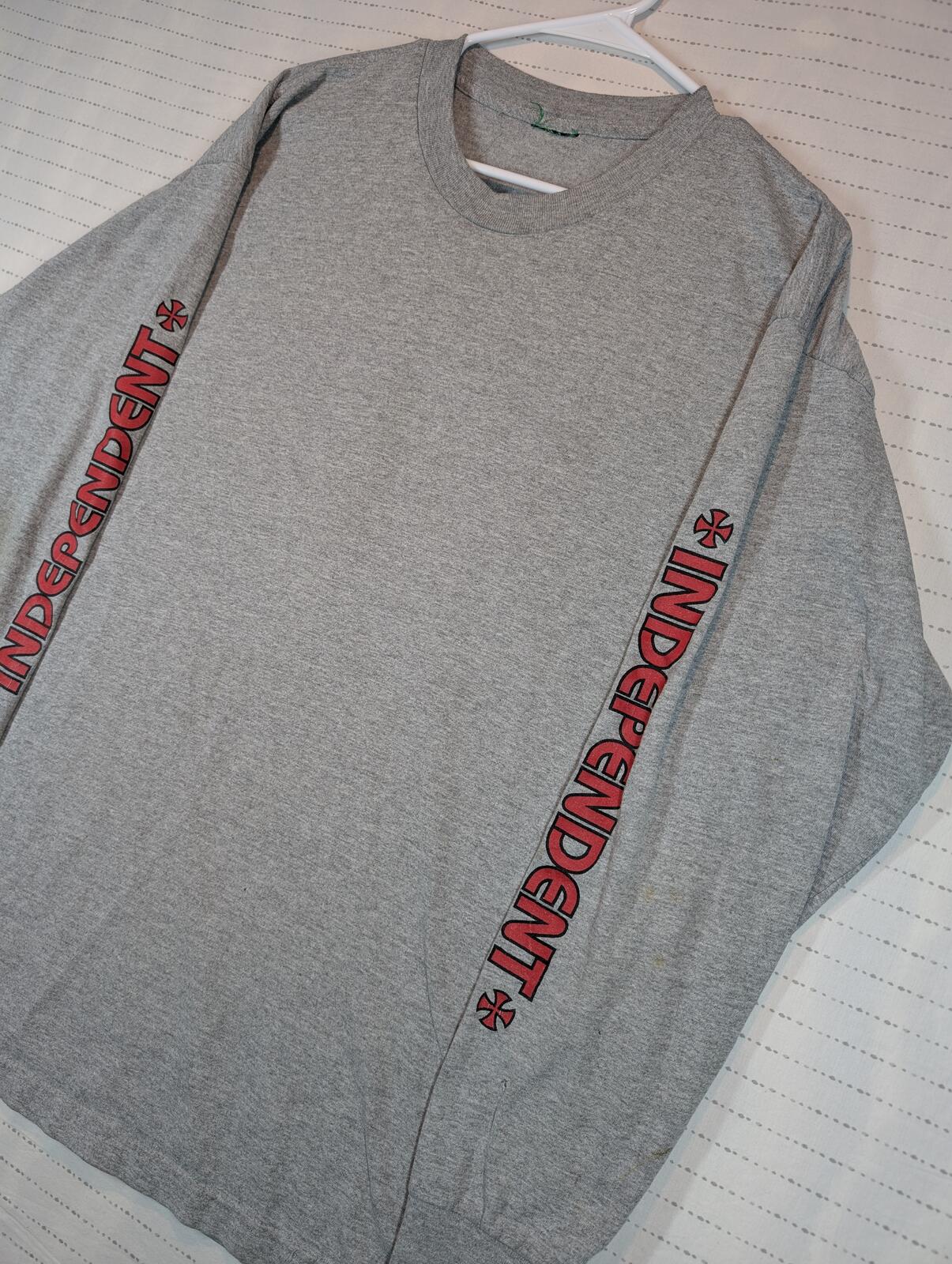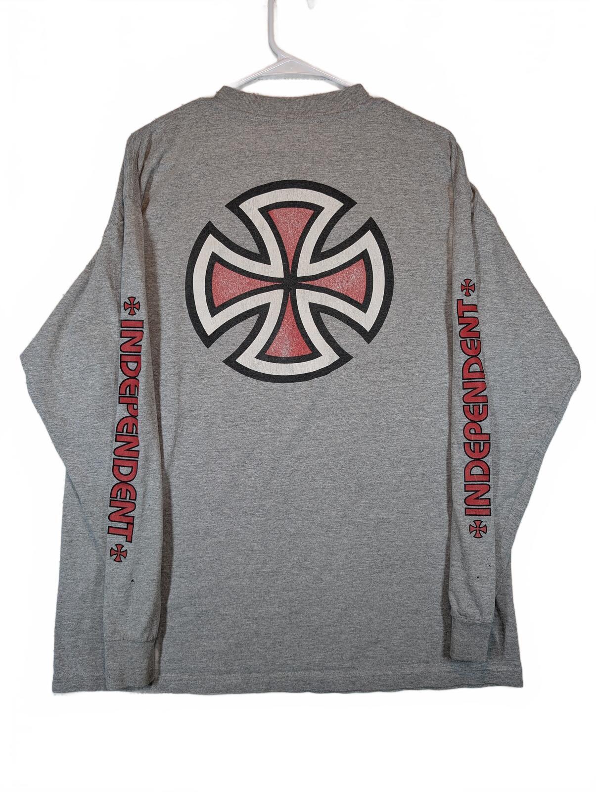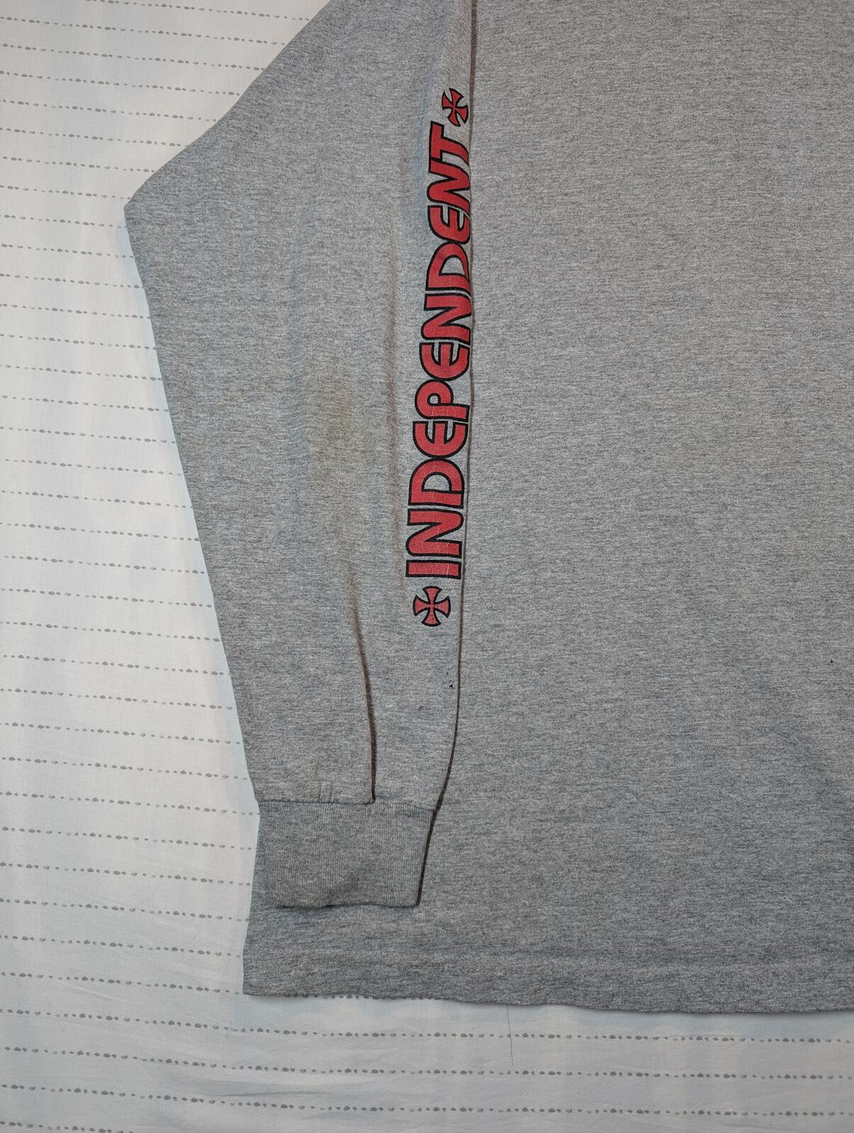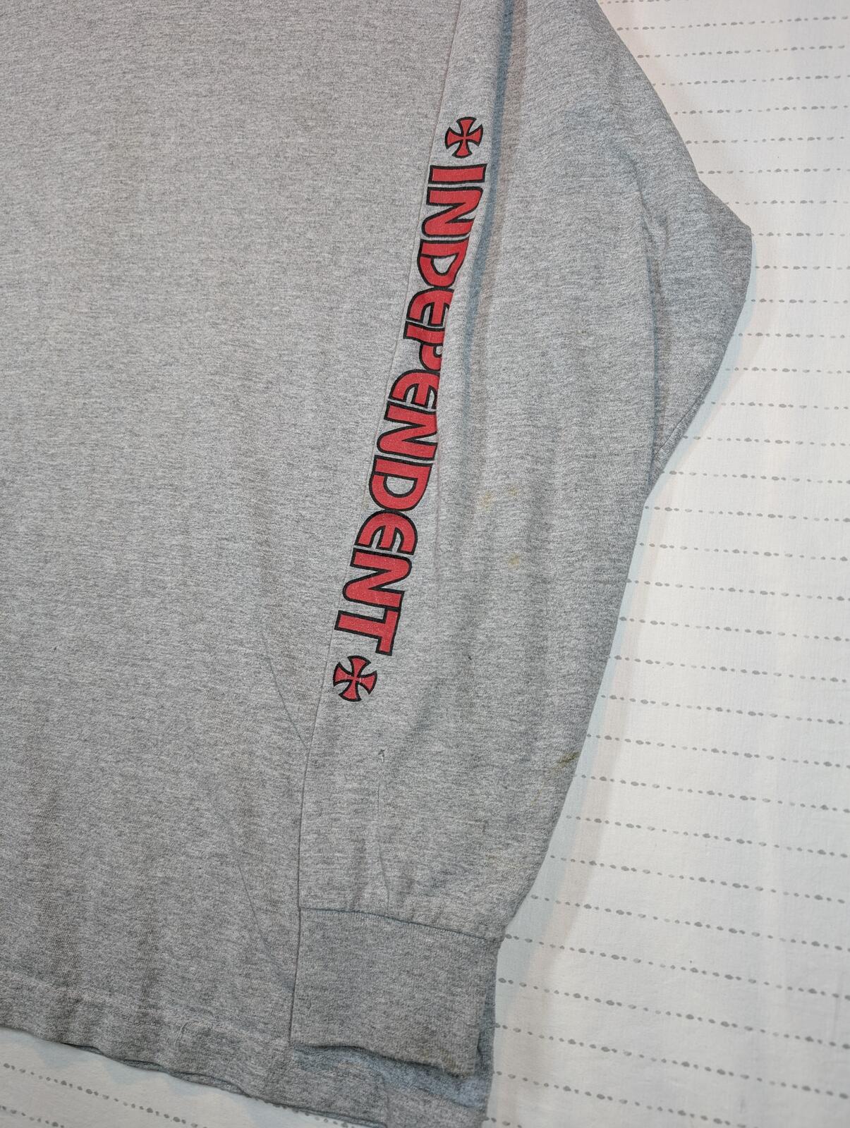 This is an Independent long sleeve T-shirt with sleeve logo hits and a large back cross graphic. Gray heather skate tee with streetwear style and visible light marks on the sleeve and front.