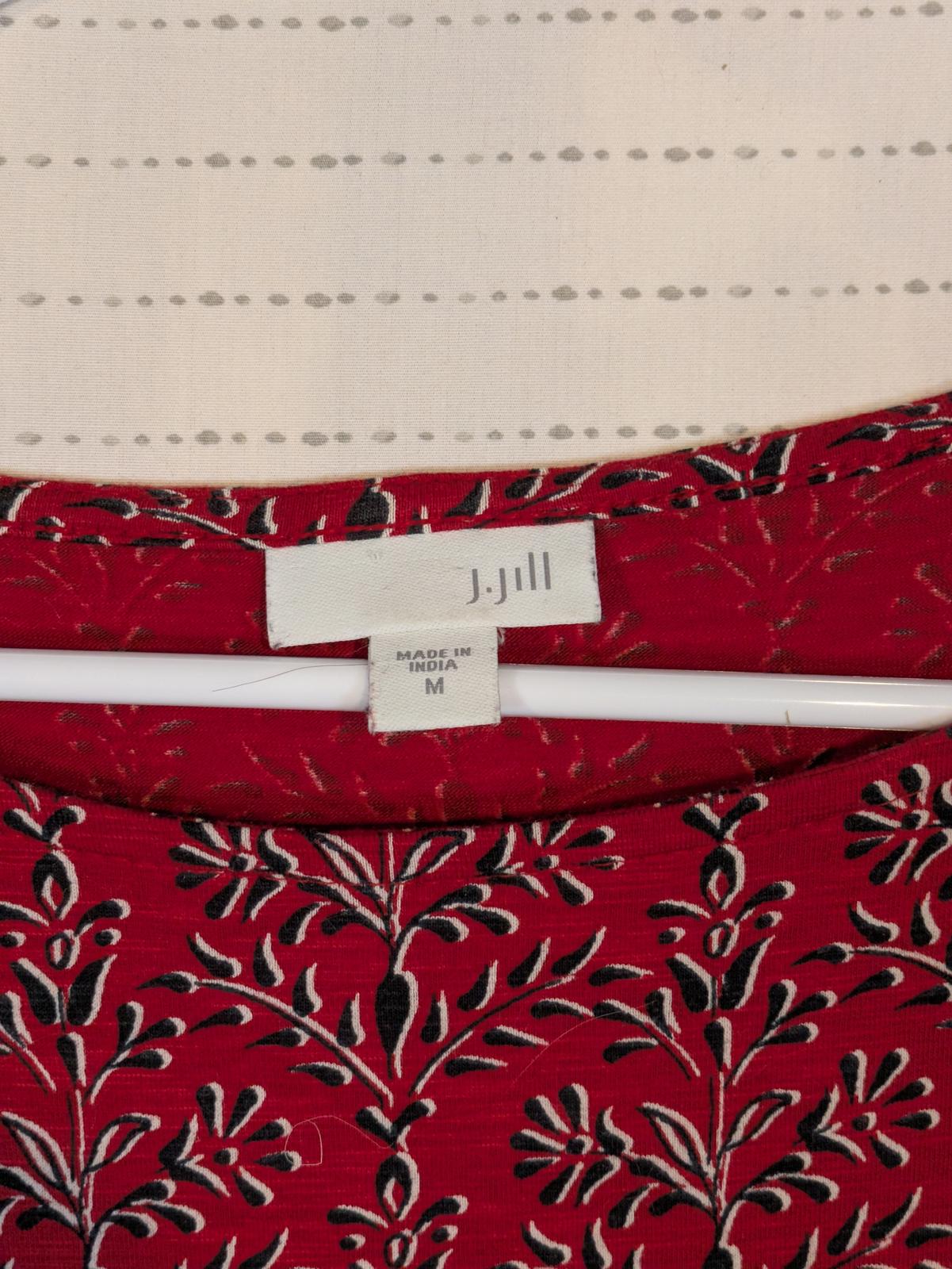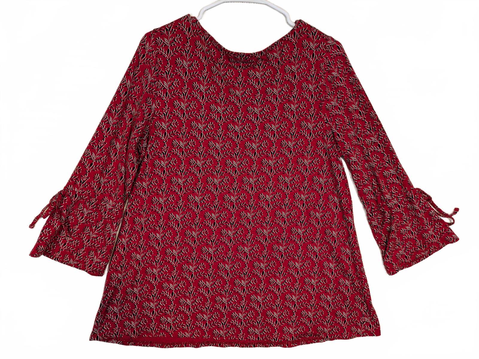 This J.Jill knit top features an allover floral print with a relaxed silhouette and bell sleeves finished with tie details. Designed with a wide scoop neckline and an easy pull-on style, it works well for casual wear, travel, or everyday layering. The soft knit construction offers comfortable movement, while the printed pattern gives it a polished look that pairs easily with jeans or slacks.