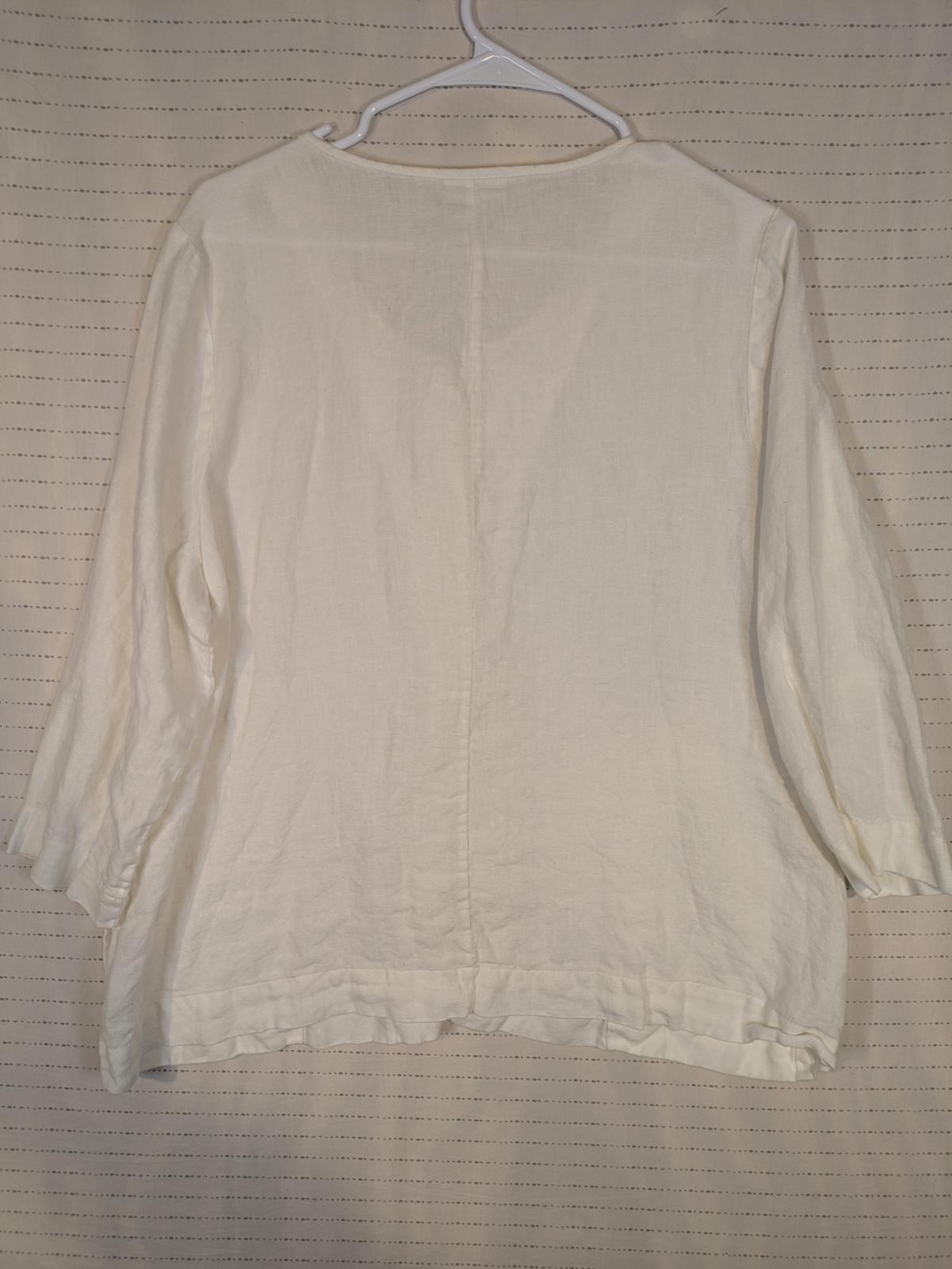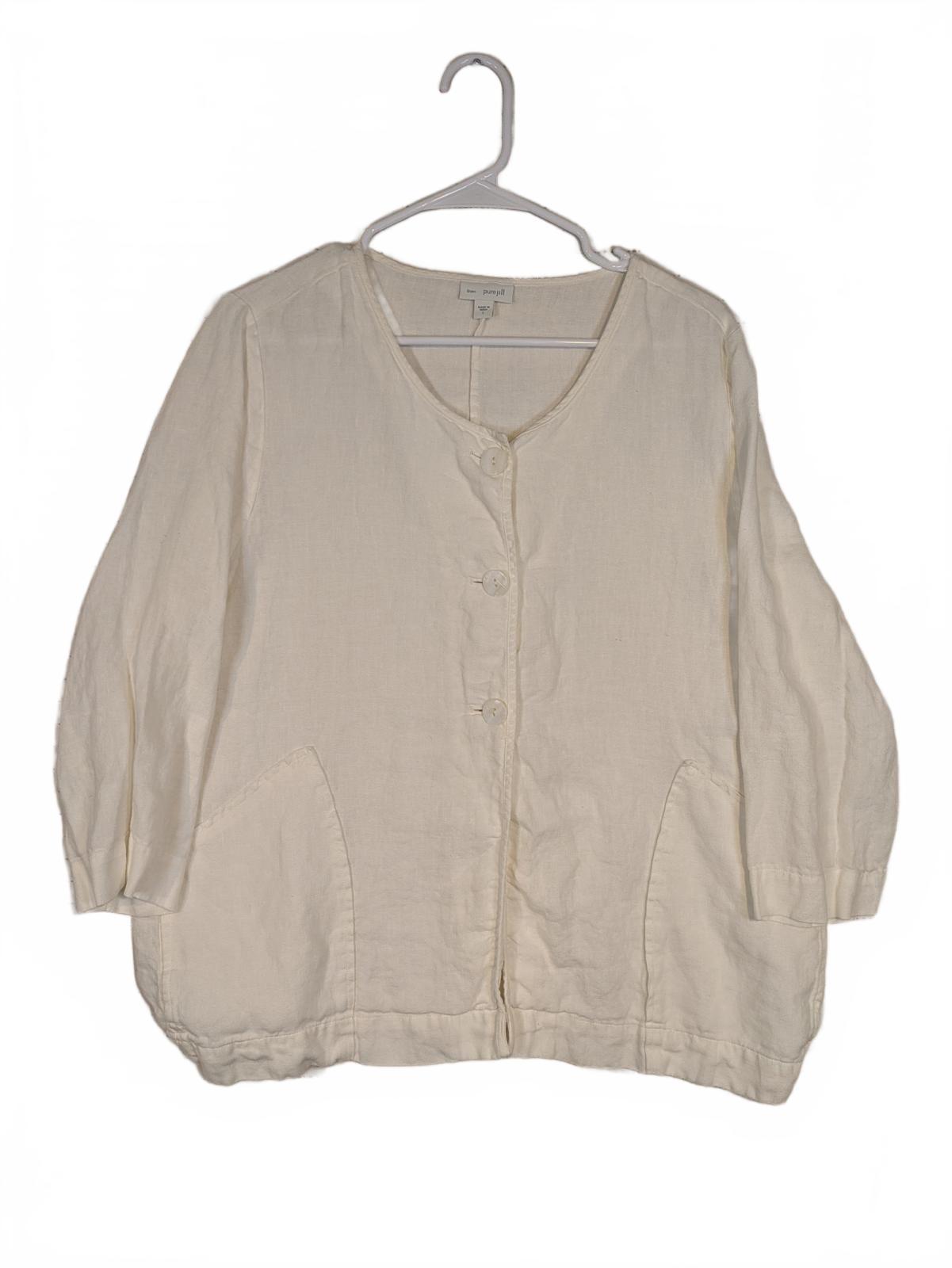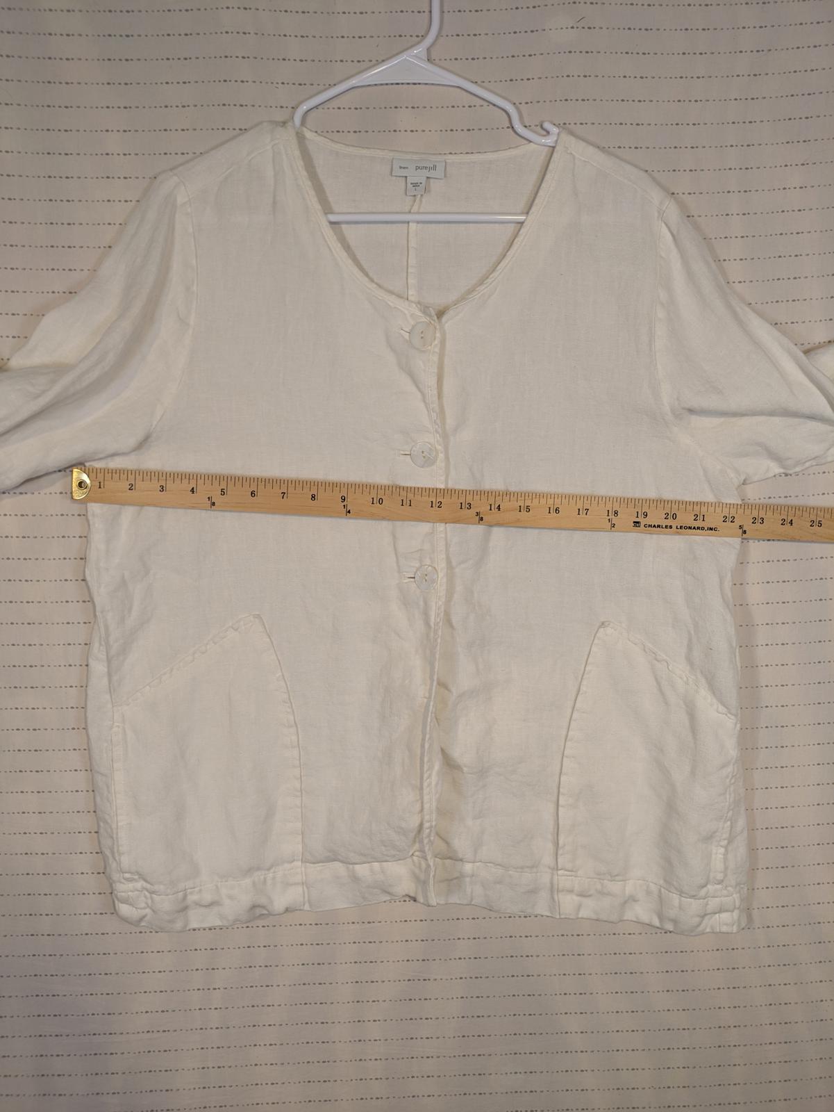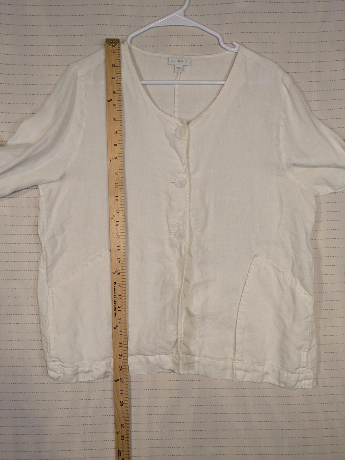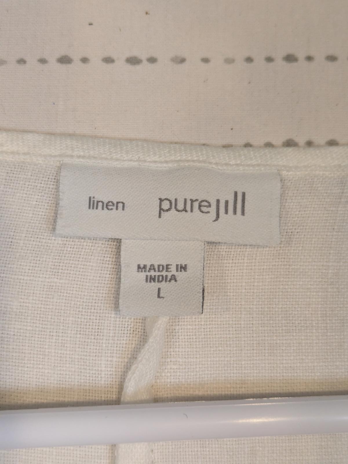 This PureJill linen jacket is a lightweight button front layering piece designed for casual and everyday wear. It features a round neckline, long sleeves, front patch pockets, and a relaxed silhouette that works well over tanks or tees. The breathable linen fabric provides comfort while maintaining structure, making it suitable for warm weather or transitional seasons. RN 97641 noted on tag.