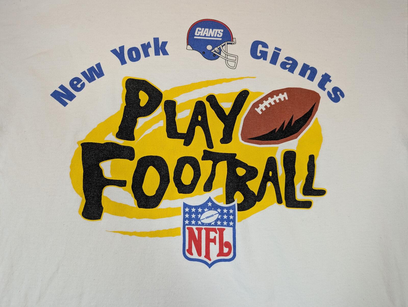 This is a Logo Athletic New York Giants graphic T-shirt in white with bold Play Football NFL front print. Vintage fan tee in 100% cotton with classic football graphics and an easy casual fit.