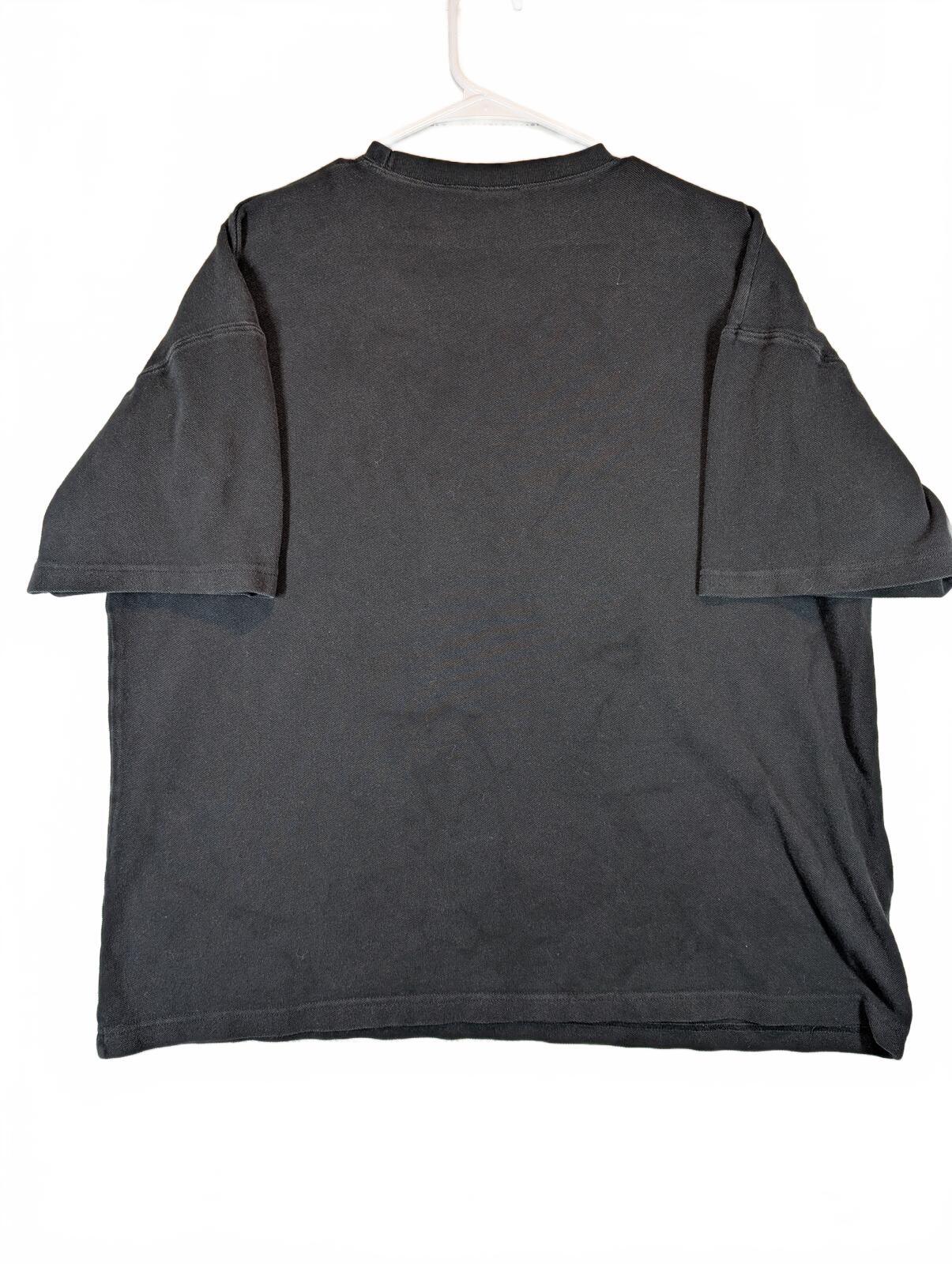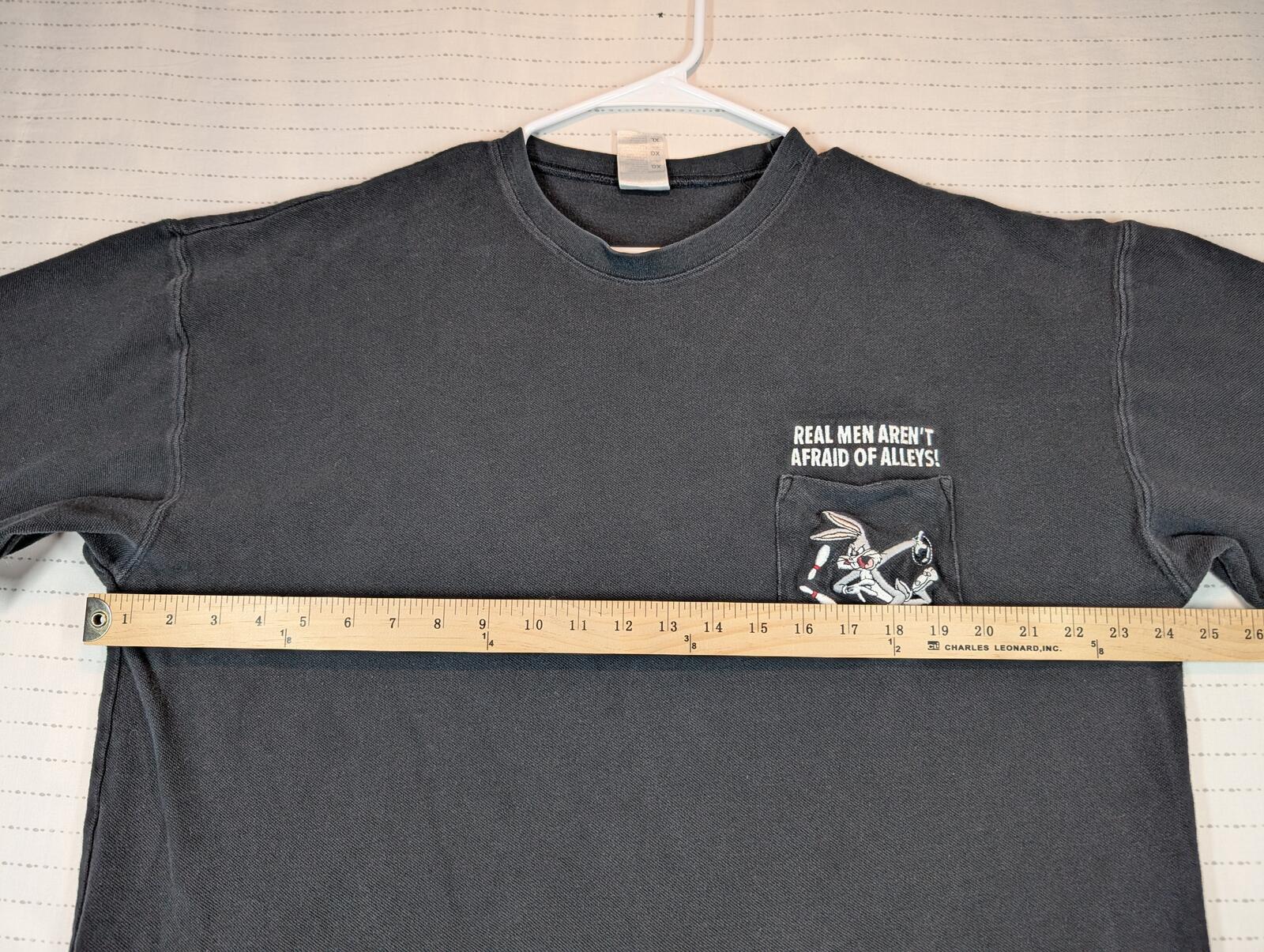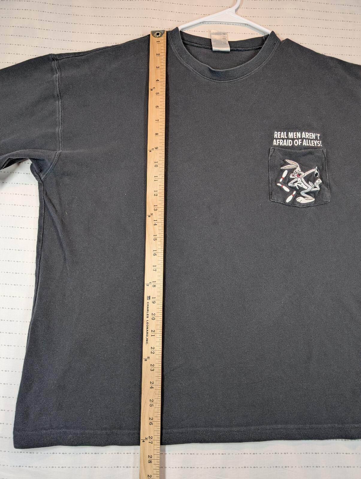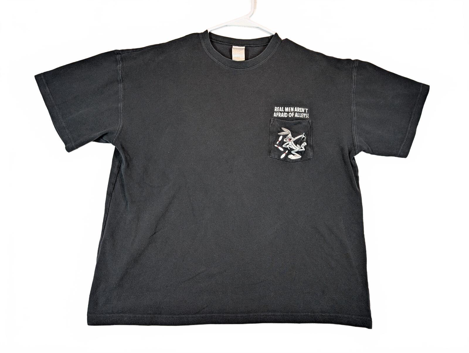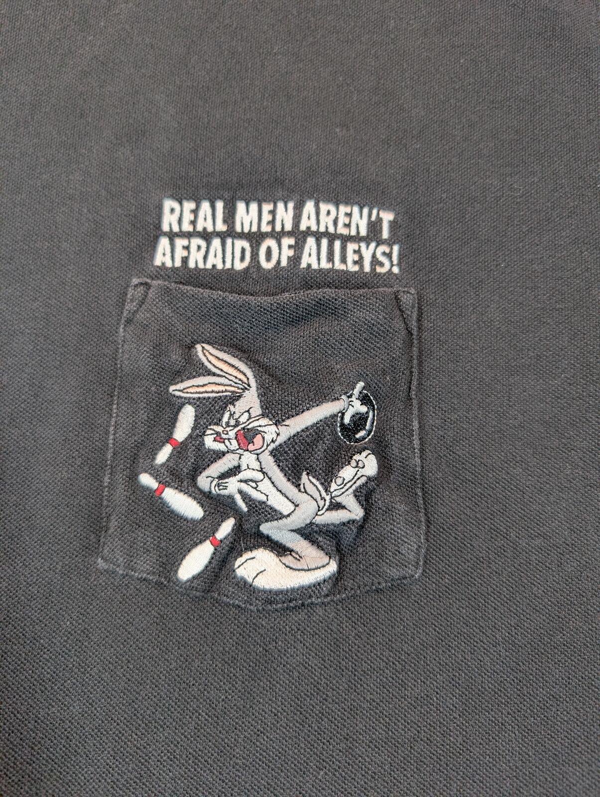 This is a Looney Tunes pocket T-shirt featuring Bugs Bunny bowling embroidery and “Real Men Aren’t Afraid Of Alleys!” text. Black casual tee with cartoon graphic and novelty bowling style. Excellent everyday wear piece.