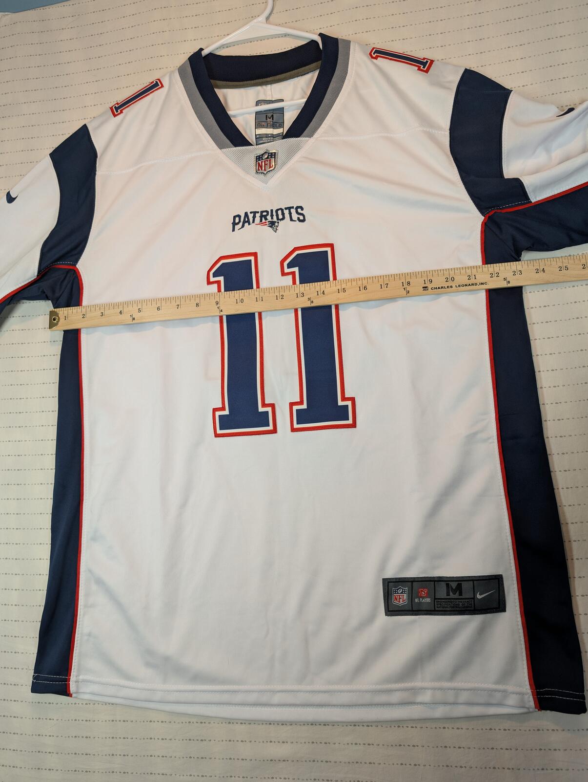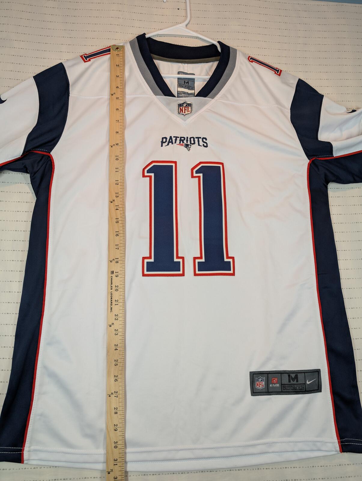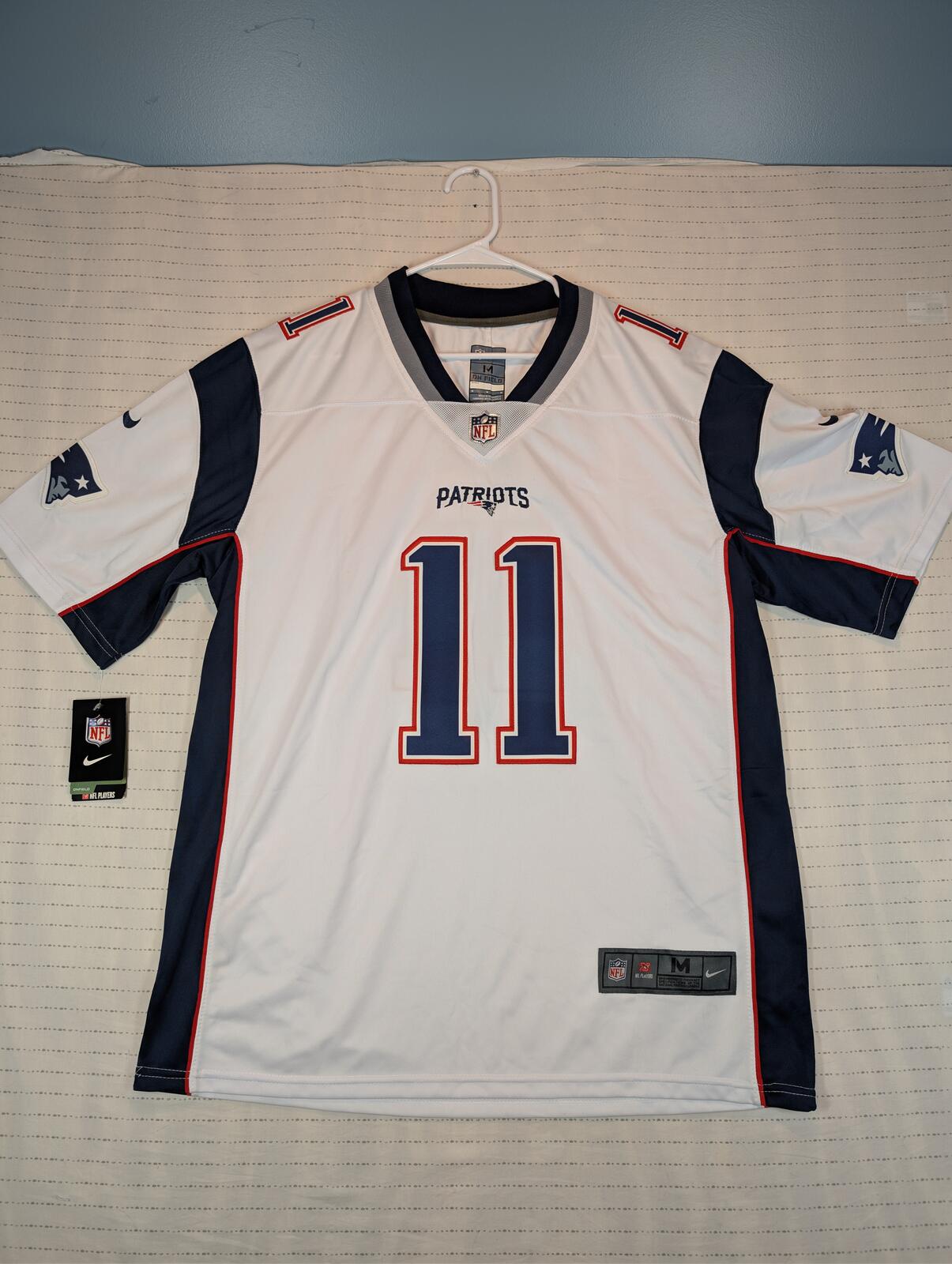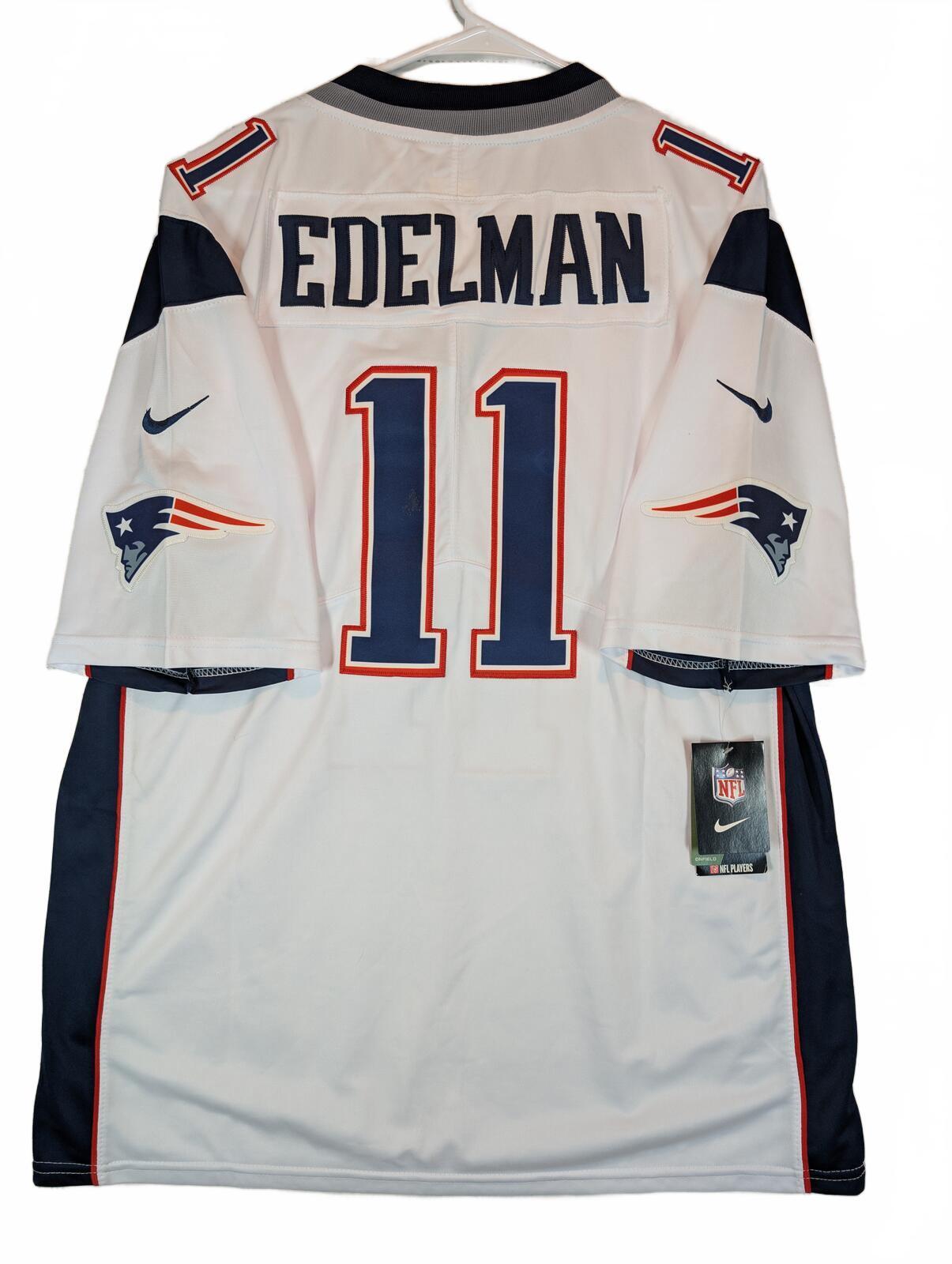 This is a non-authentic Nike On Field New England Patriots Julian Edelman #11 football jersey in white. New With Tags men’s size medium with screen printed graphics, mesh athletic fabric, and classic NFL fanwear style.