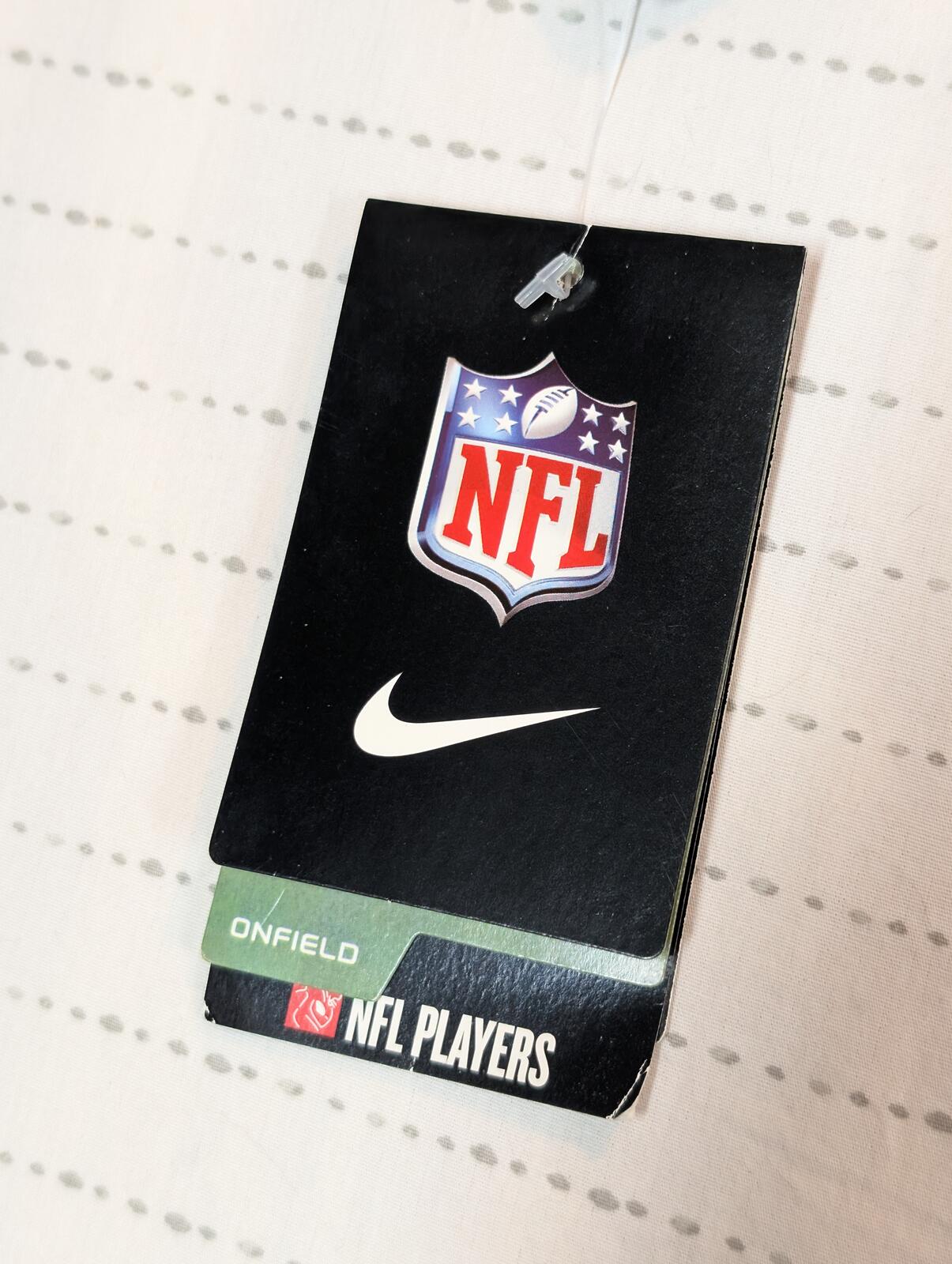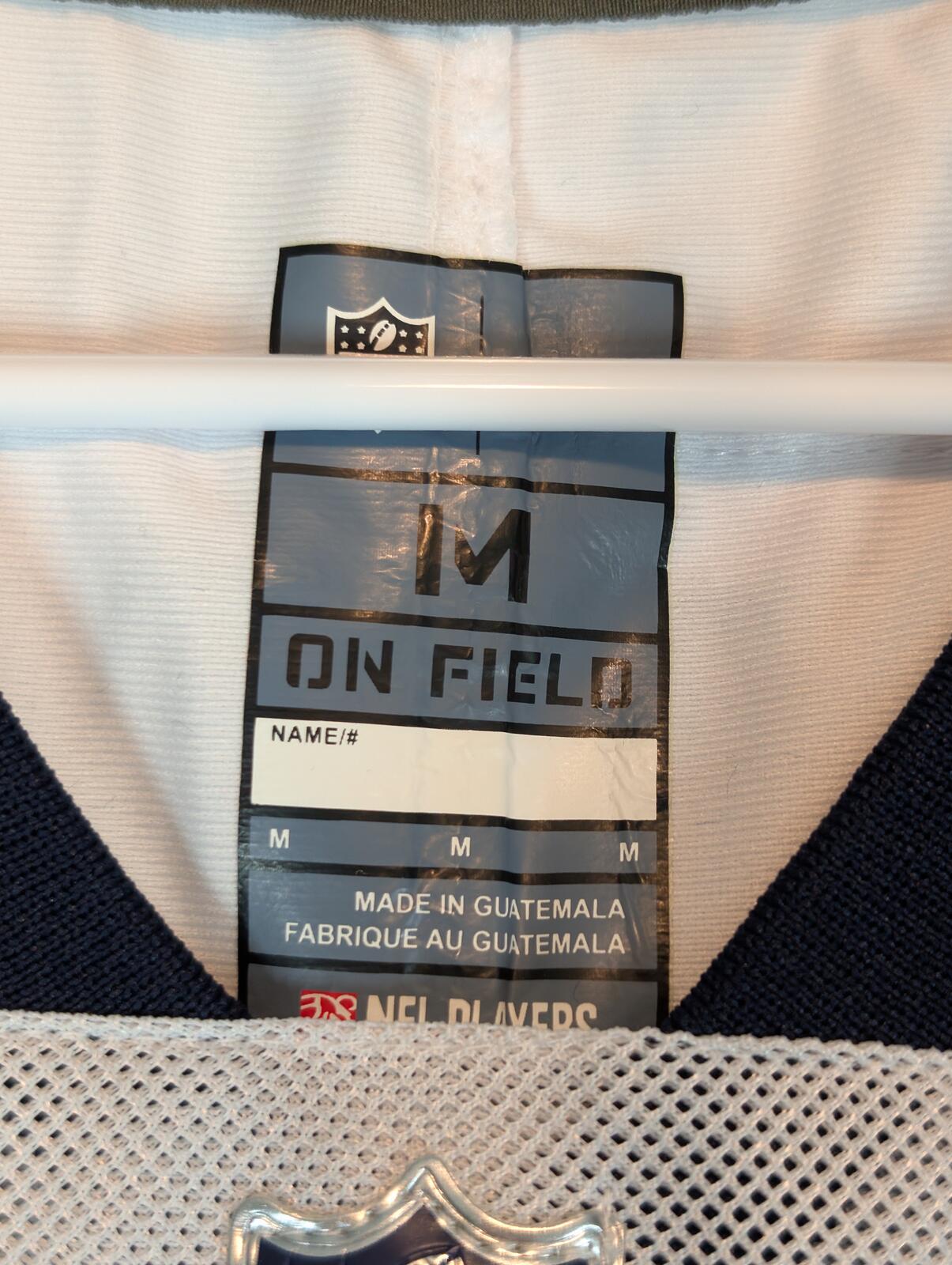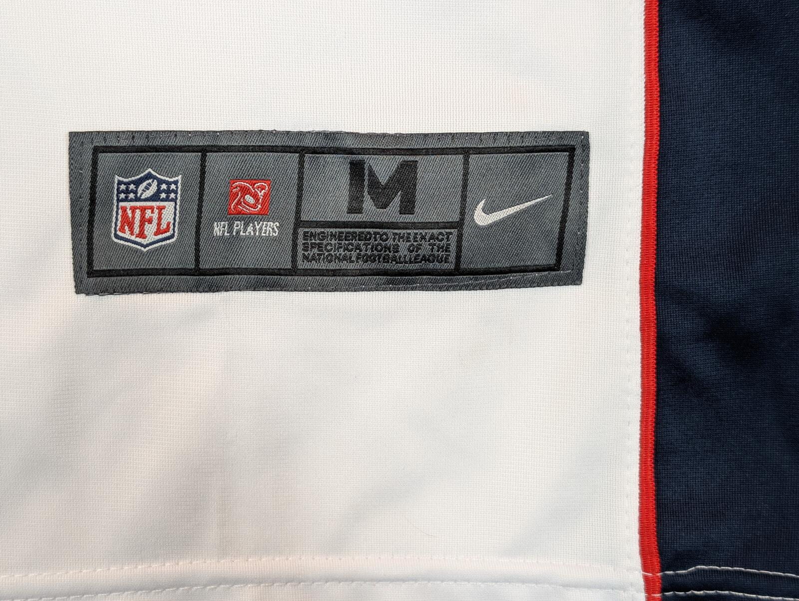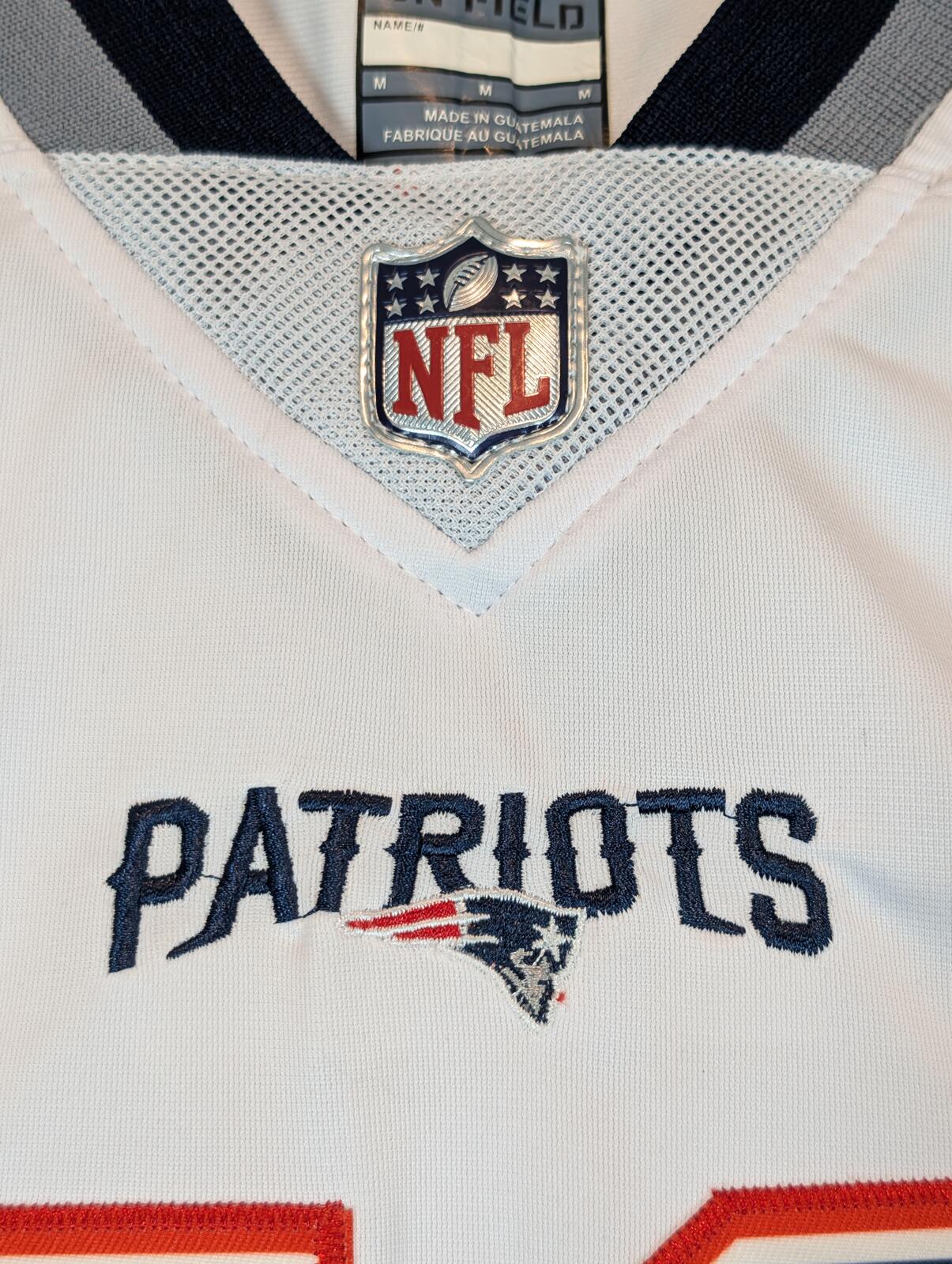 This is a non-authentic Nike On Field New England Patriots Julian Edelman #11 football jersey in white. New With Tags men’s size medium with screen printed graphics, mesh athletic fabric, and classic NFL fanwear style.