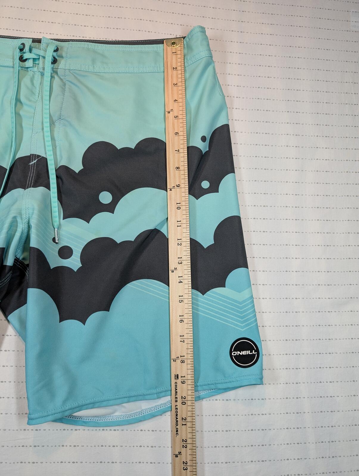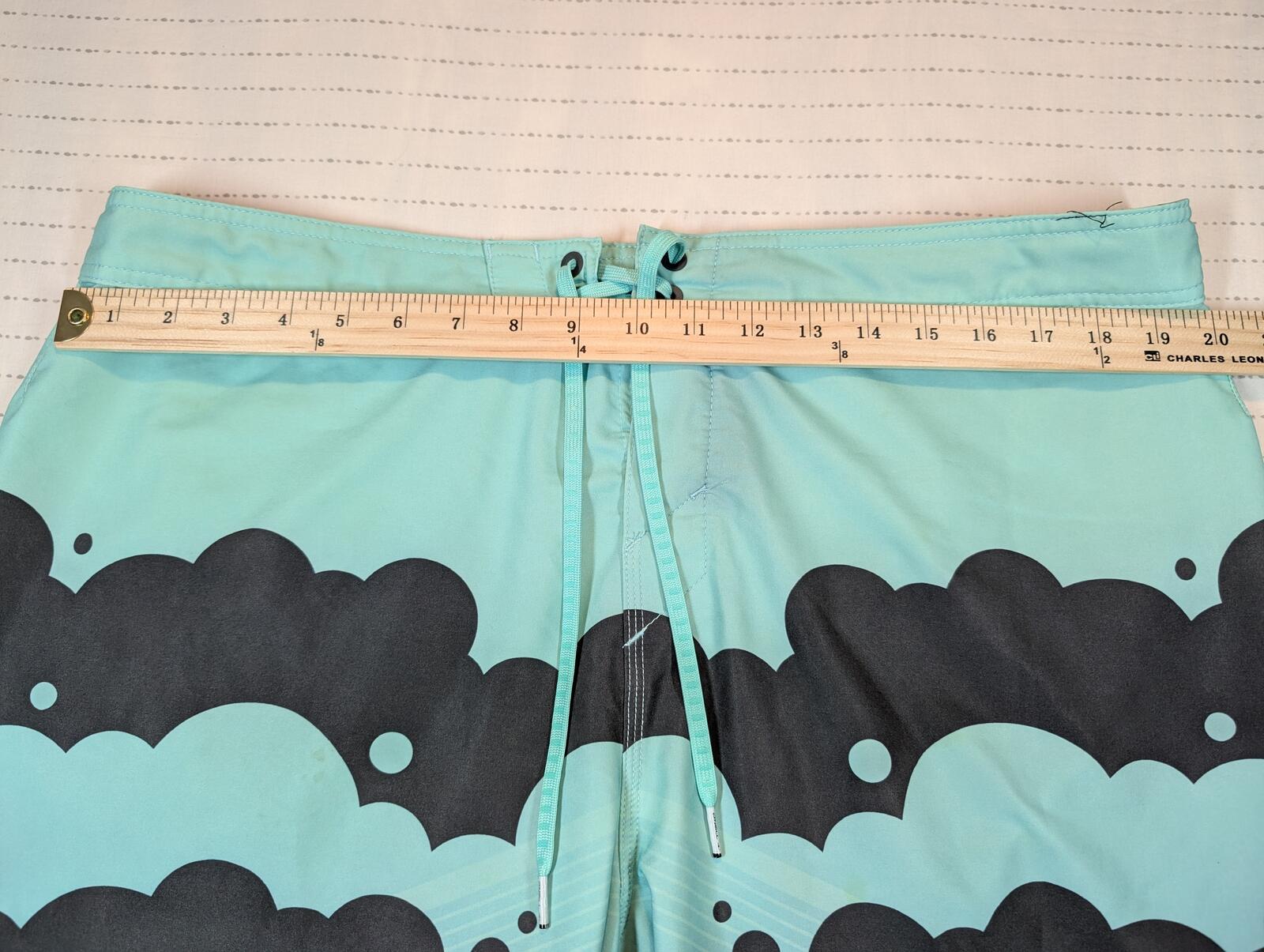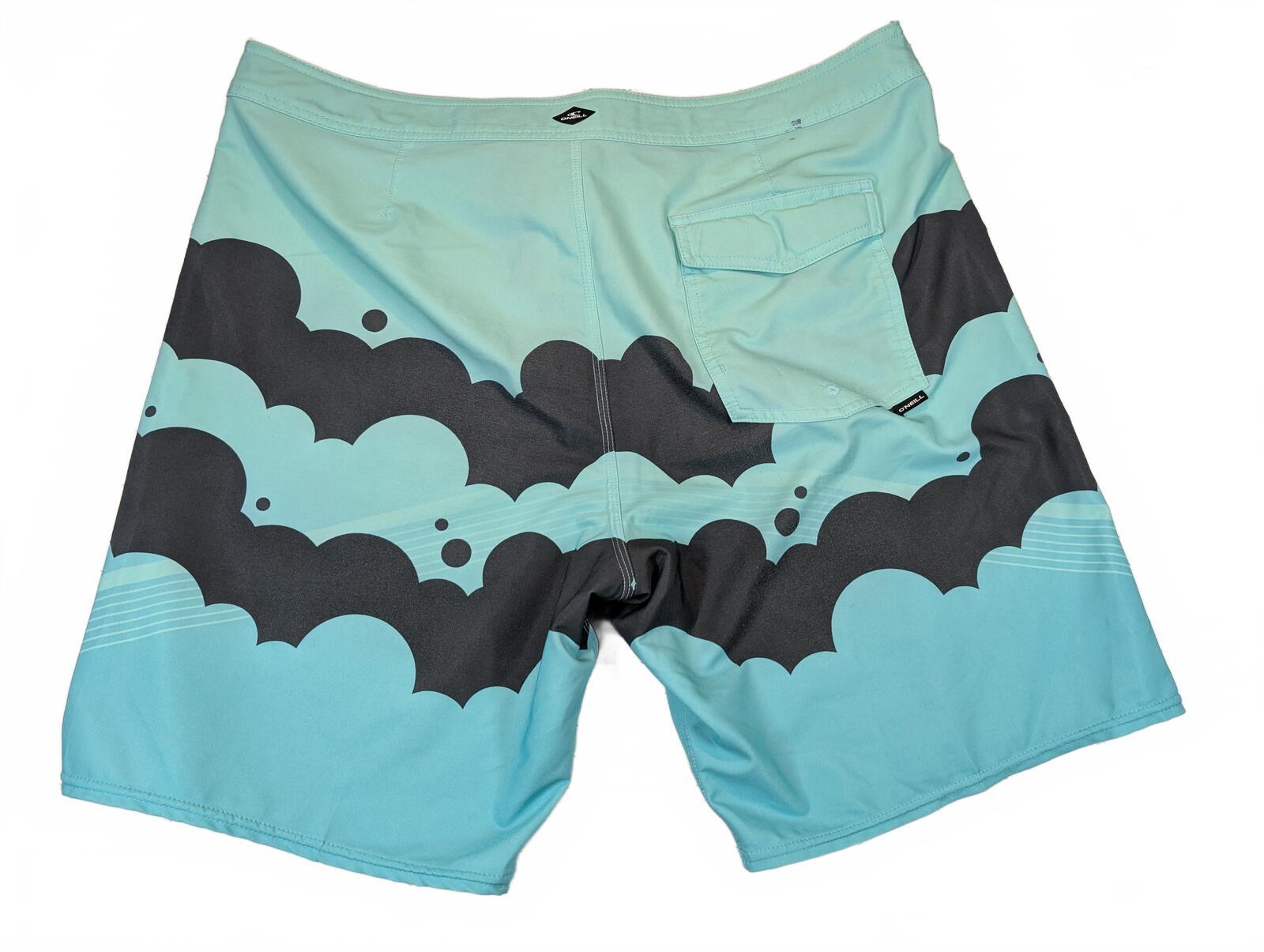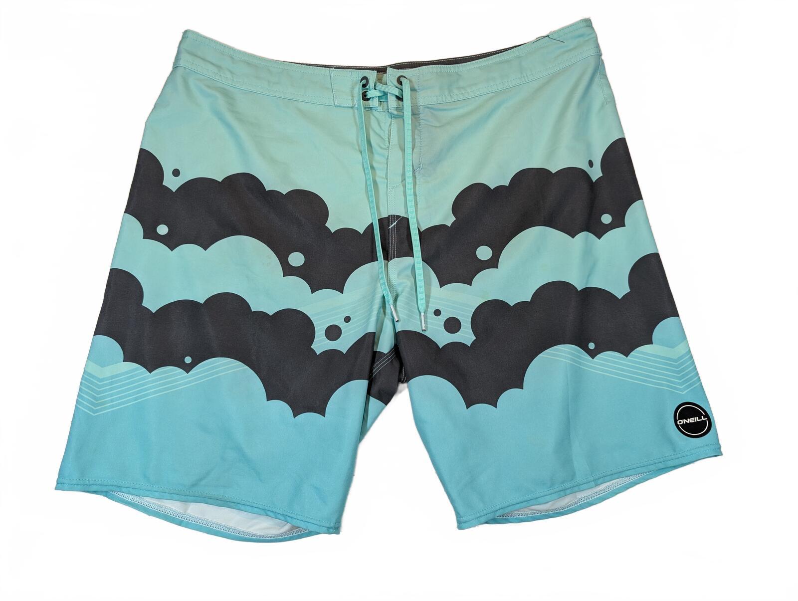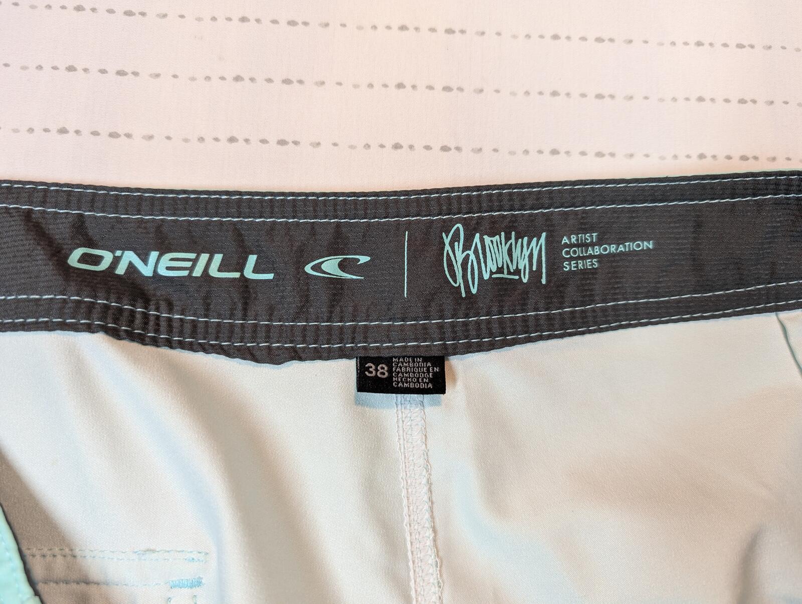 These are O’Neill Shaun artist collaboration series boardshorts in a stretch surf swim style, tagged size 38. Graphic print design with drawstring waist and a rear pocket. Minor wear and small marks shown in photos.