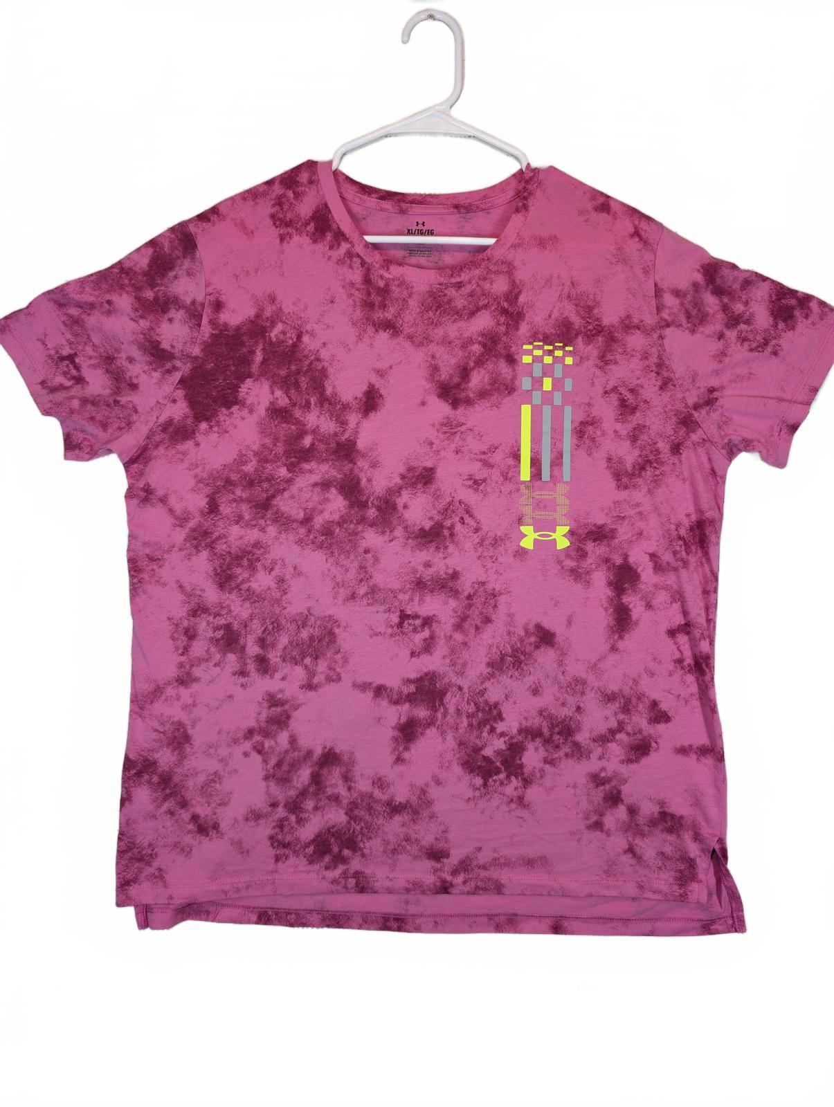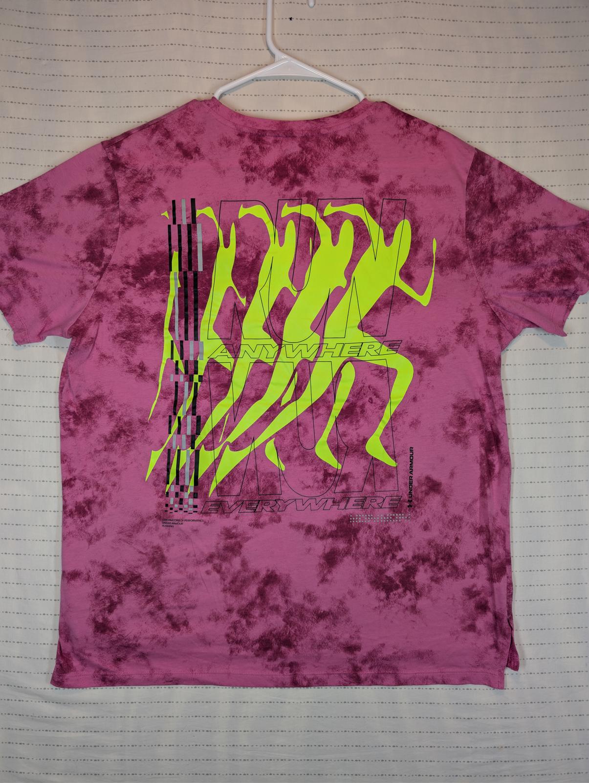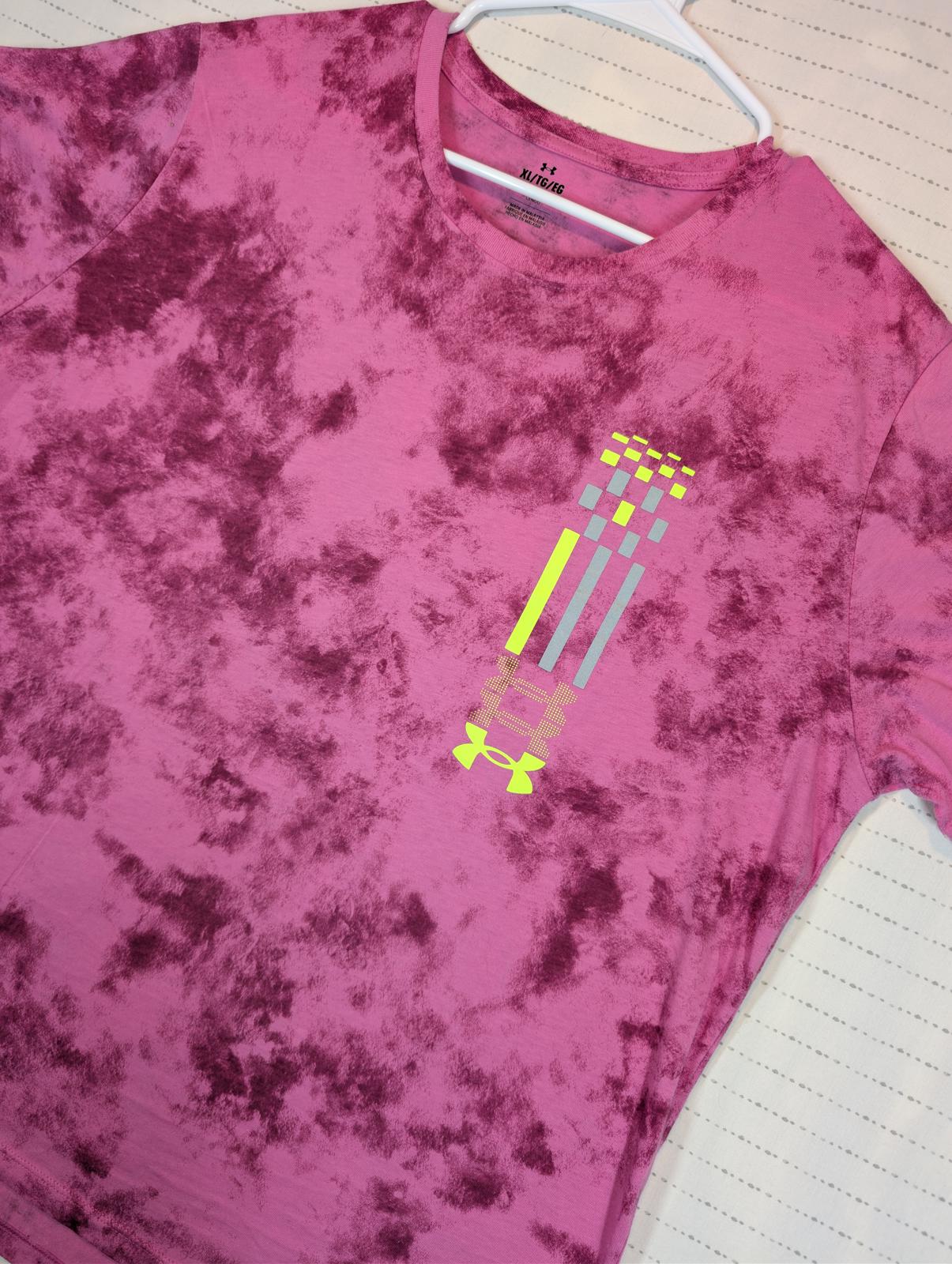 Under Armour HeatGear fitted tie dye T shirt in vibrant pink with marbled wash pattern and neon front chest logo graphic. Lightweight performance fabric designed for breathability and comfort during workouts, training, or casual athleisure wear. Features a slim fitted cut with curved hem and bold back graphic that reads “Run Anywhere Run Everywhere” for standout athletic style.