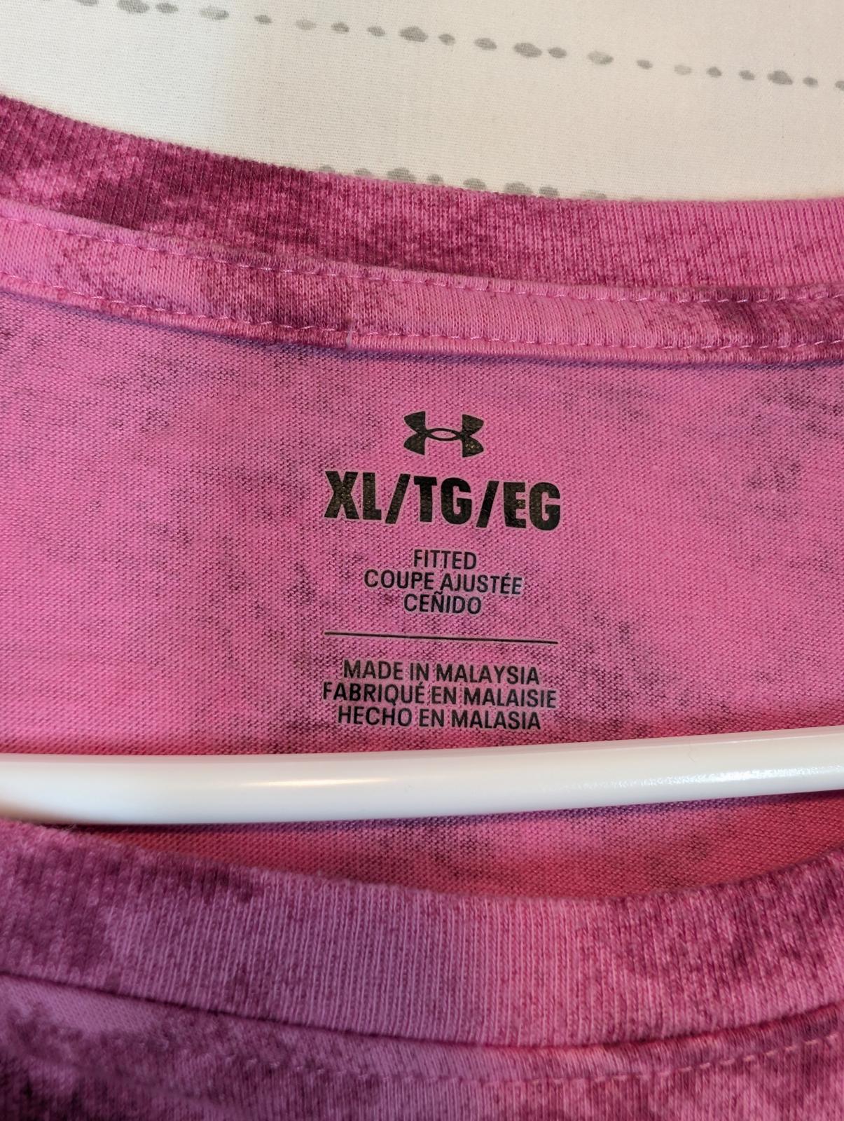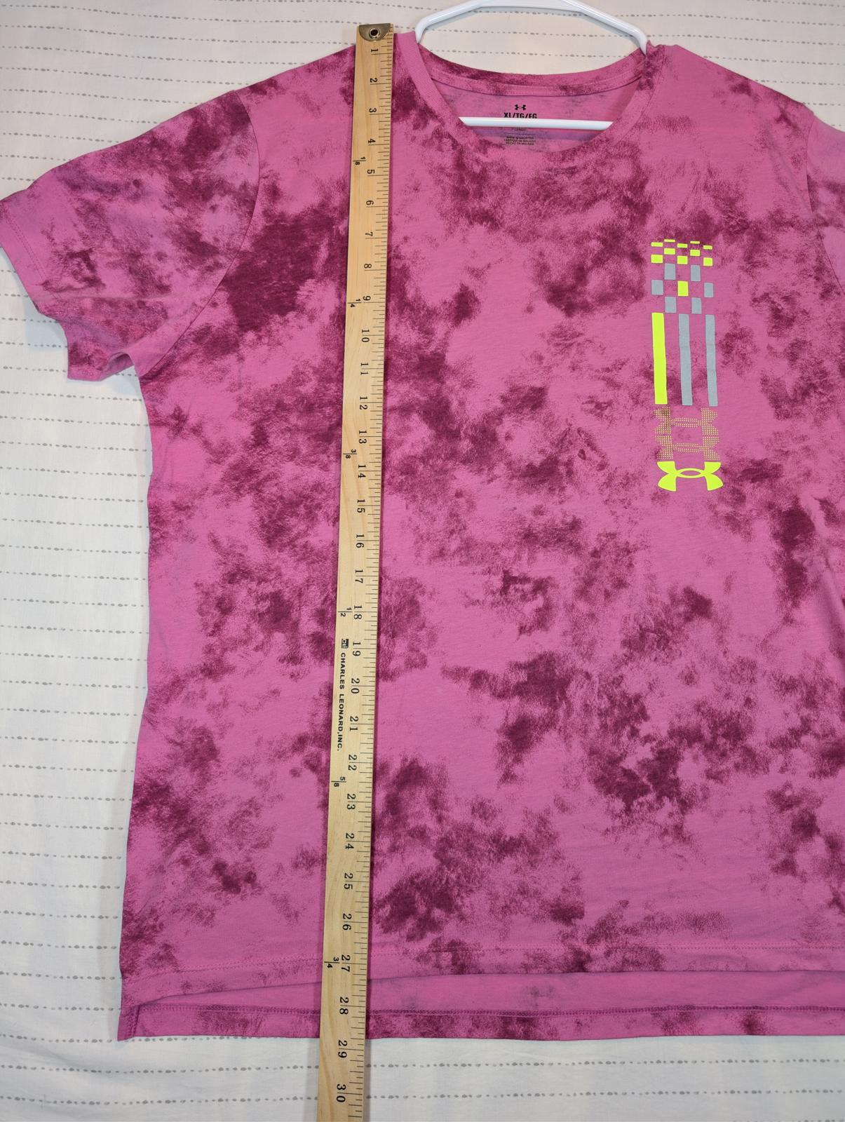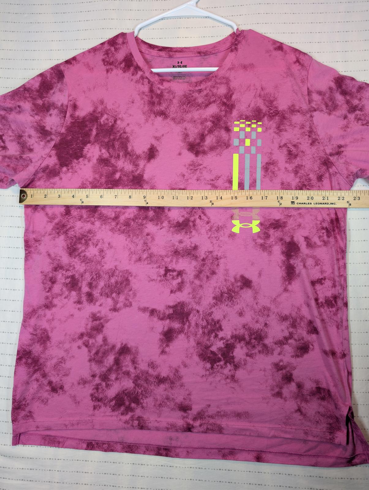 Under Armour HeatGear fitted tie dye T shirt in vibrant pink with marbled wash pattern and neon front chest logo graphic. Lightweight performance fabric designed for breathability and comfort during workouts, training, or casual athleisure wear. Features a slim fitted cut with curved hem and bold back graphic that reads “Run Anywhere Run Everywhere” for standout athletic style.