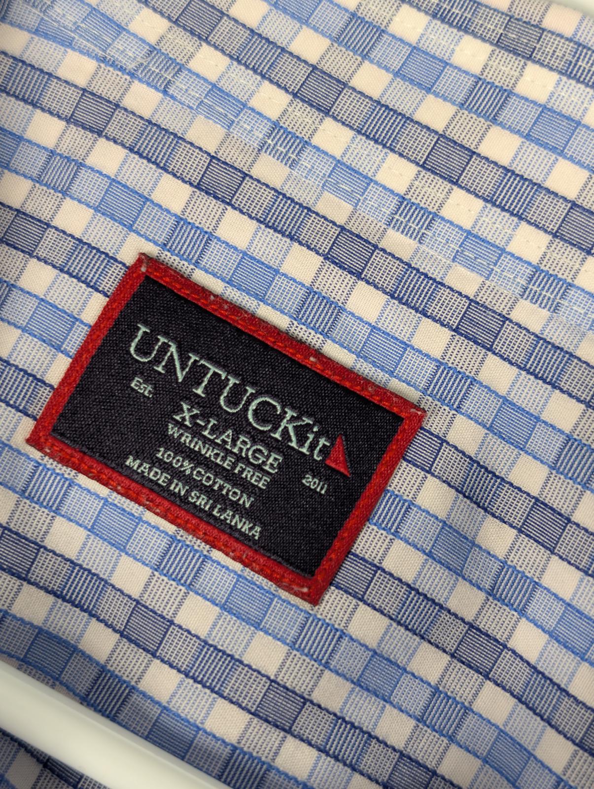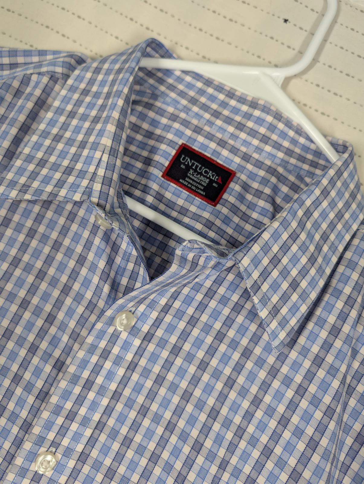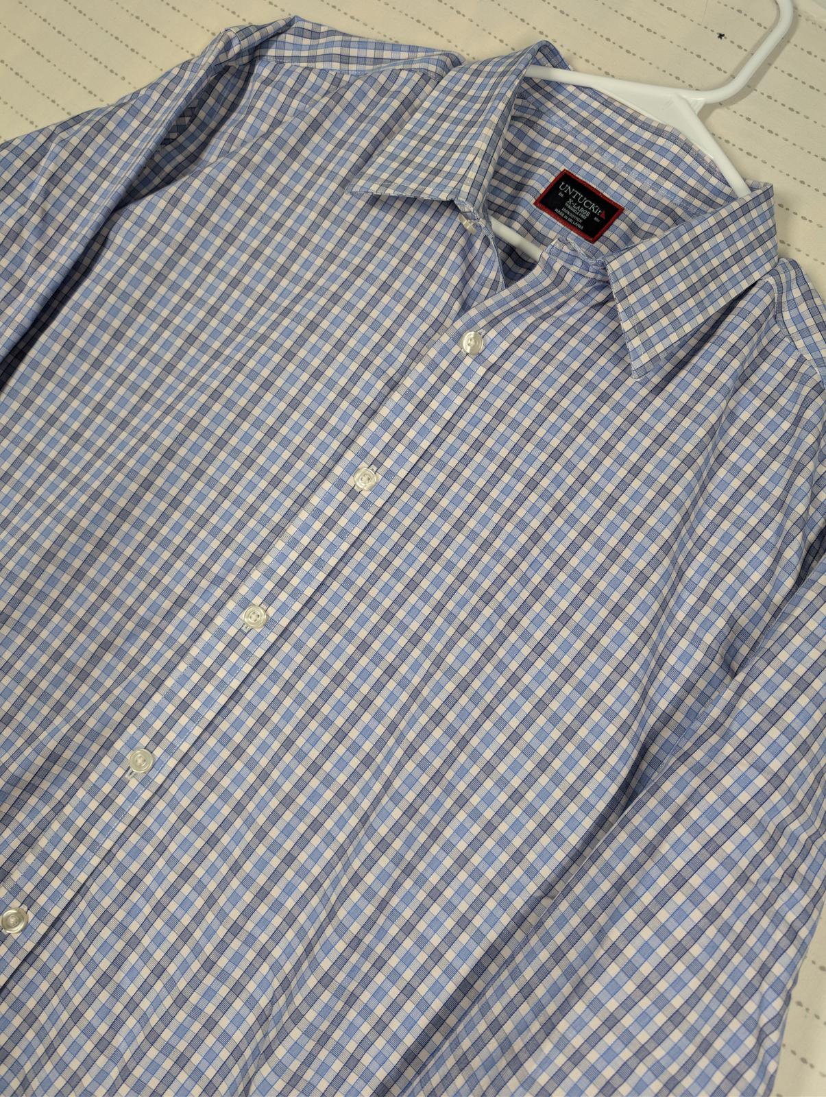 This Untuckit long sleeve button down shirt features a blue and white check pattern with a tailored untucked length. Made from 100% cotton, it is labeled wrinkle free and designed for a clean look without tucking in. Classic point collar, button cuffs, and curved hem make it suitable for business casual, office wear, or everyday use. Size XL.