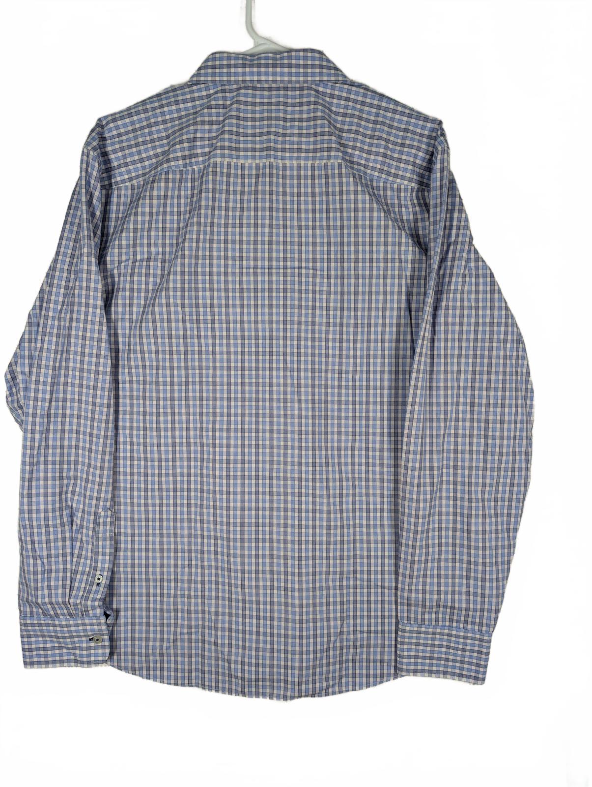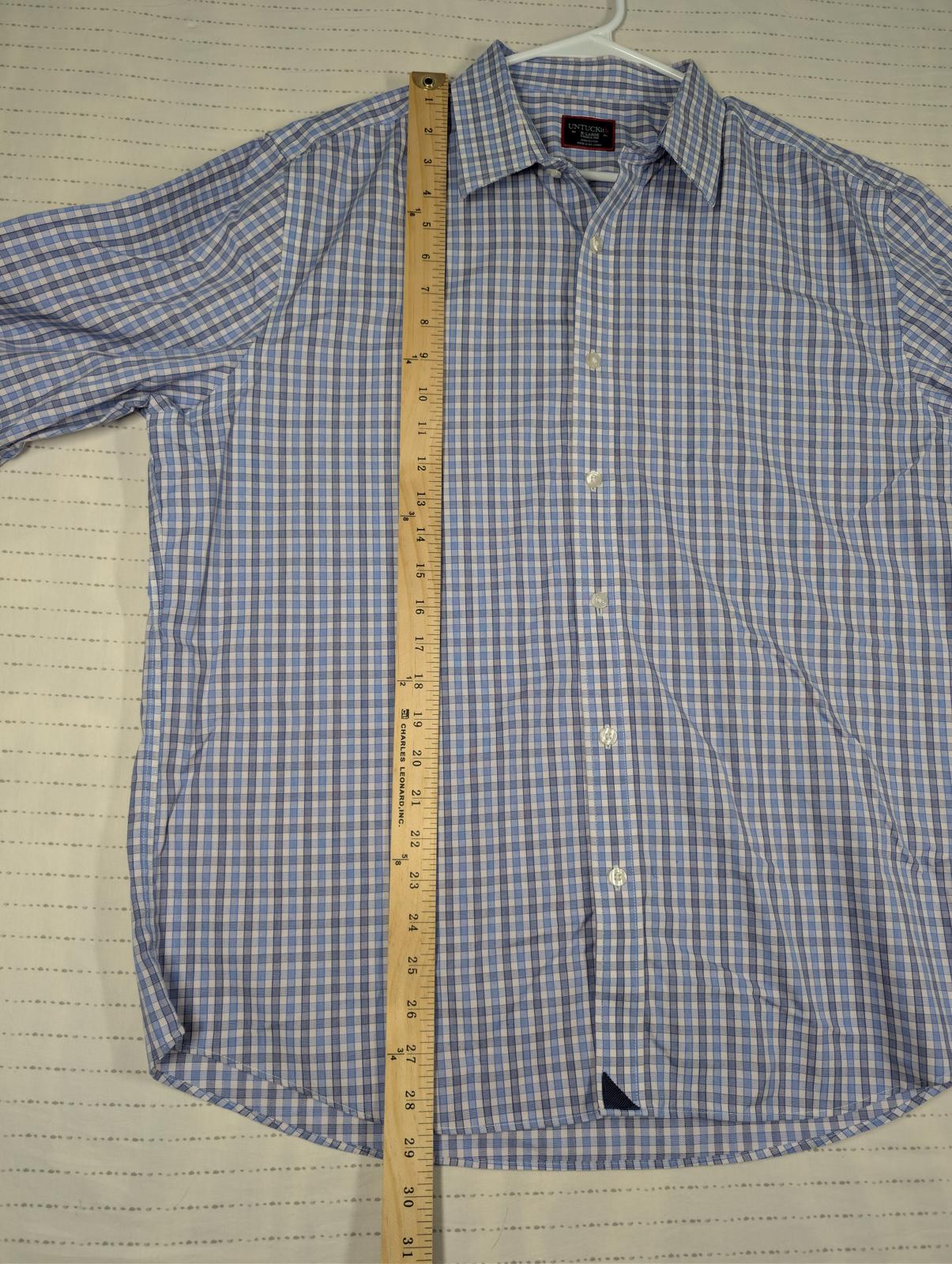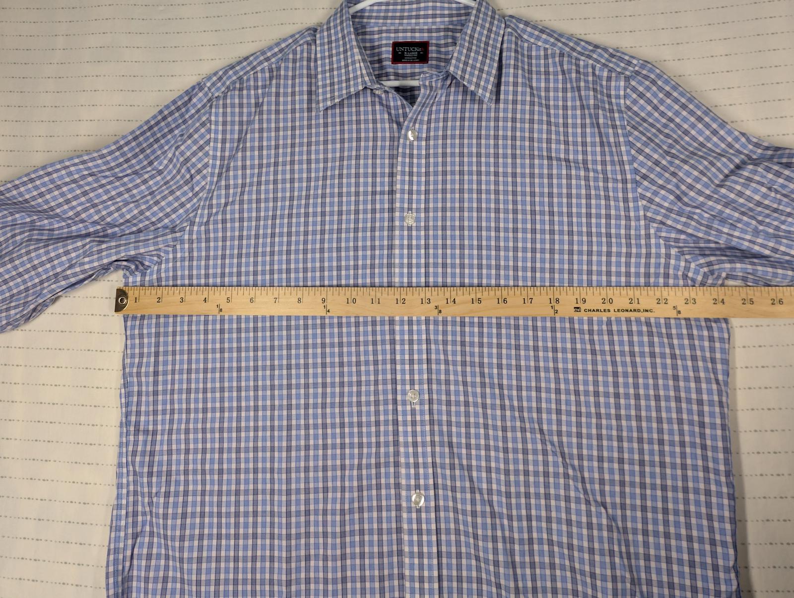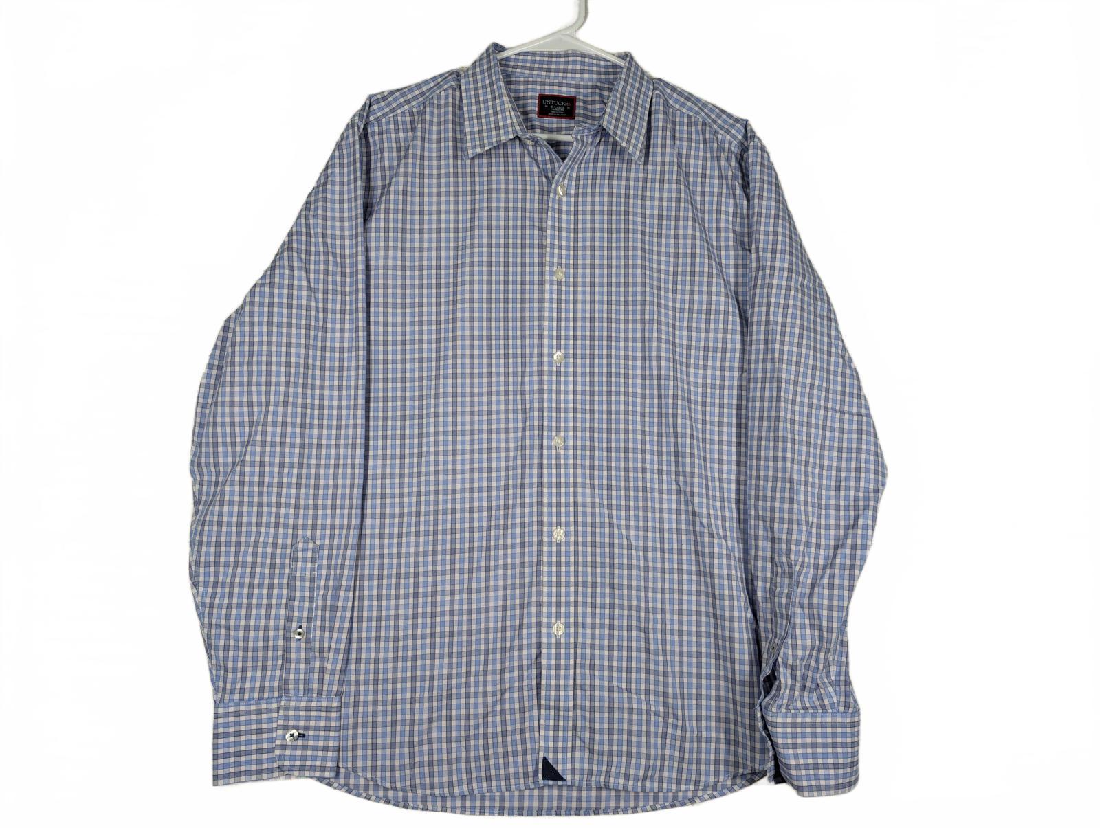 This Untuckit long sleeve button down shirt features a blue and white check pattern with a tailored untucked length. Made from 100% cotton, it is labeled wrinkle free and designed for a clean look without tucking in. Classic point collar, button cuffs, and curved hem make it suitable for business casual, office wear, or everyday use. Size XL.