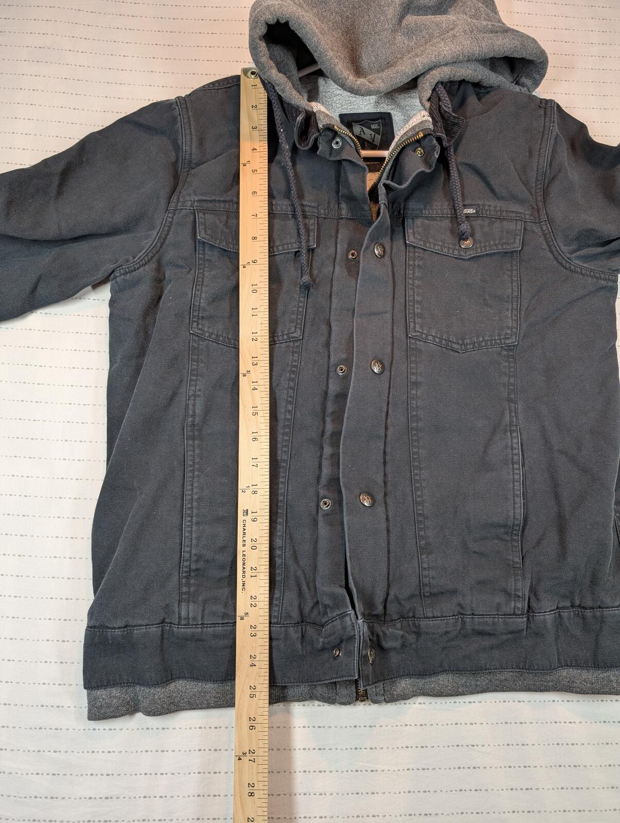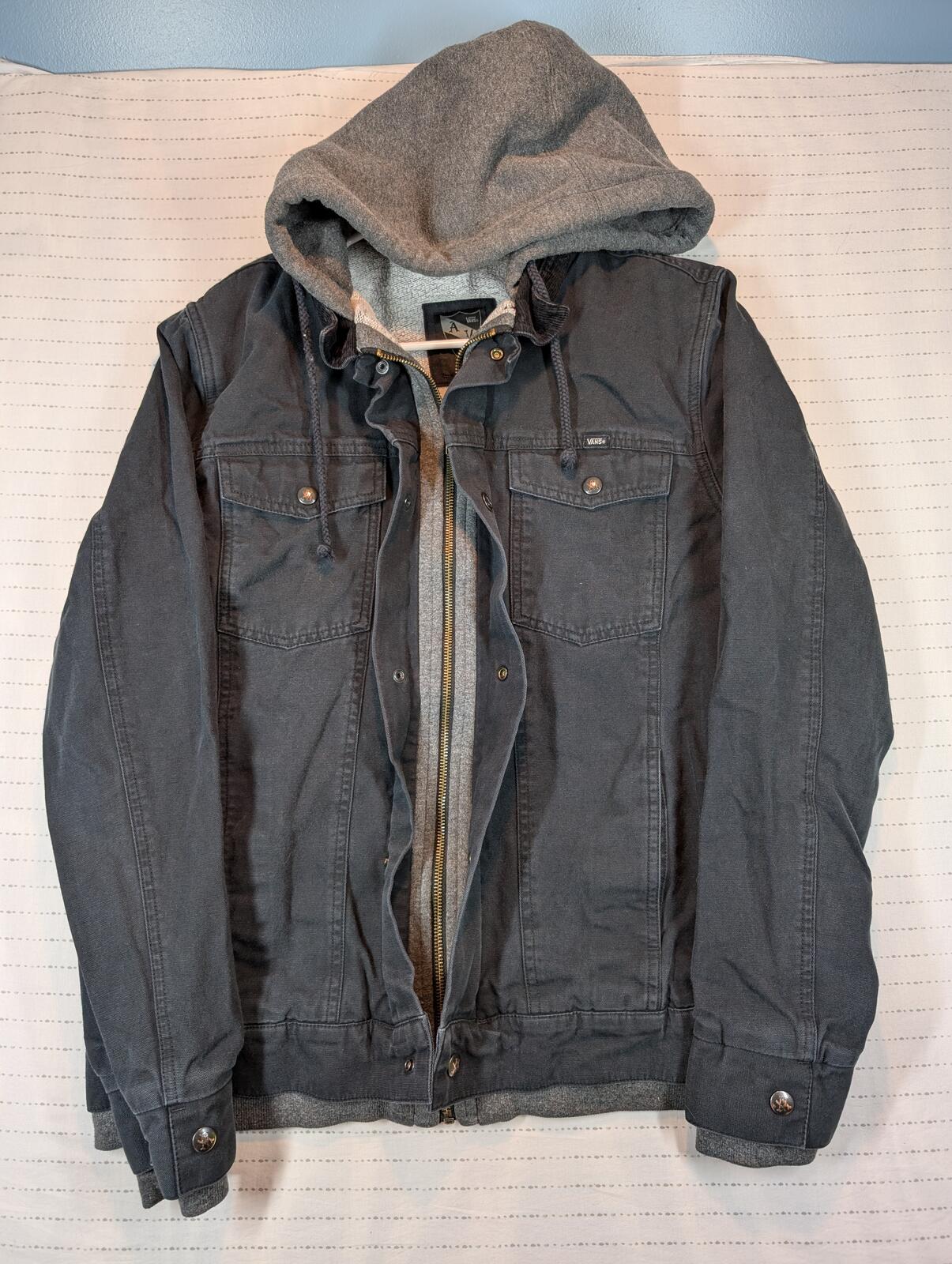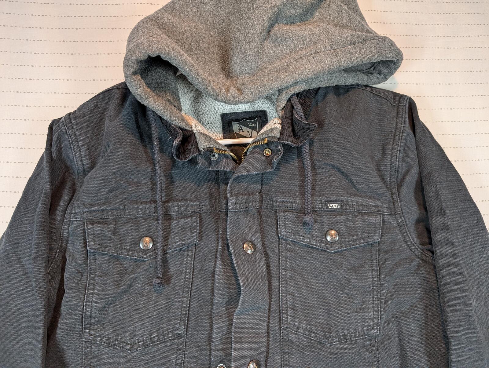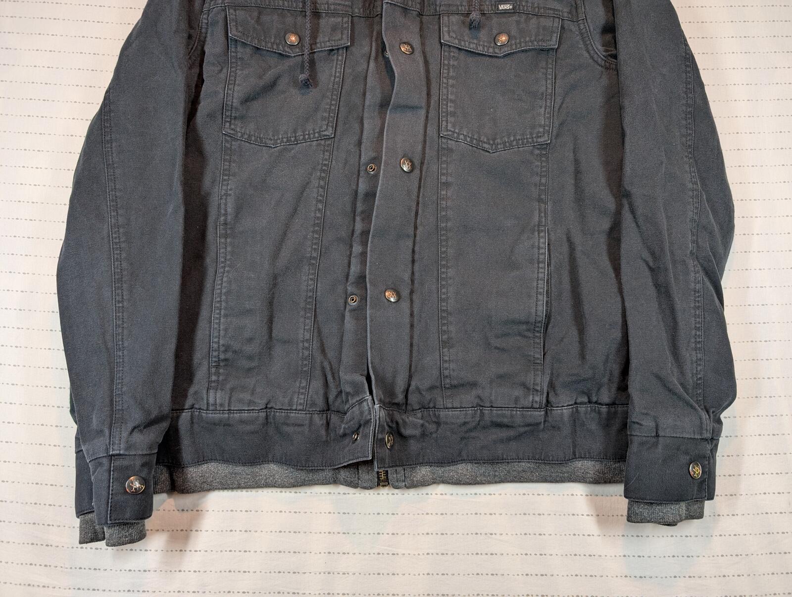 This is a Vans AV hooded trucker jacket with snap chest pockets, zip and snap front, and a warm fleece-lined hood. Great layered outerwear with skate, workwear, and casual streetwear style.