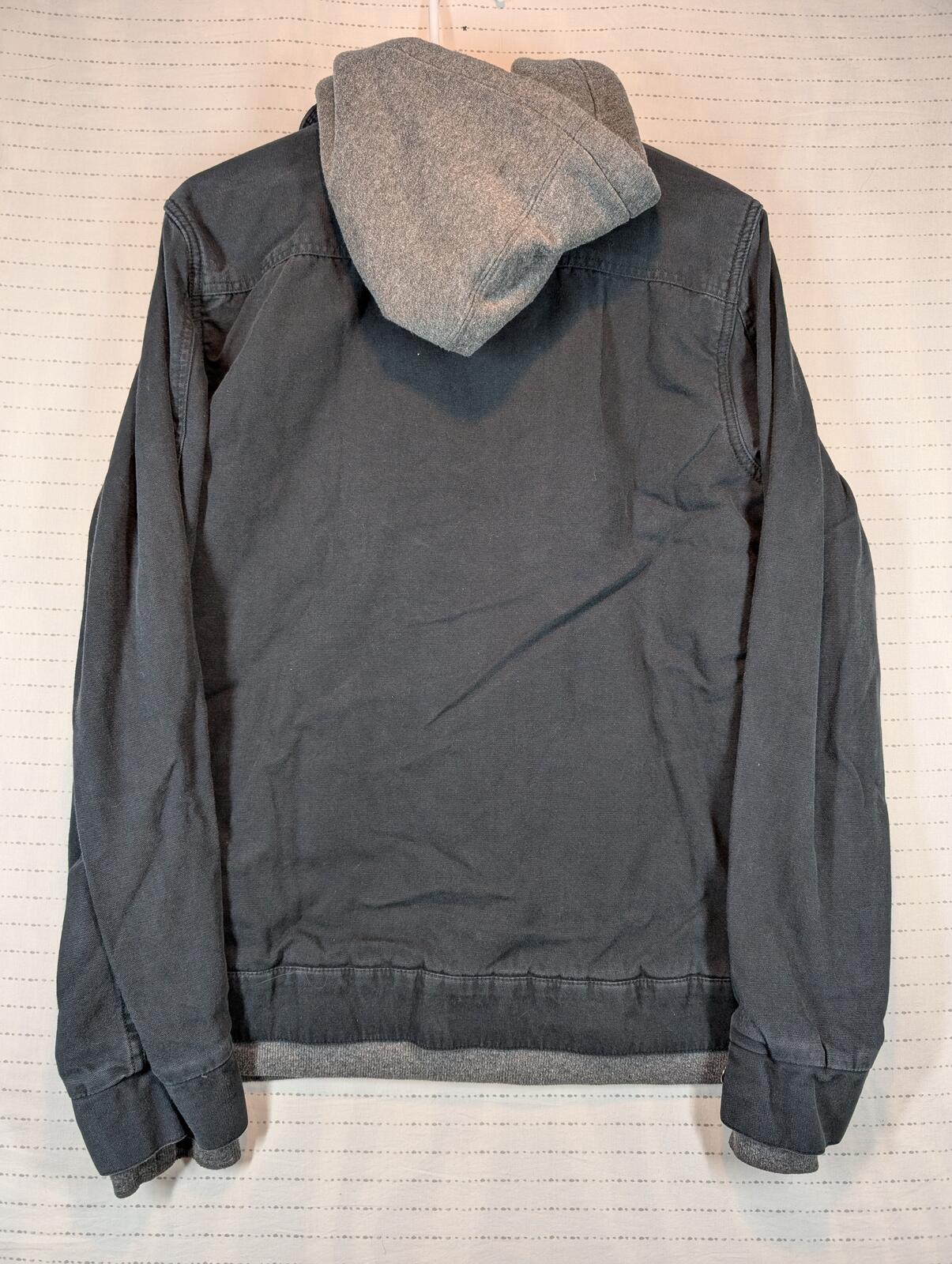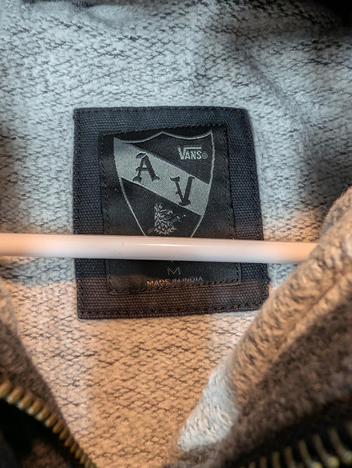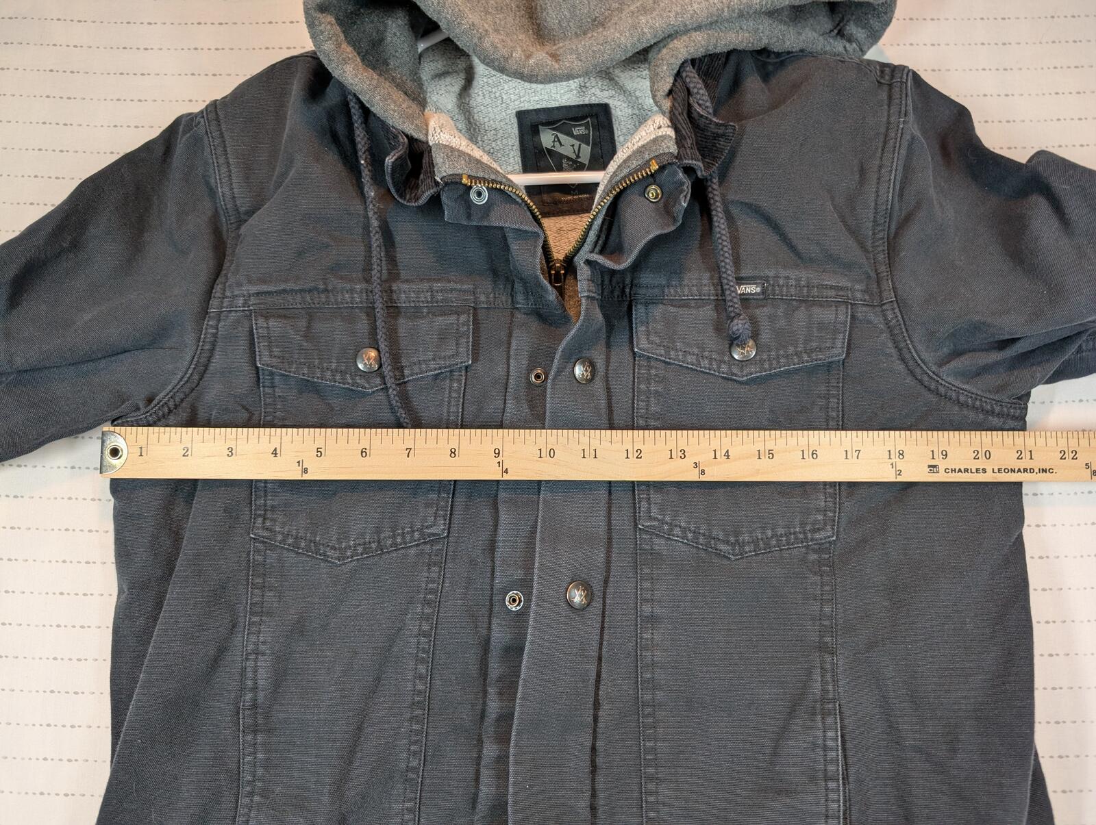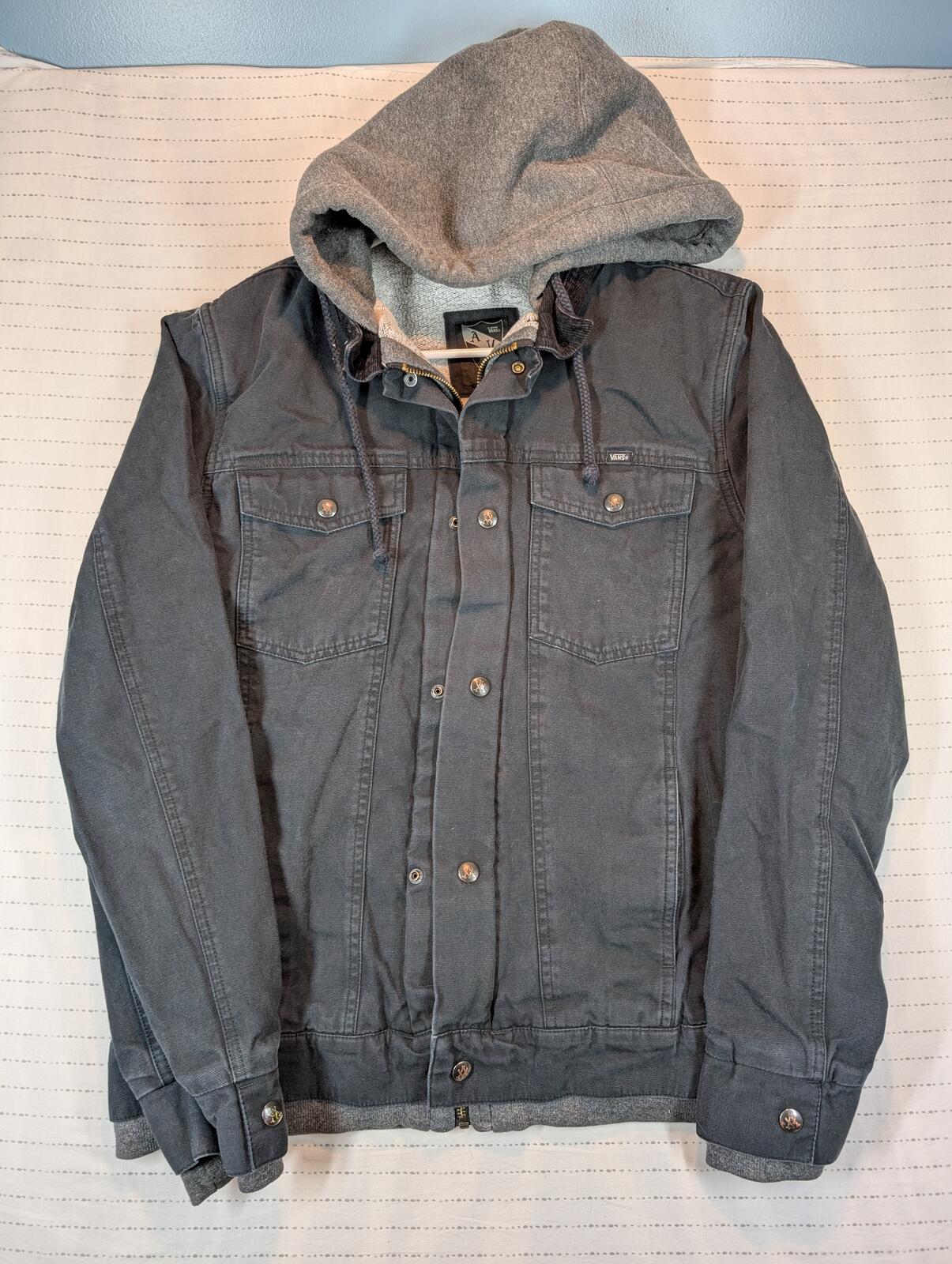 This is a Vans AV hooded trucker jacket with snap chest pockets, zip and snap front, and a warm fleece-lined hood. Great layered outerwear with skate, workwear, and casual streetwear style.